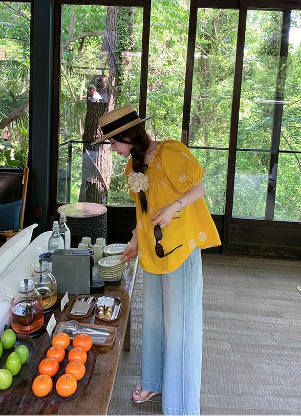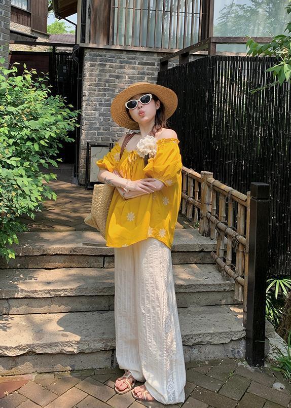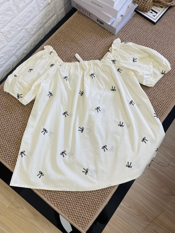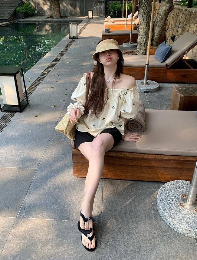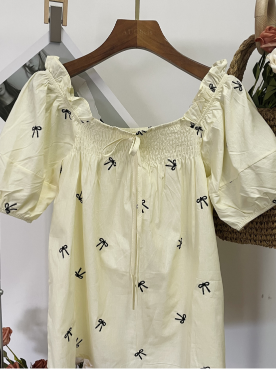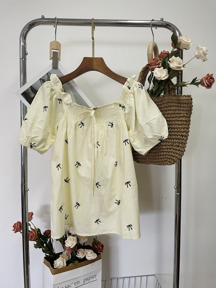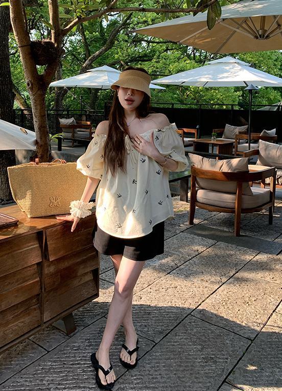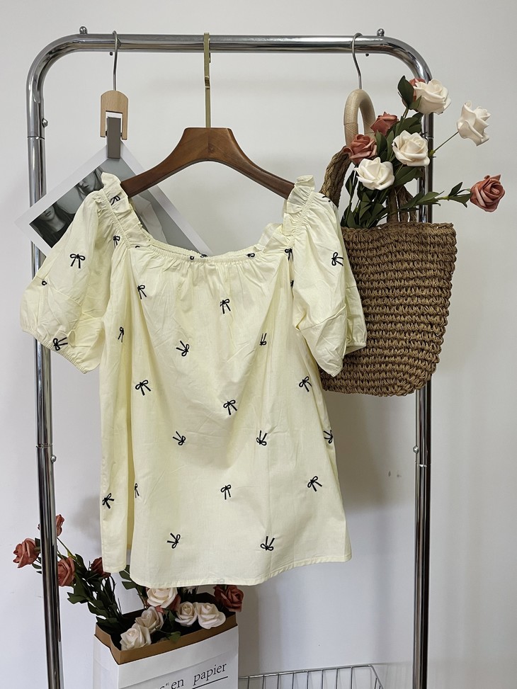 第三款:“甜茶奶芙”夏季一字领泡泡短袖刺绣娃娃小衫ACJY5338 杏色温婉有气质 精致的立体刺绣 非常有法式的浪漫和温柔 下身随意搭配各种牛仔、阔腿裤 拿捏随性慵懒范儿~ 百分百棉的成分,赋予温柔舒适的穿感