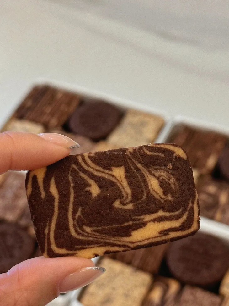 大理石曲奇!颜值与美味并存,黑白交错的纹理就像艺术品,每一口都是惊喜,奶香与可可的完美结合,很难不爱,拍照也很出片哦~