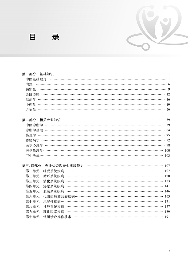第一部分 基础知识 中医基础理论 内经 伤寒论 金匮要略 温病学 中药学 方剂学 第二部分 相关专业知识 中医诊断学 诊断学基础 药理学 传染病学 医学心理学 医学伦理学 卫生法规 第三、四部分 专业知识和专业实践能力 第一单元 呼吸系统疾病 第二单元 循环系统疾病 第三单元 消化系统疾病 第四单元 泌尿系统疾病 第五单元 血液系统疾病 第六单元 代谢疾病和营养疾病 第七单元 风湿性疾病 第八单元 神经系统疾病 第九单元 理化因素疾病 第十单元 常用诊疗操作技术