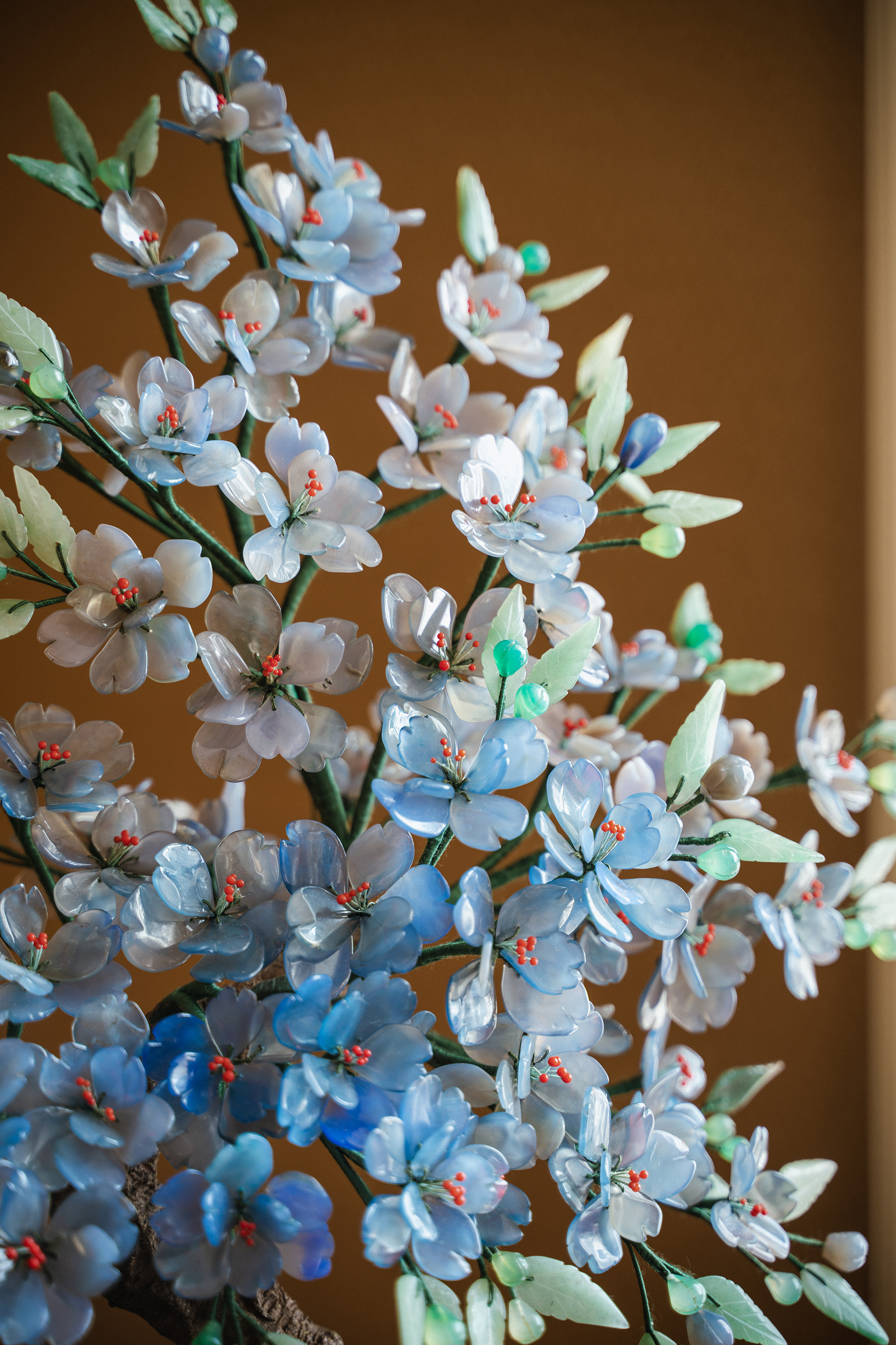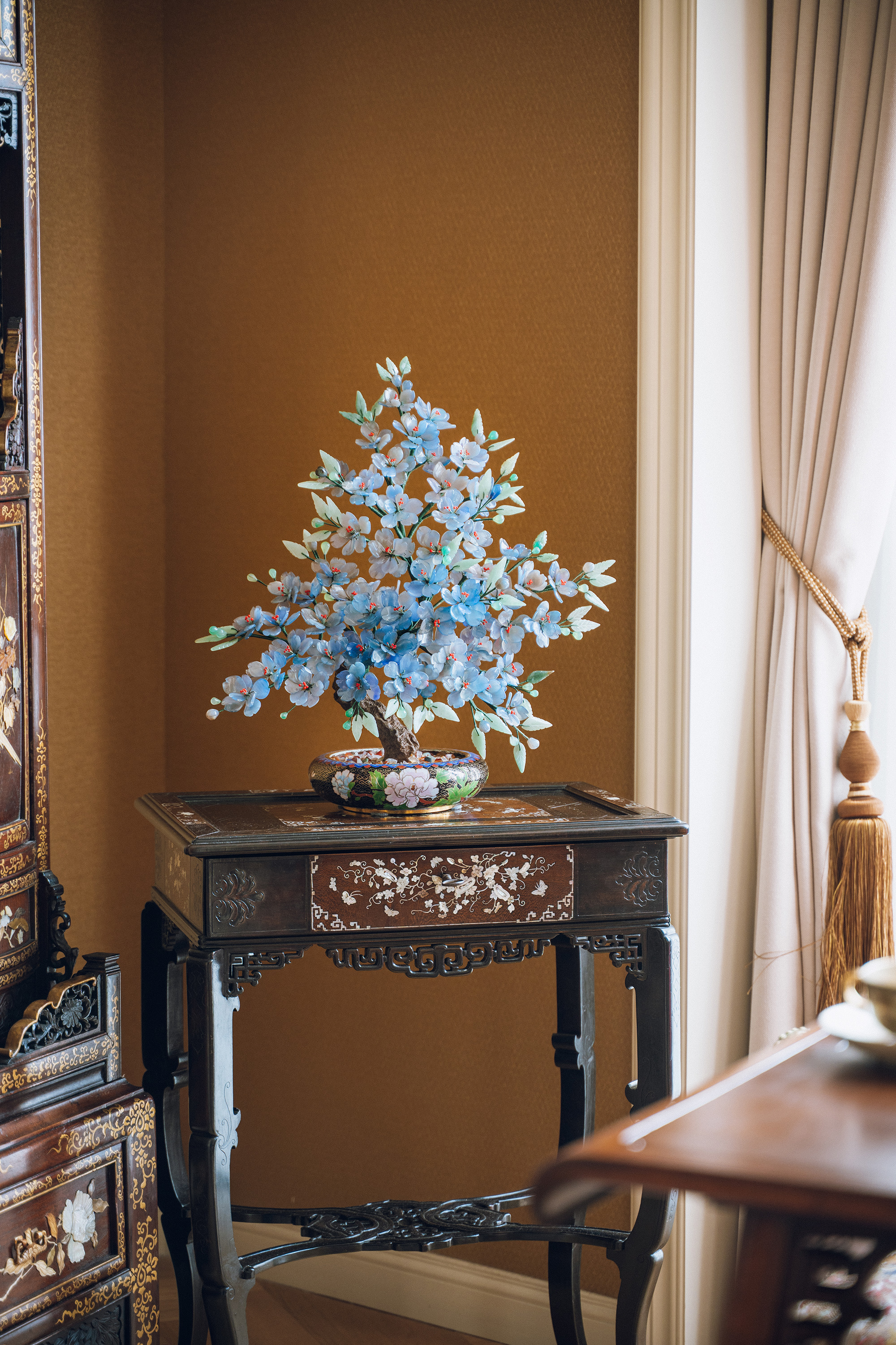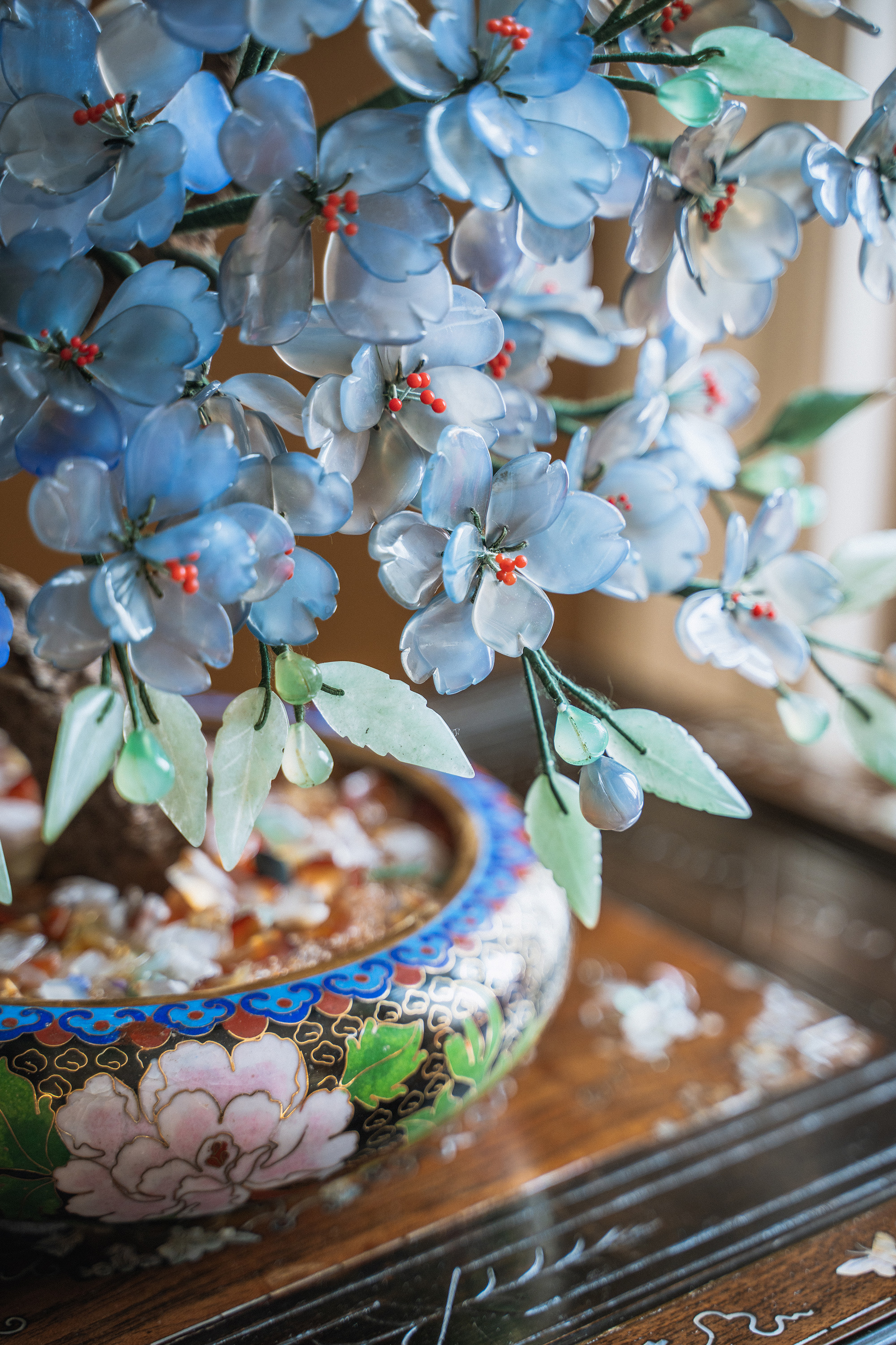 中国出品宝相花纹景泰蓝盆装饰「蓝韵碧桃」珍宝像生盆景