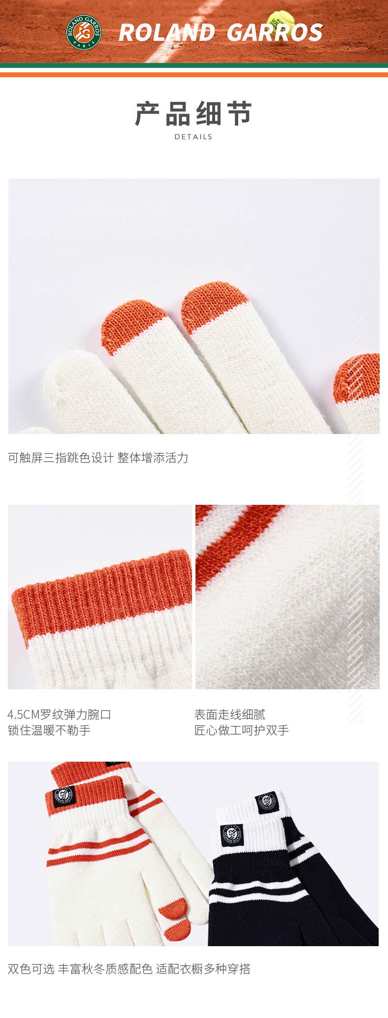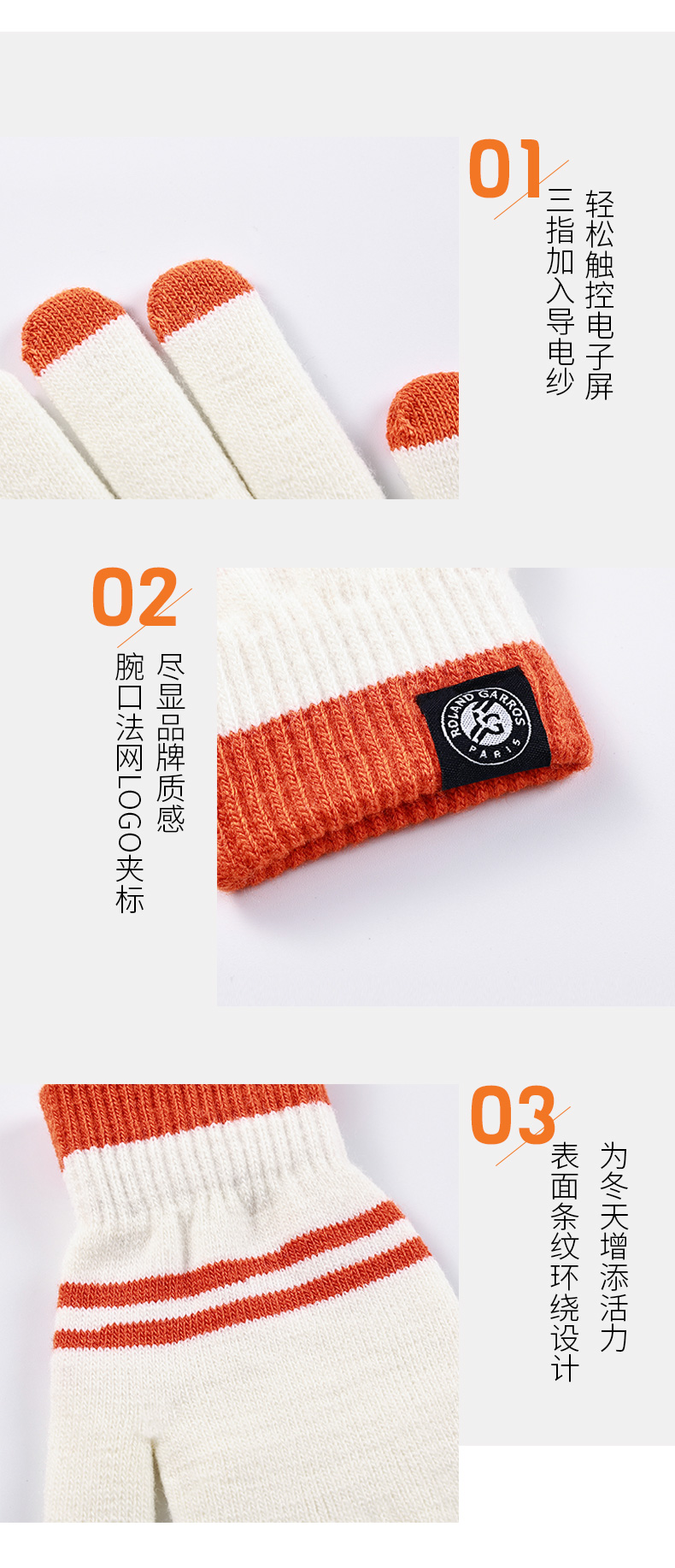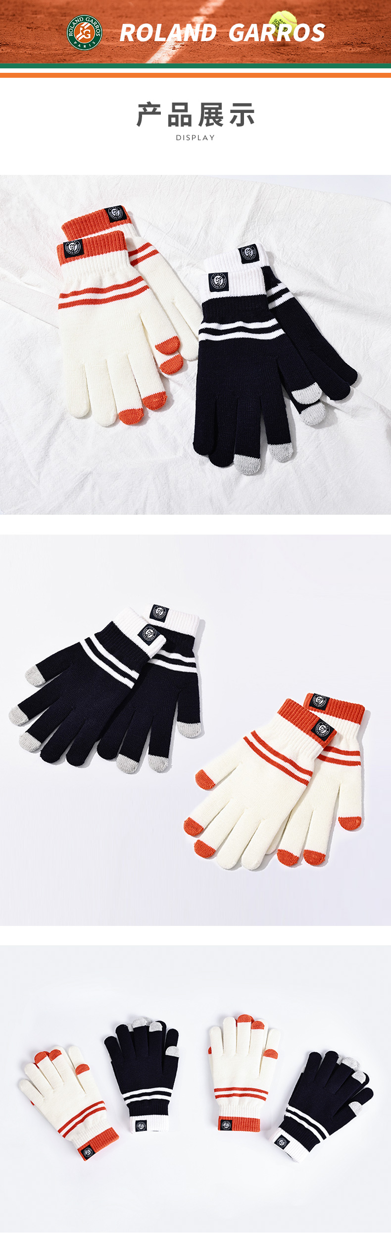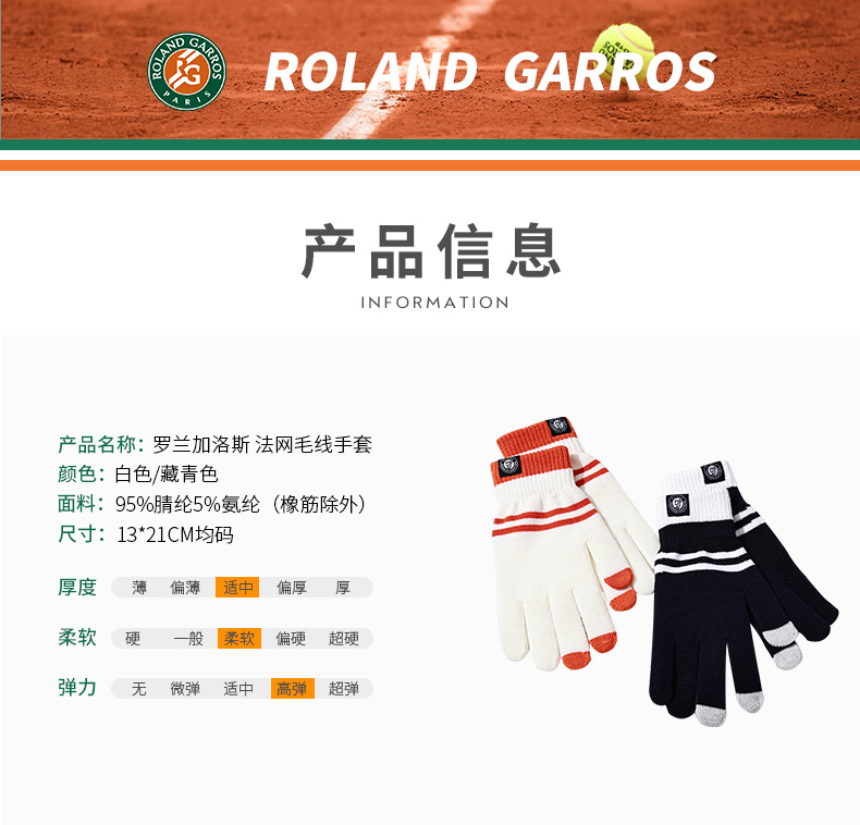 罗兰加洛斯法网手套冬季保暖触屏手套针织加厚法式复古情侣款