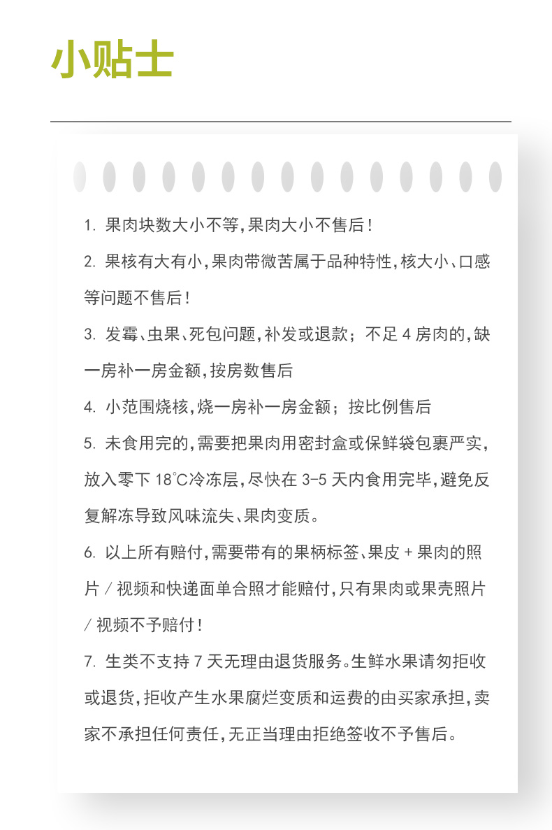 所有赔付,需要带有的果柄标签、果皮+果肉的照片/视频和快递面单合照才能赔付,只有果肉或果壳照片/视频不予赔付!