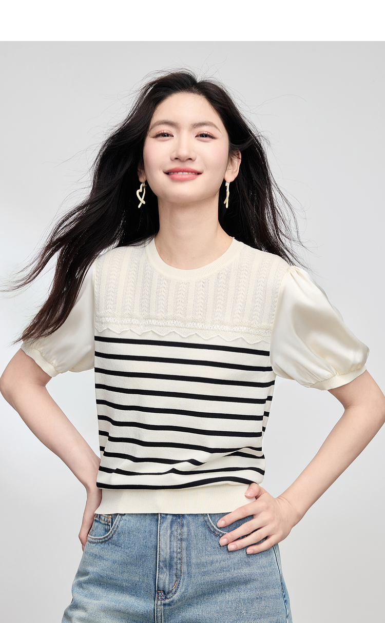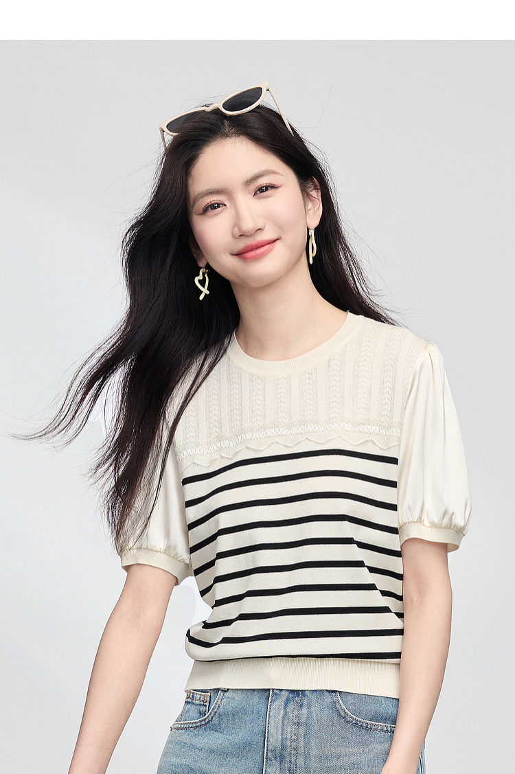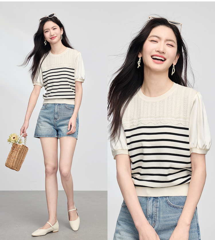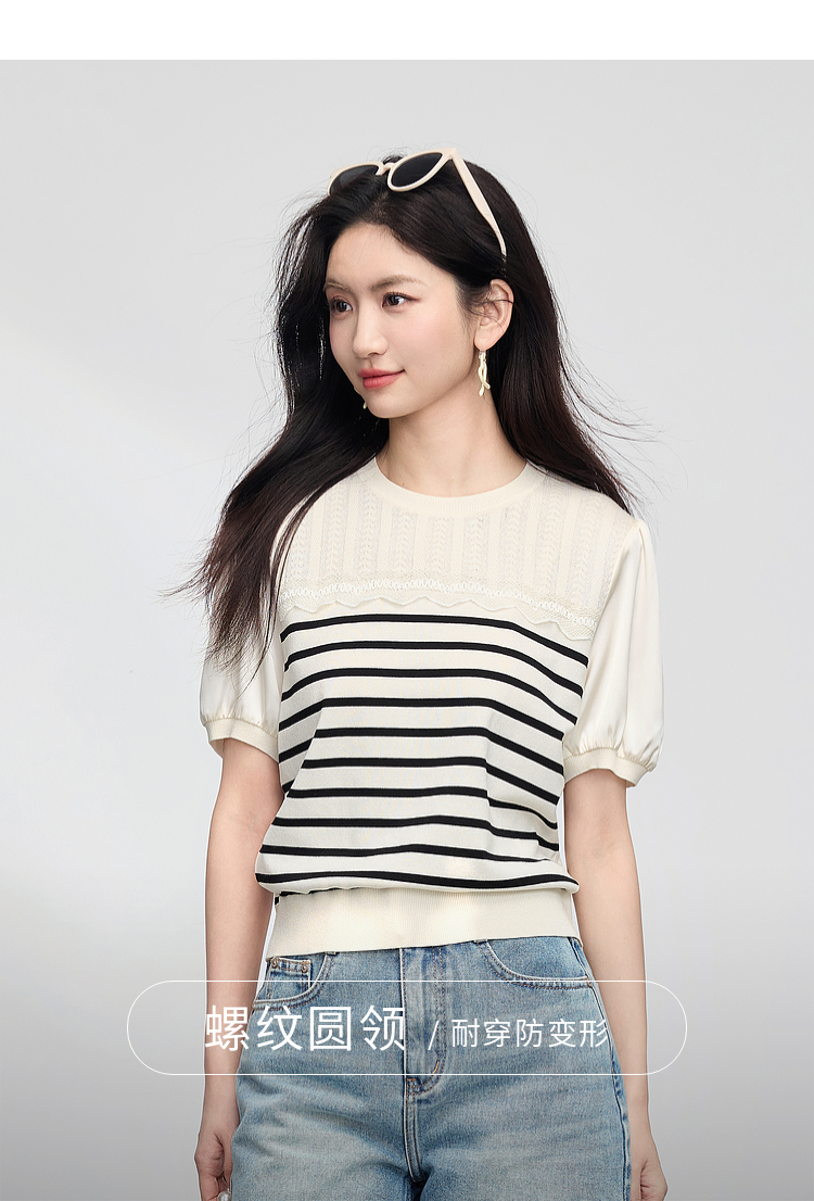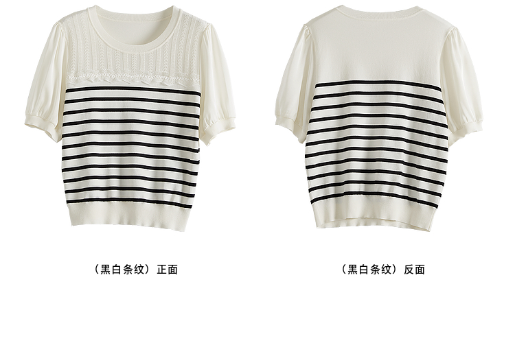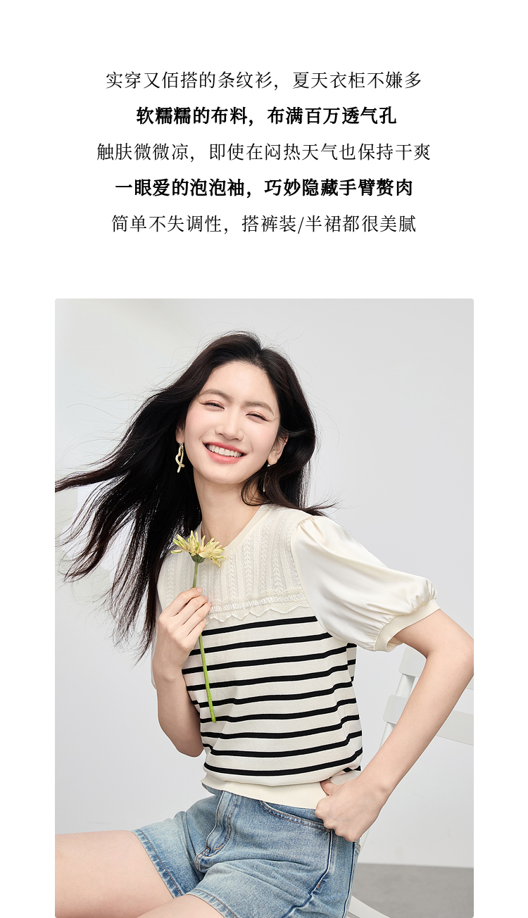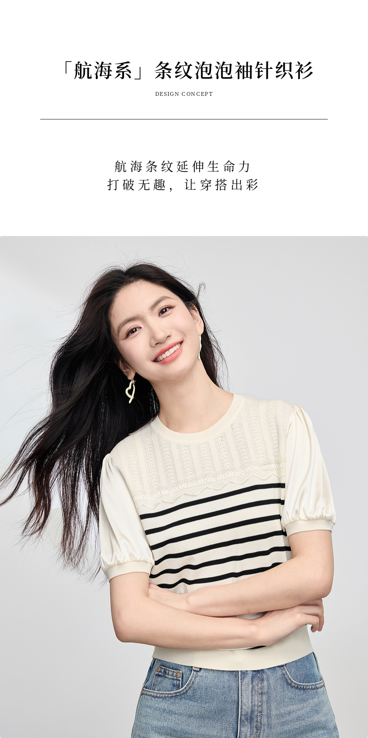 熙世界2025夏新款航海系黑白条纹针织衫女薄款休闲百搭泡泡袖上衣