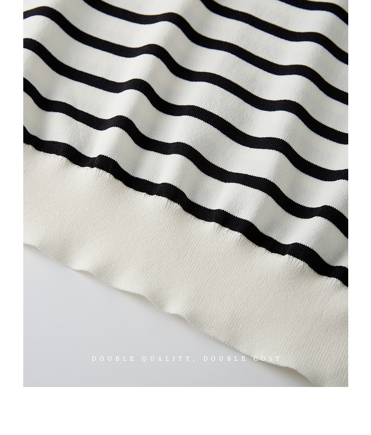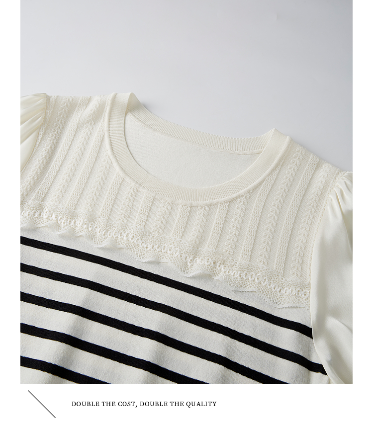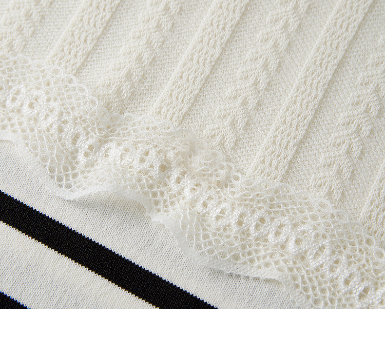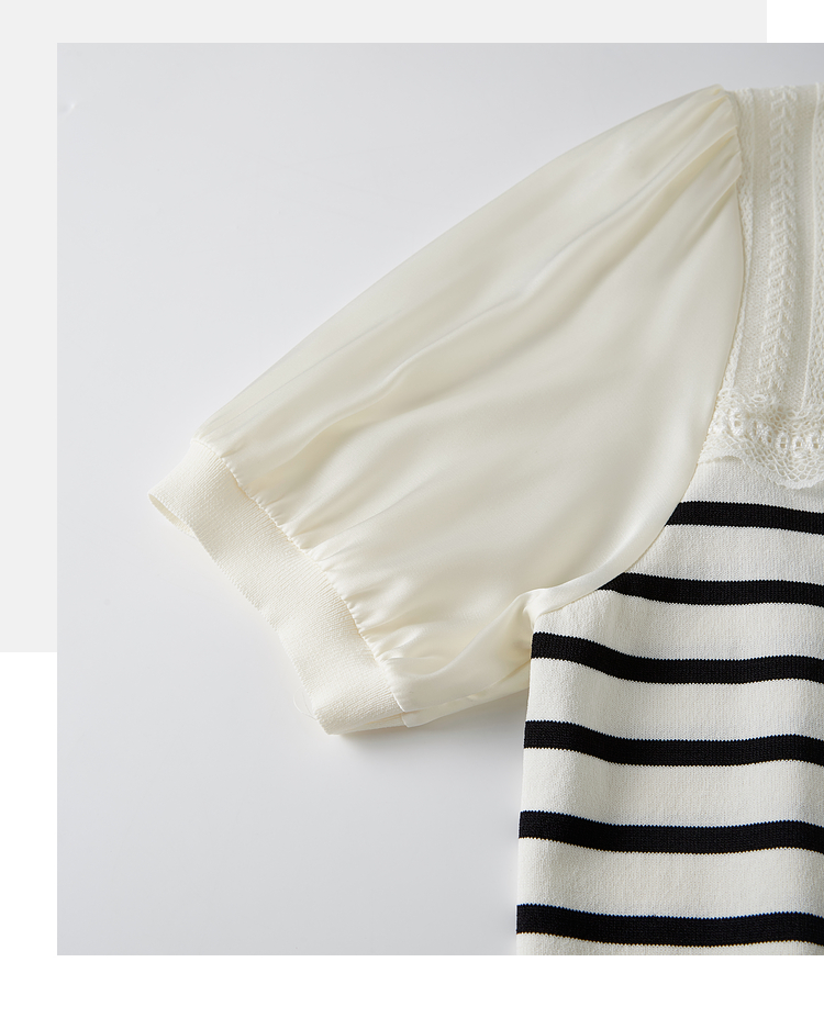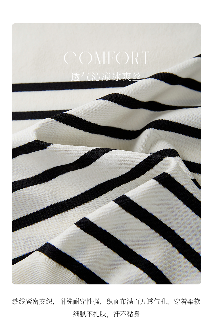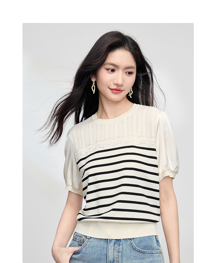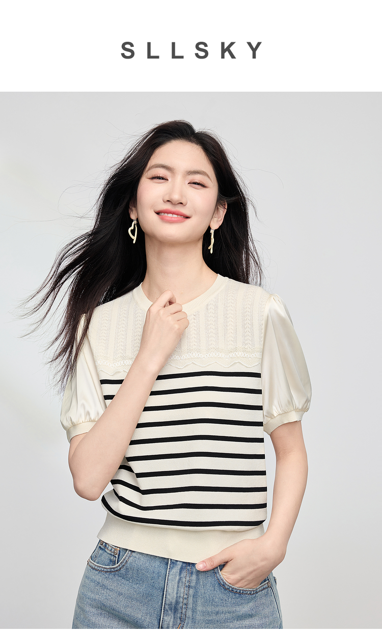 熙世界2025夏新款航海系黑白条纹针织衫女薄款休闲百搭泡泡袖上衣