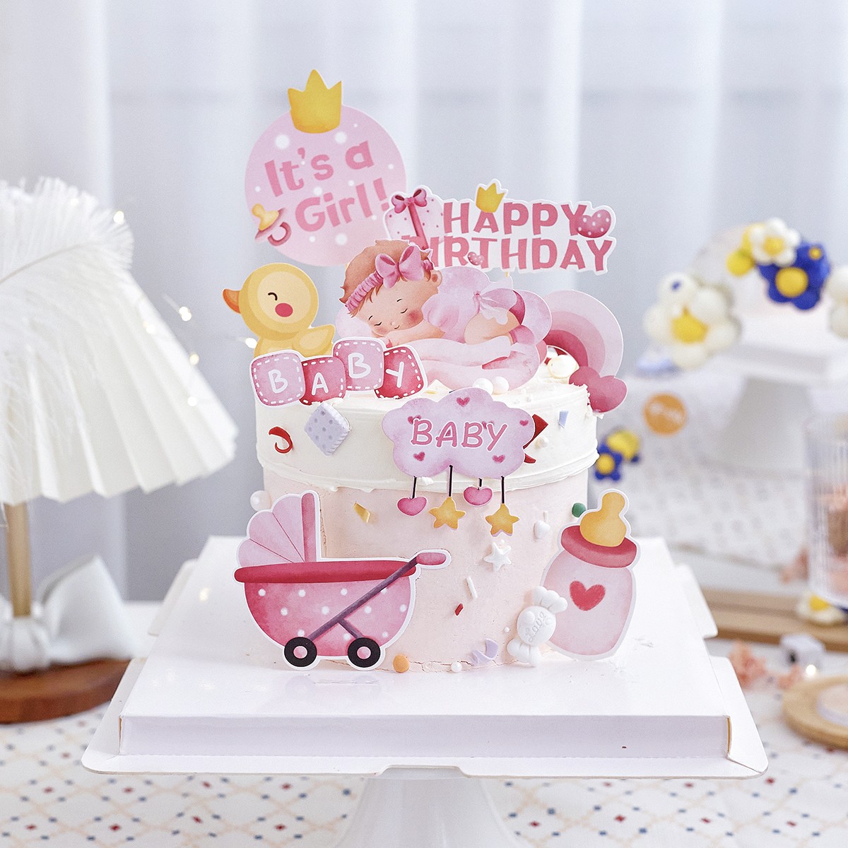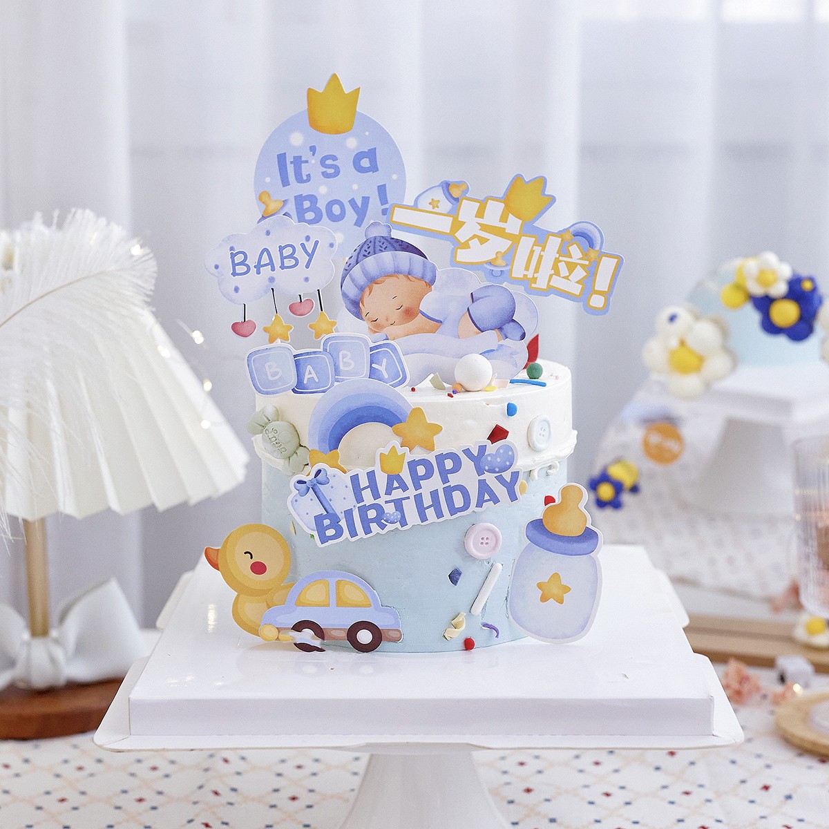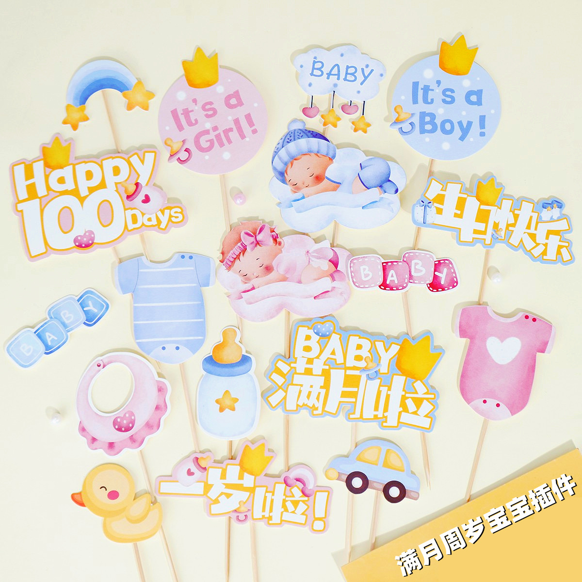 粉/蓝 婴儿宝宝100天满月啦一岁啦生日快乐插件 婴儿车彩虹奶瓶小鸭子卡通插件