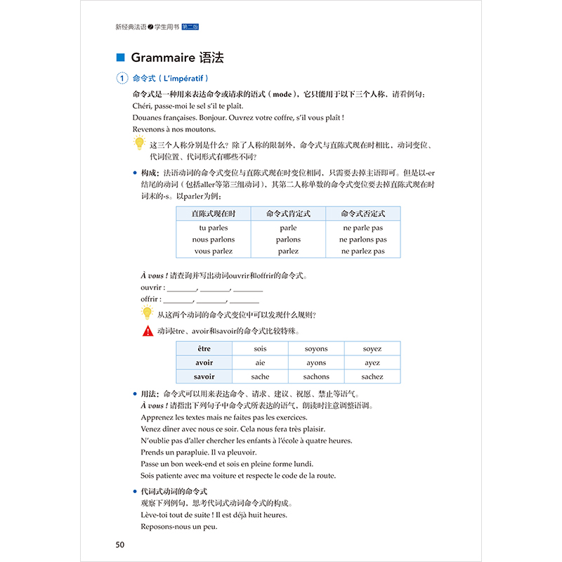 相较于第一版而言,《新经典法语2学生用书:第二版》在延续上述特色的同时,与时俱进、更新内容,并在收集全国多所使用院校反馈意见的基础上,调整了部分知识点的引入和练习题的顺序,使之更加符合教学规律。再者,编者对第一版教材的内容进行合理瘦身,难度也更加平易近人,增强学生的获得感和成就感。此外,第二版在各板块中留出更多的空间给欧美之外的国家,让学生拥有更广阔的视野,同时恰当引入中国文化知识,帮助学生成为有家国情怀、全球视野、专业本领的复合型人才。