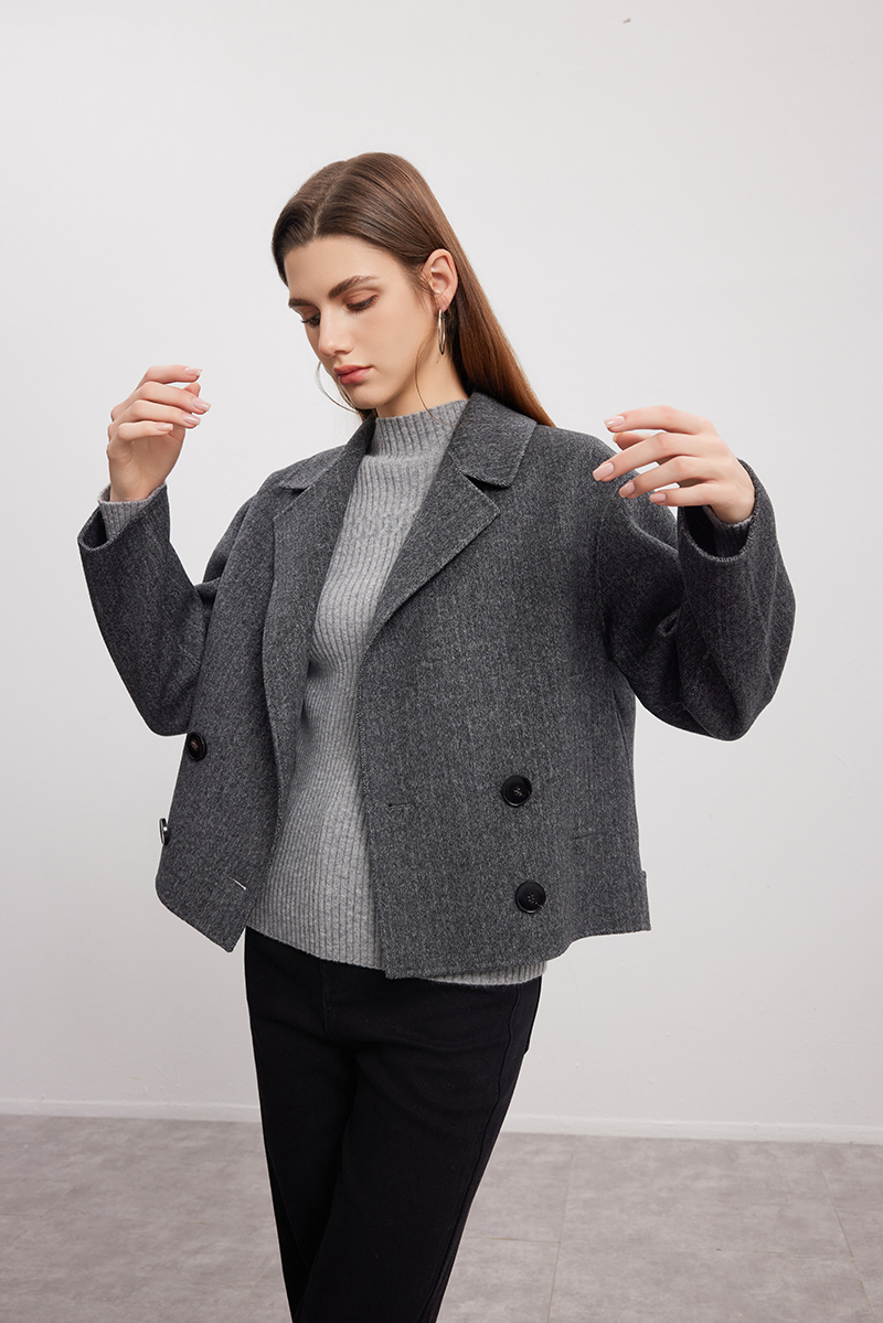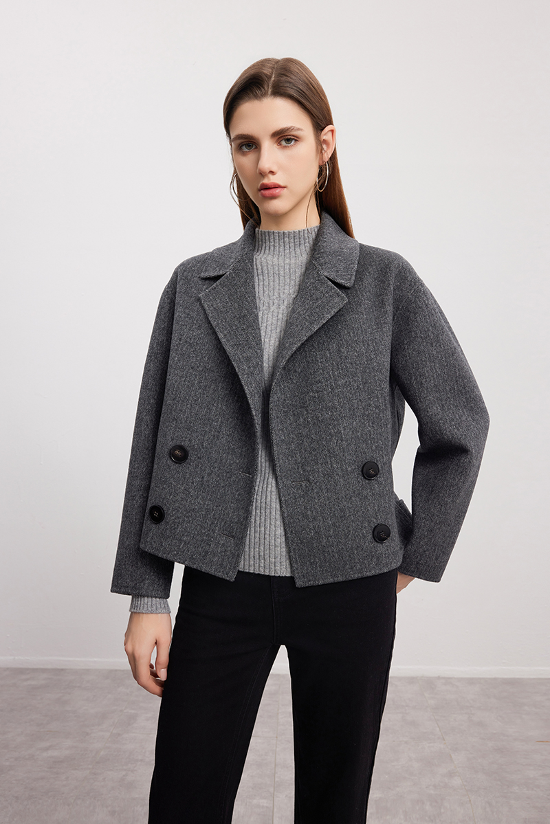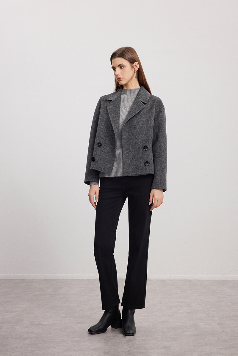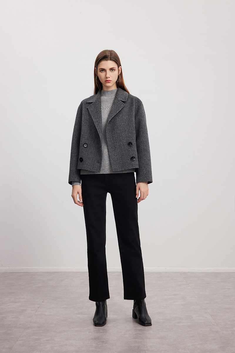 【双排扣人字纹大衣】24年秋冬新品女士短款羊毛大衣时尚毛呢外套
