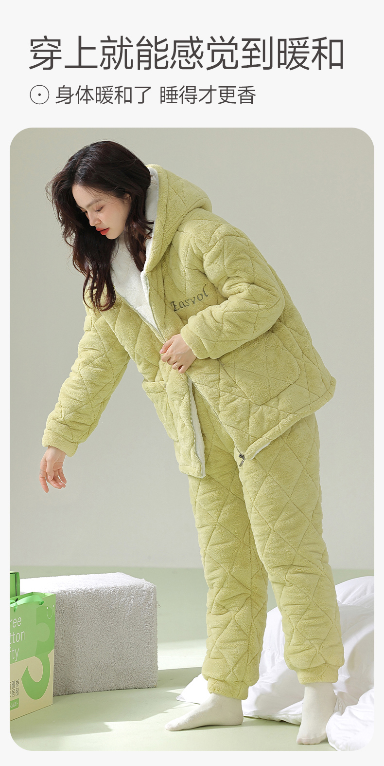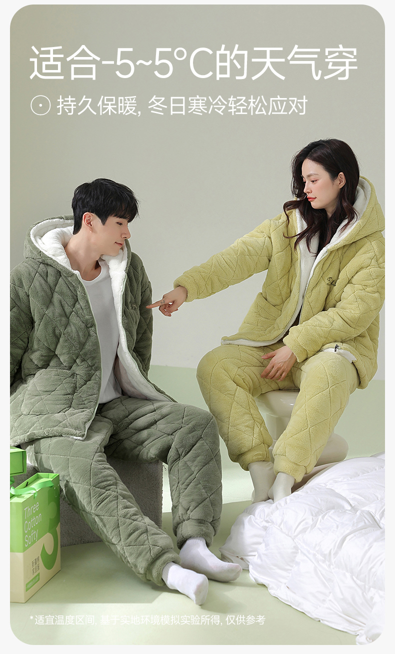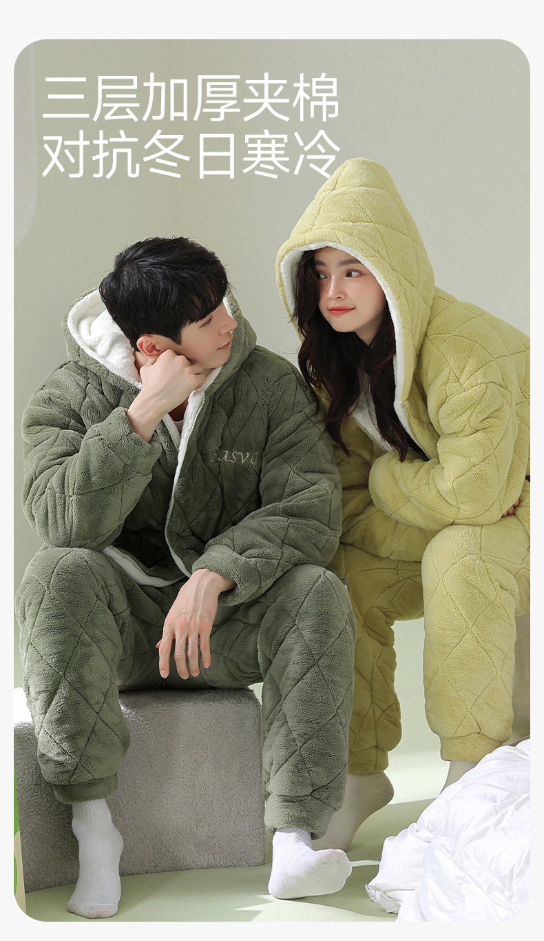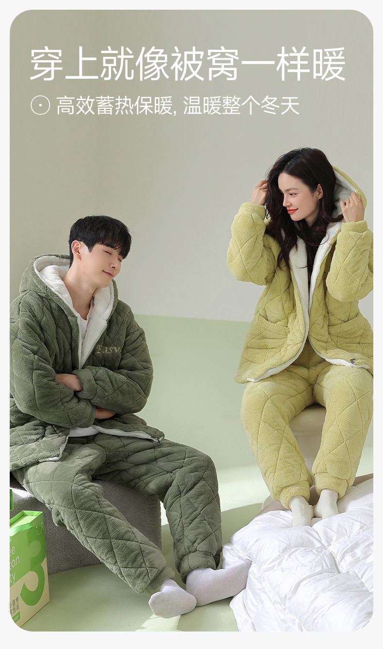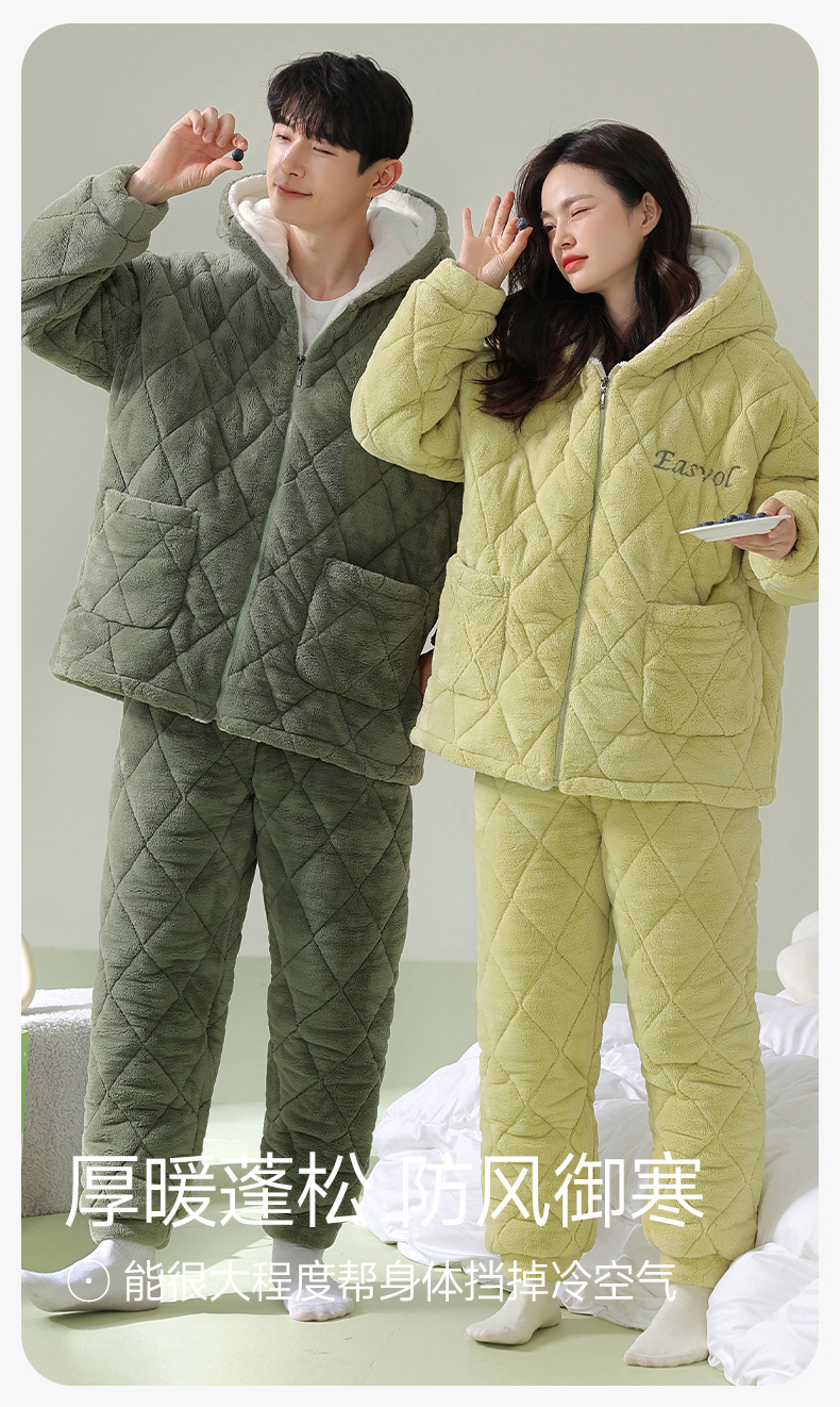 芬腾情侣睡衣冬季珊瑚绒三层加厚夹棉袄套装男女士抗菌防螨家居服