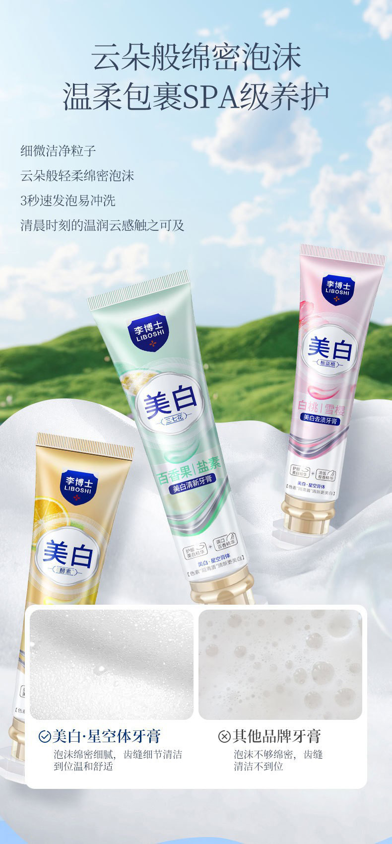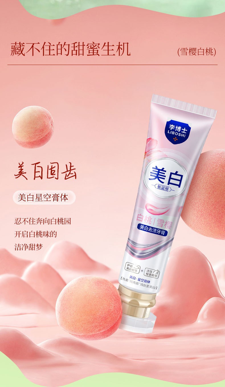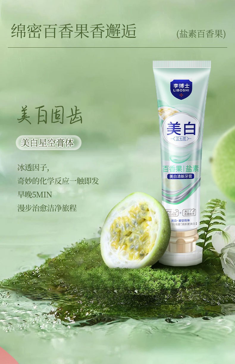 李博士清洁口腔牙齿 固齿去渍清新口气美白牙膏 苦地丁板蓝根三七花多种成分 维c白桃百香果三种口味选择140g/支