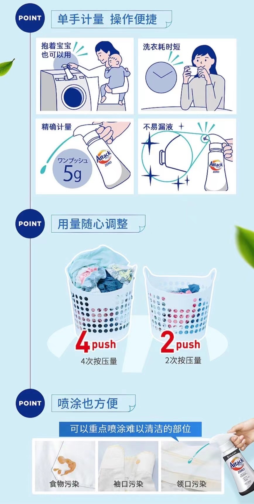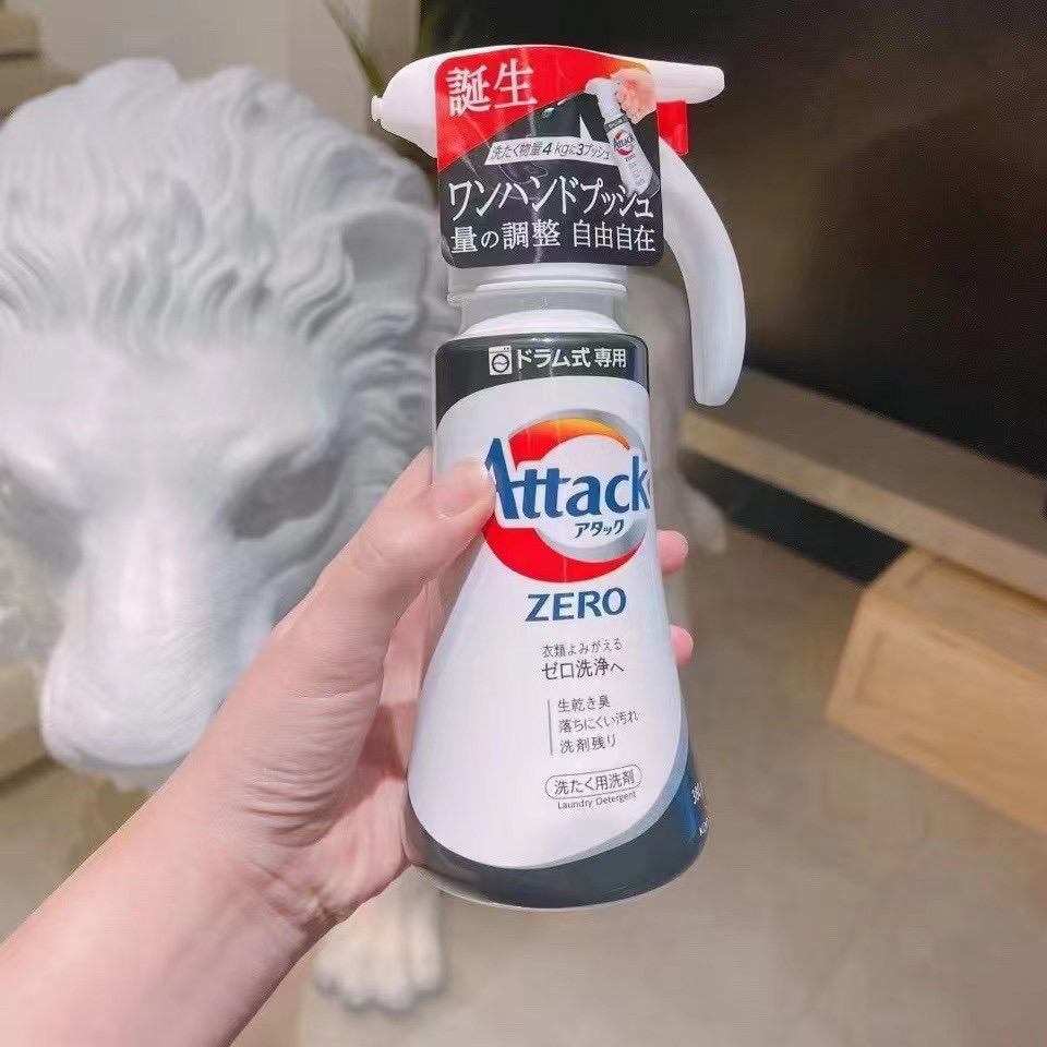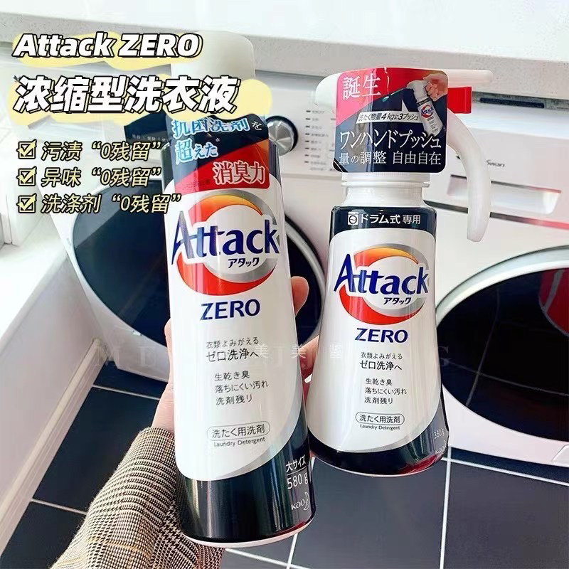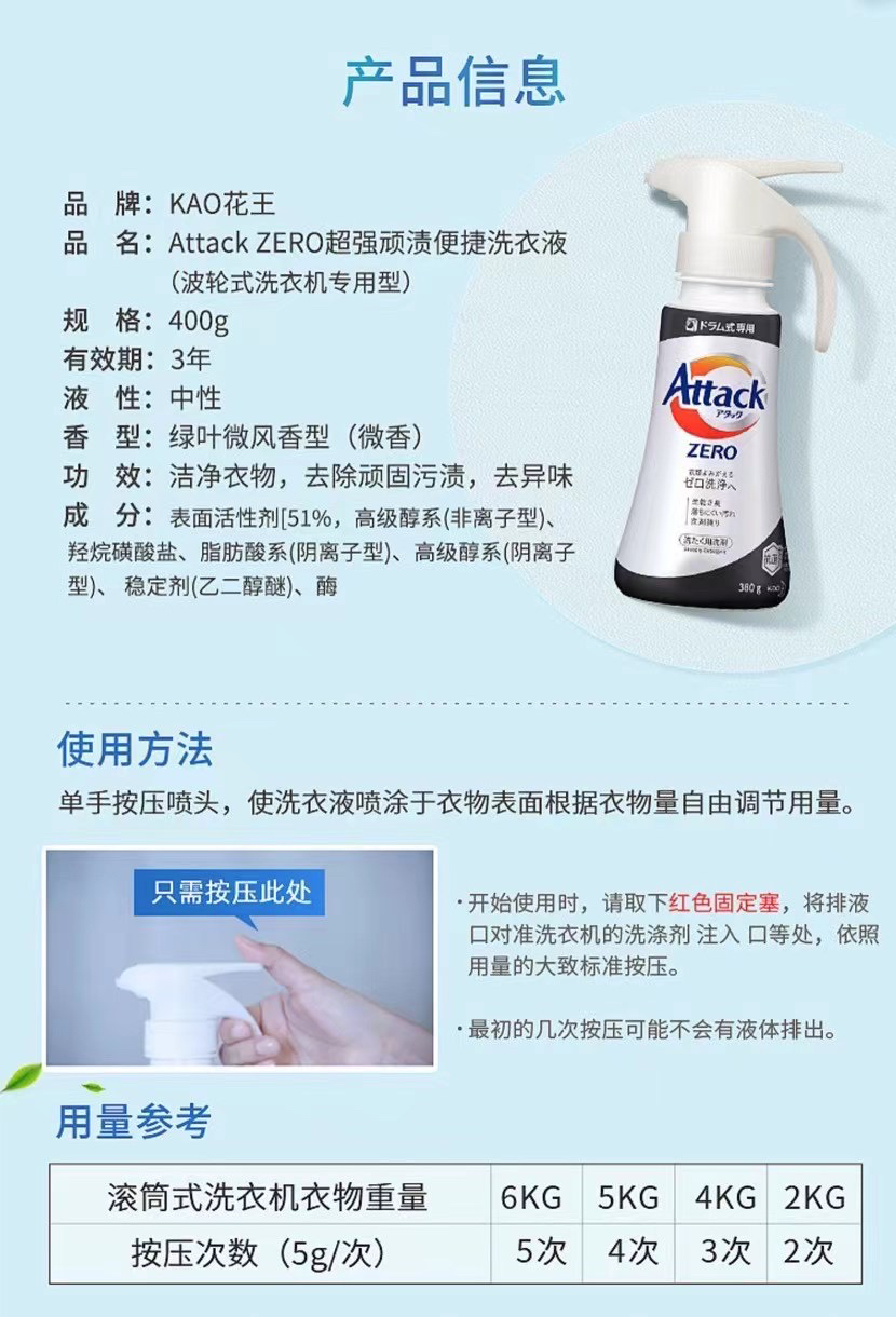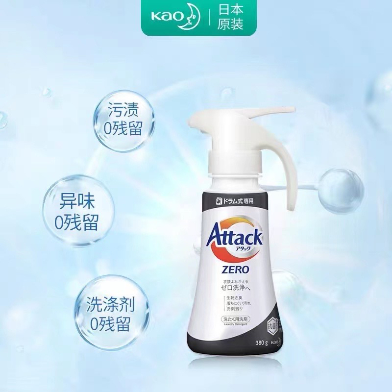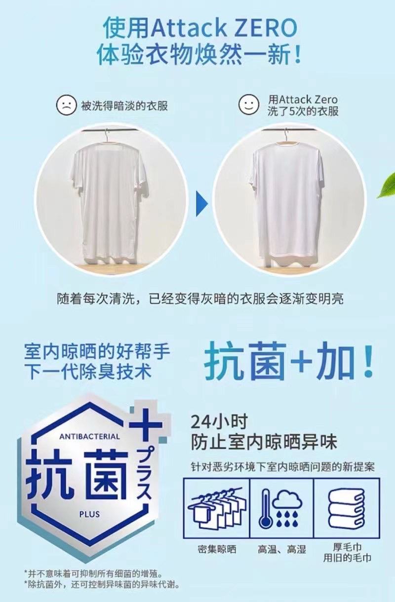 1、日本原装进口,花王高端超浓缩洗衣液Attack Zero,全球亿万家庭主妇一致推荐。高效去污,植物bio ios去污0残留,除菌除臭,并且有效控制异味菌的异味代谢,就算阴雨天室内晾干衣物也仍然气味清新。2公斤衣服喷2下,4公斤衣物喷3下,一喷5g,精确高效超省。一瓶普通四口之家能用一个半月。