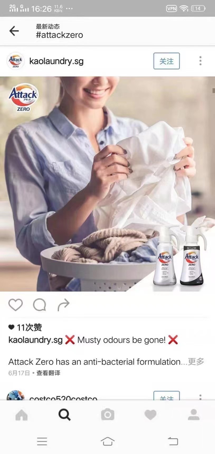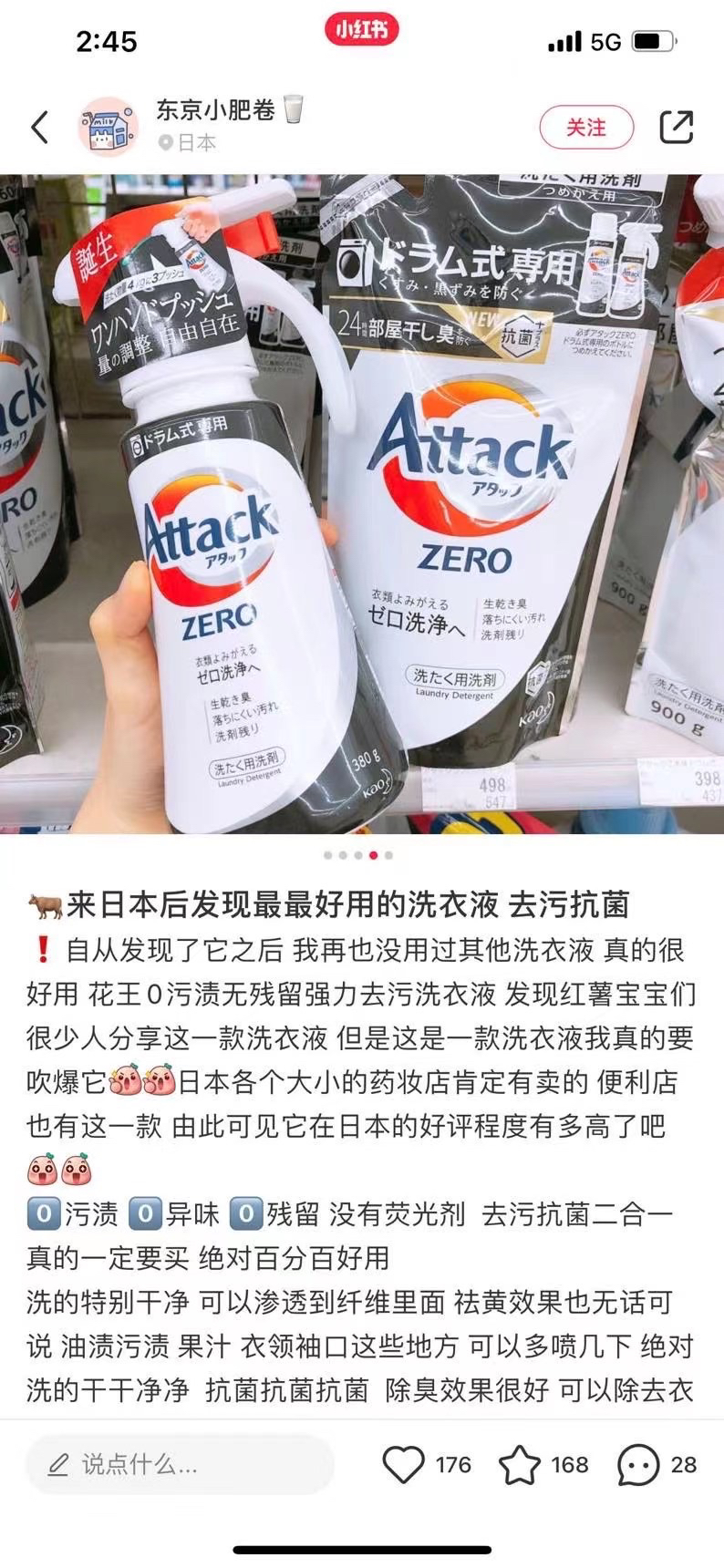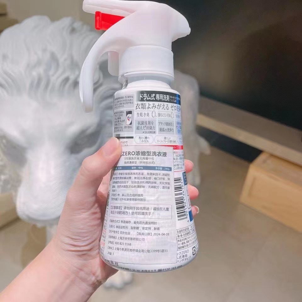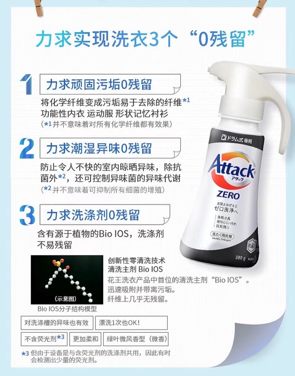1、日本原装进口,花王高端超浓缩洗衣液Attack Zero,全球亿万家庭主妇一致推荐。高效去污,植物bio ios去污0残留,除菌除臭,并且有效控制异味菌的异味代谢,就算阴雨天室内晾干衣物也仍然气味清新。2公斤衣服喷2下,4公斤衣物喷3下,一喷5g,精确高效超省。一瓶普通四口之家能用一个半月。