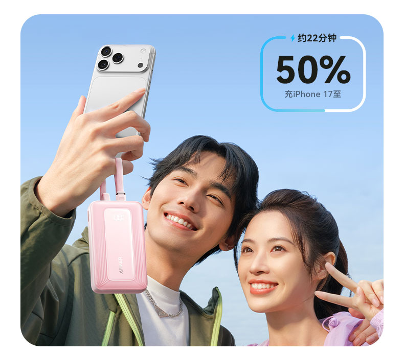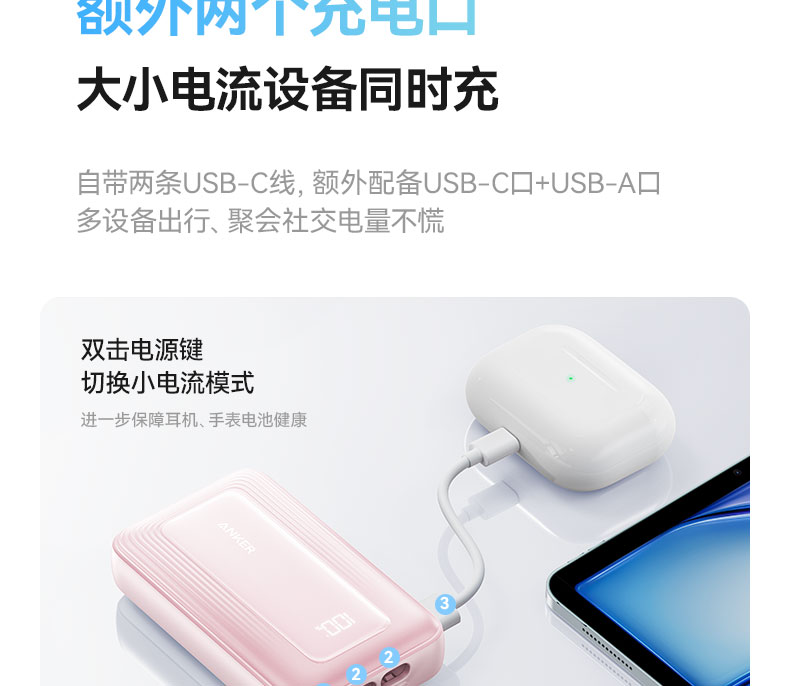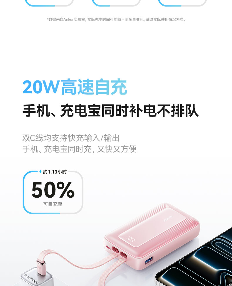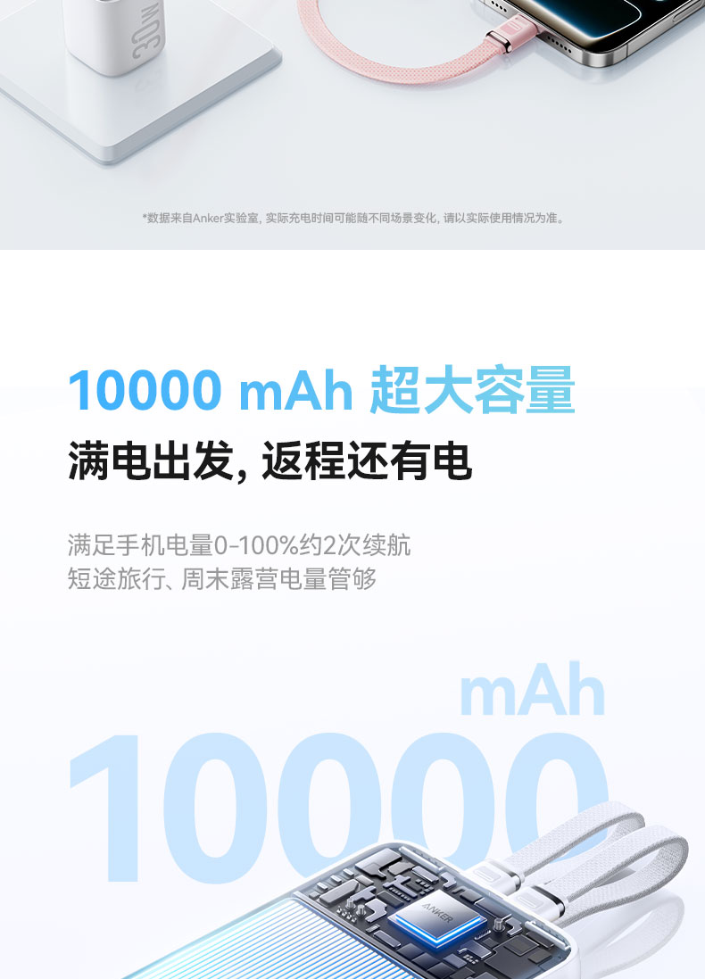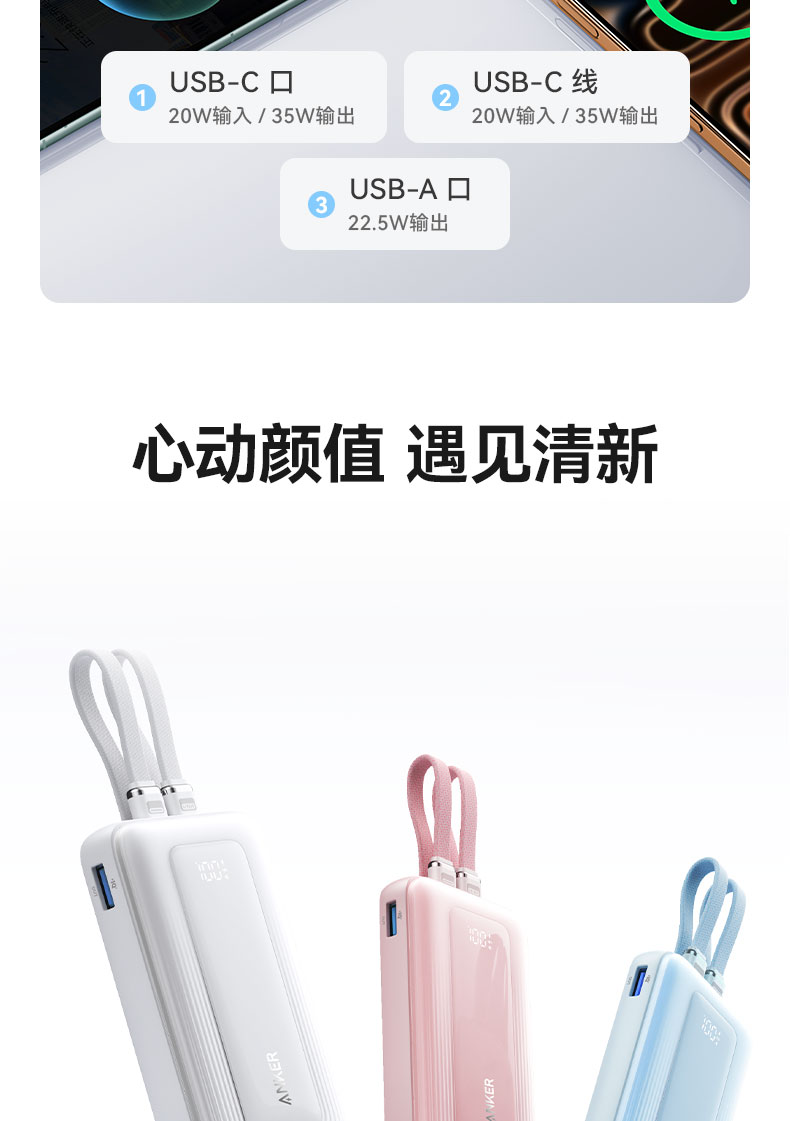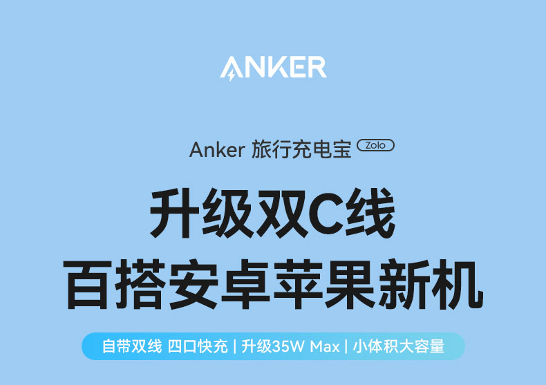 【新品】Anker安克 自带双C线10000mAh移动电源 35W快充可上飞机适配苹果17/小米/华为手机 A110L