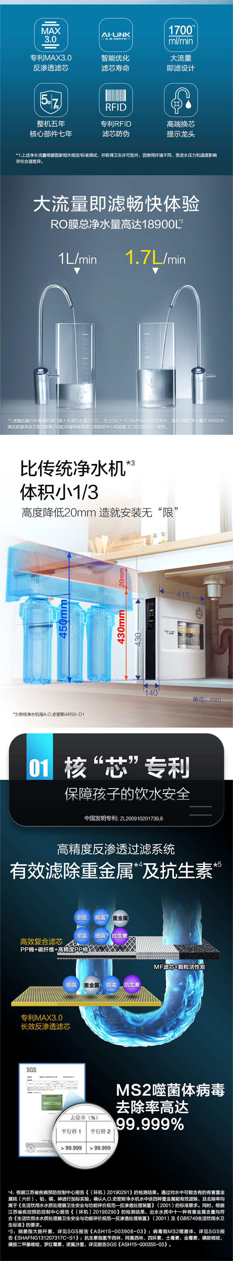 A.O.史密斯(510410 )厨下反渗透直饮净水器R1700FWi 1.7升/分钟大流量净水器