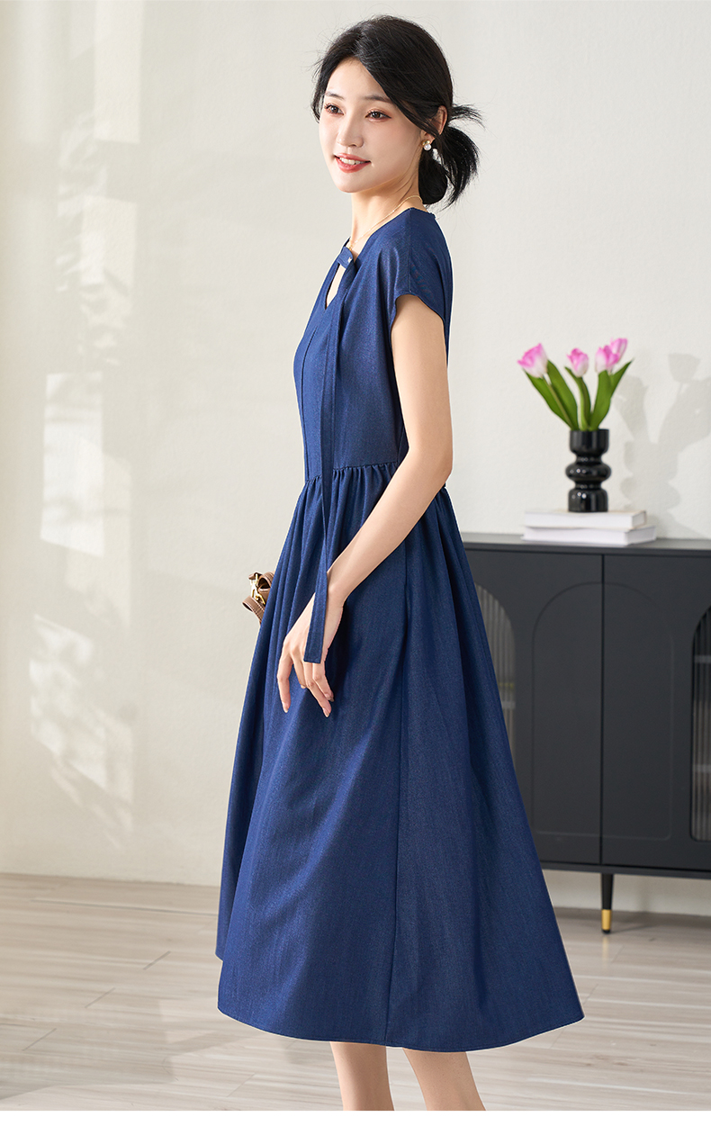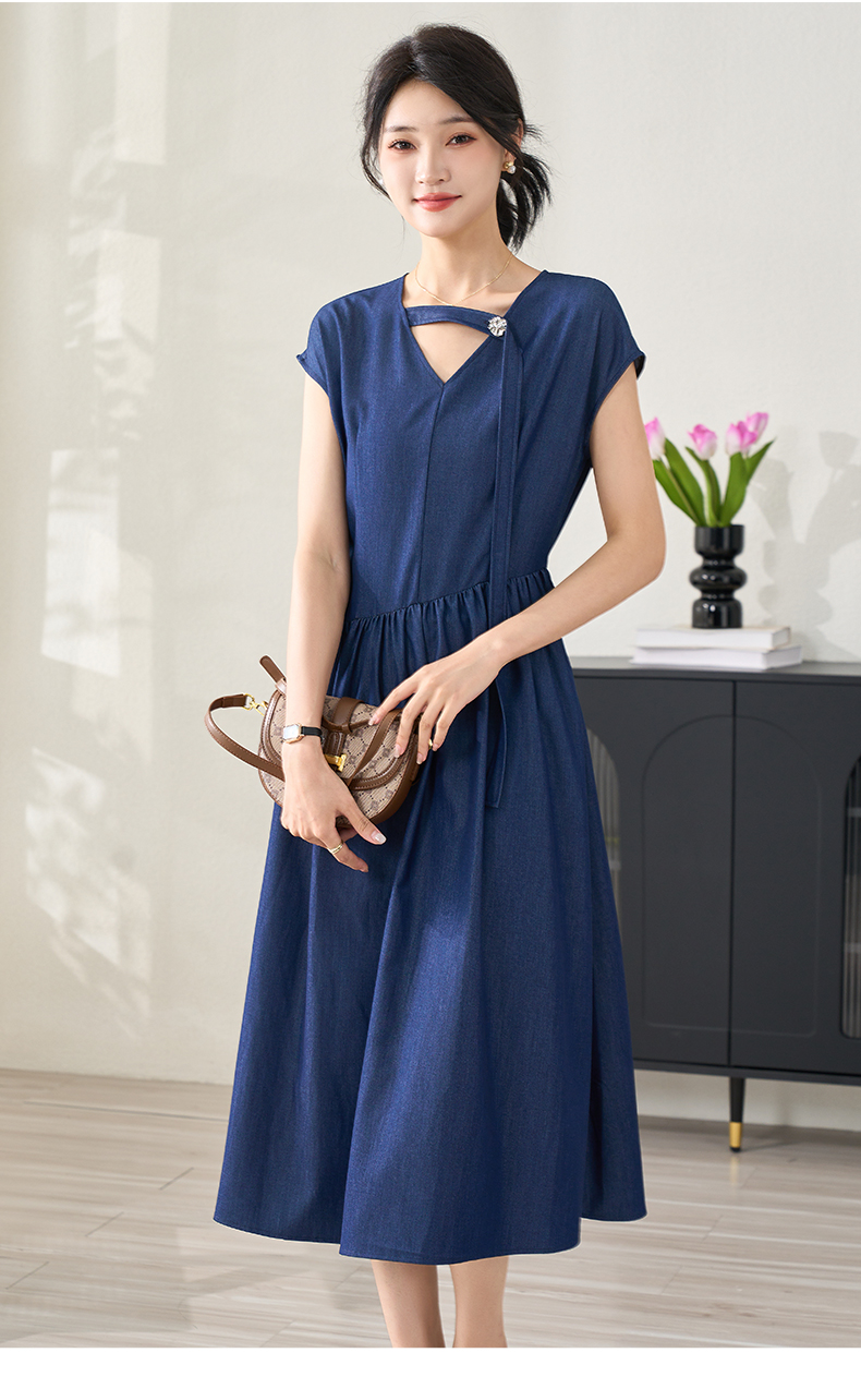 剩M 米思阳2024夏季新款仿天丝牛仔面料简约通勤V领连衣裙设计感收腰飞飞袖长裙子女