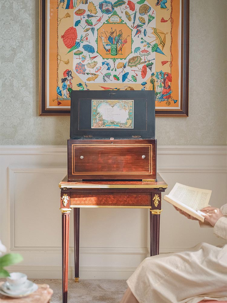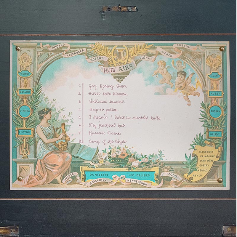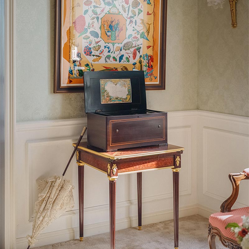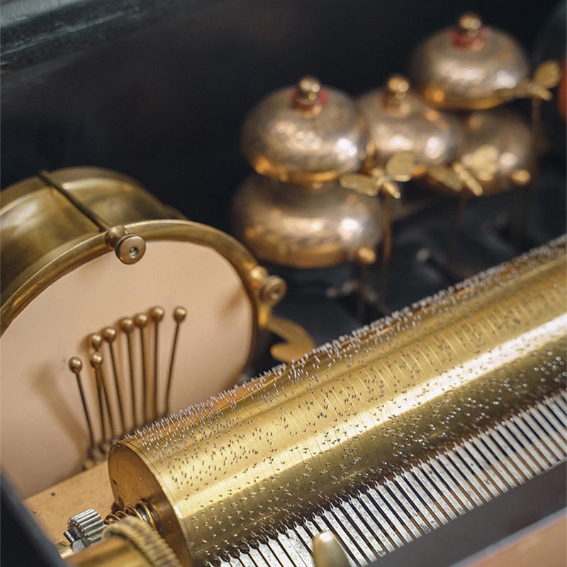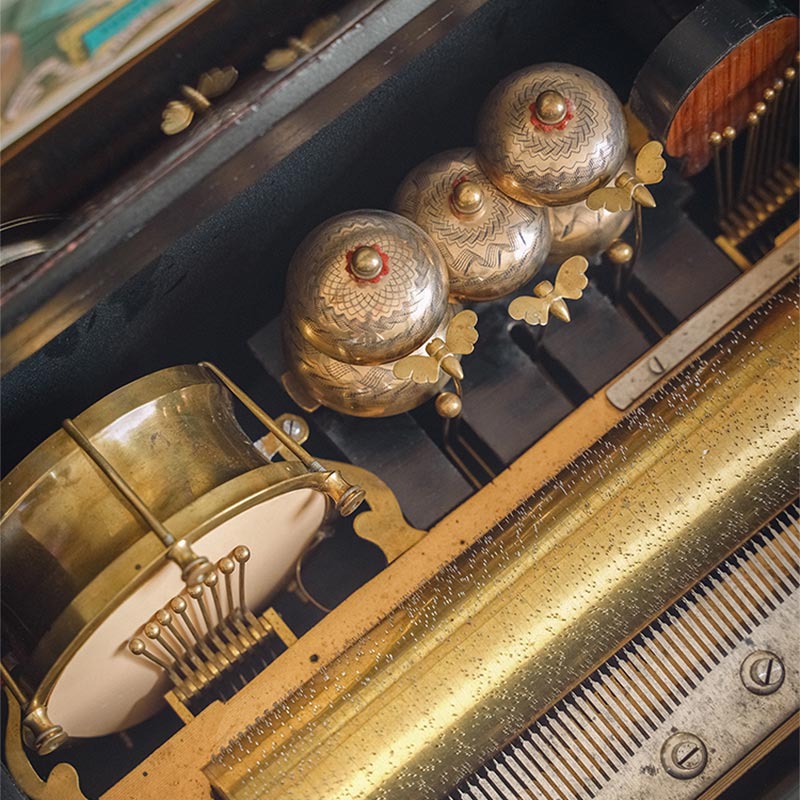 19世纪瑞士出品古典花叶主题细木镶嵌外箱配铃铛响鼓滚轴式音乐盒