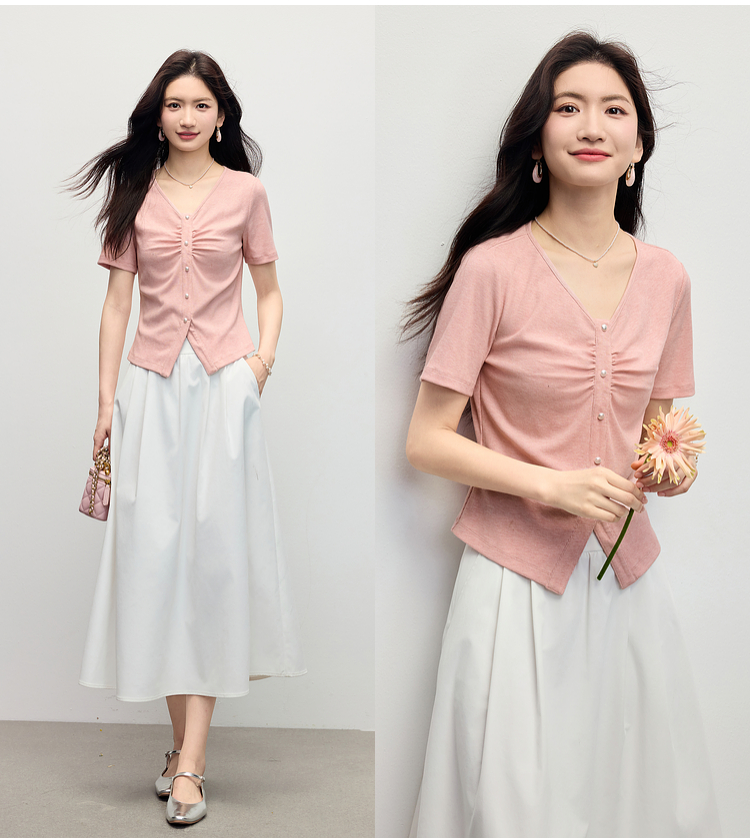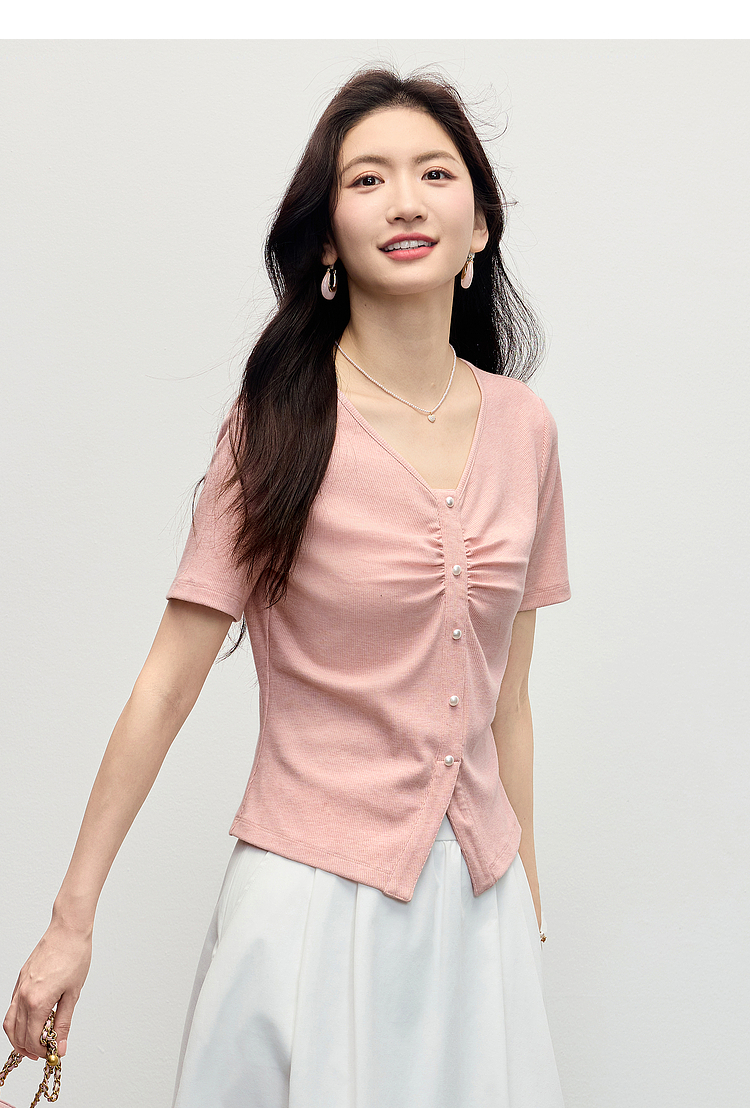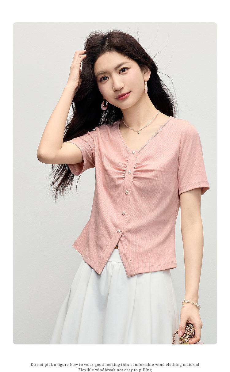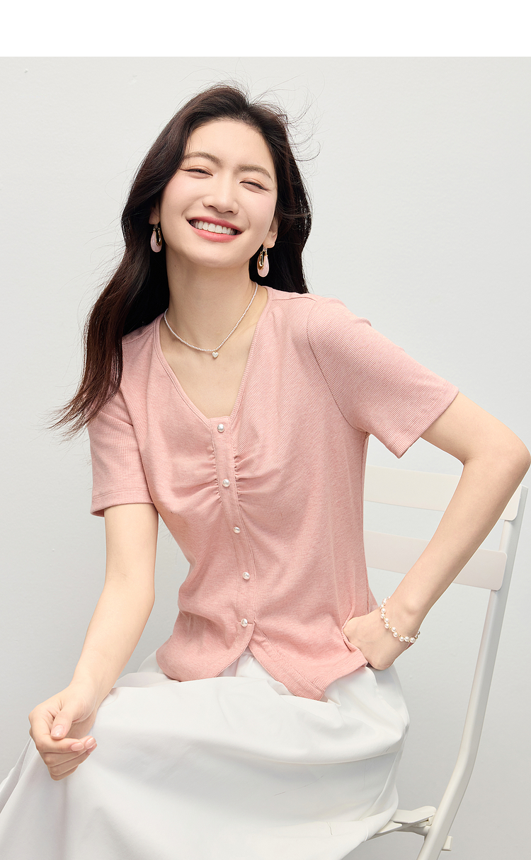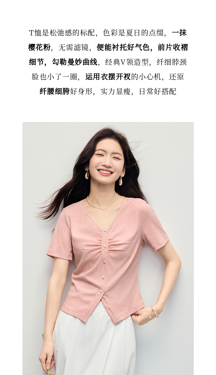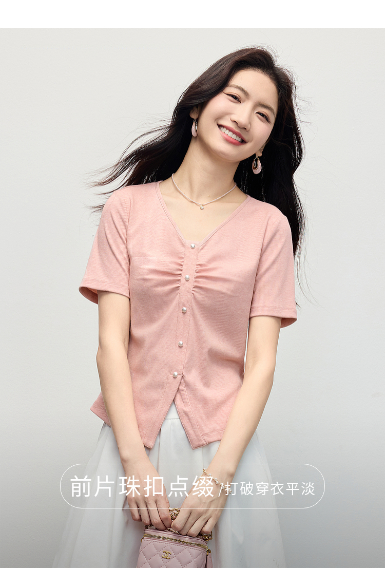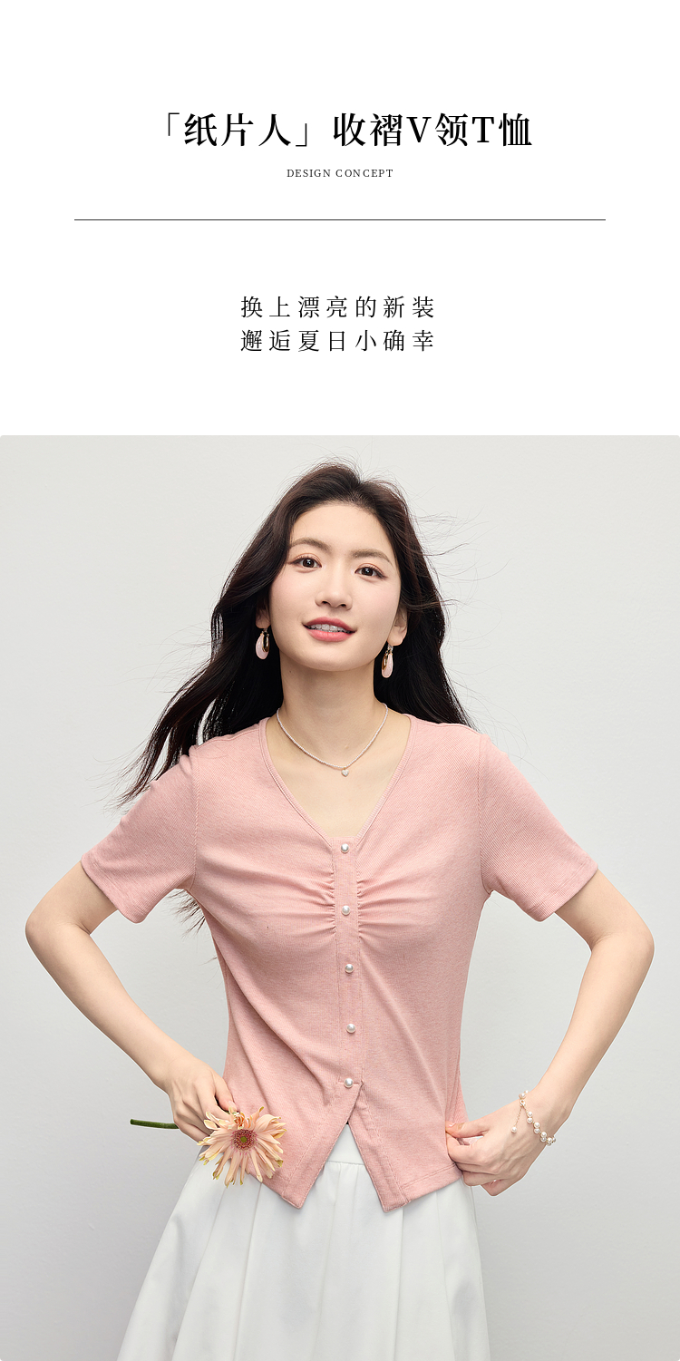 【周四狂欢价】熙世界褶皱粉色正肩t恤女设计感2025夏装新款洋气减龄短袖V领上衣