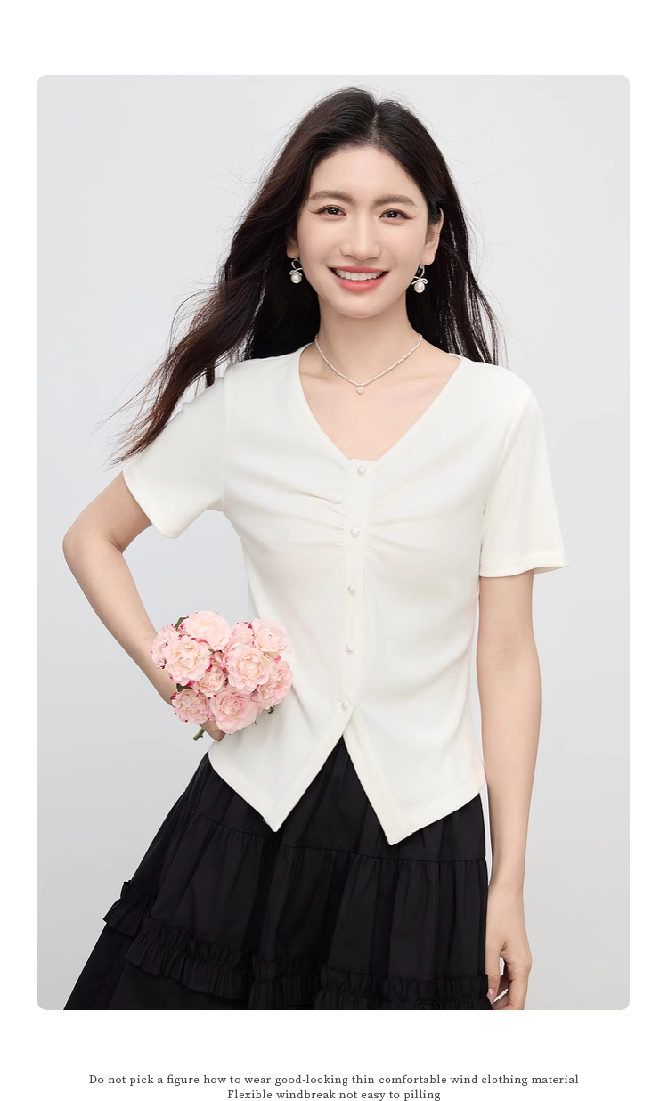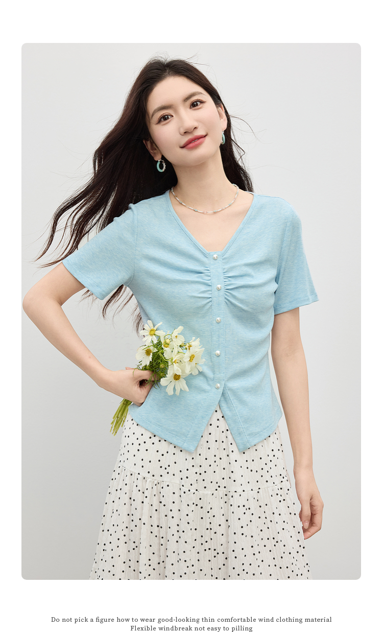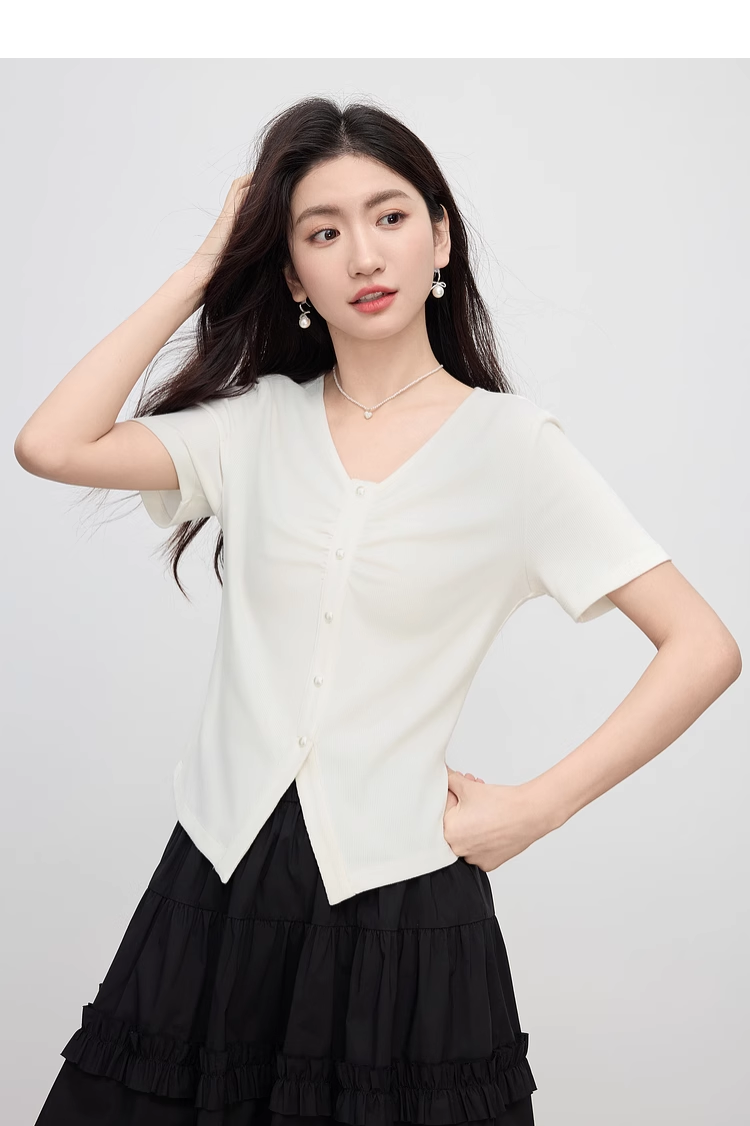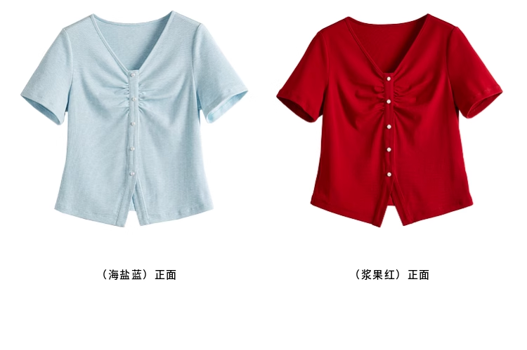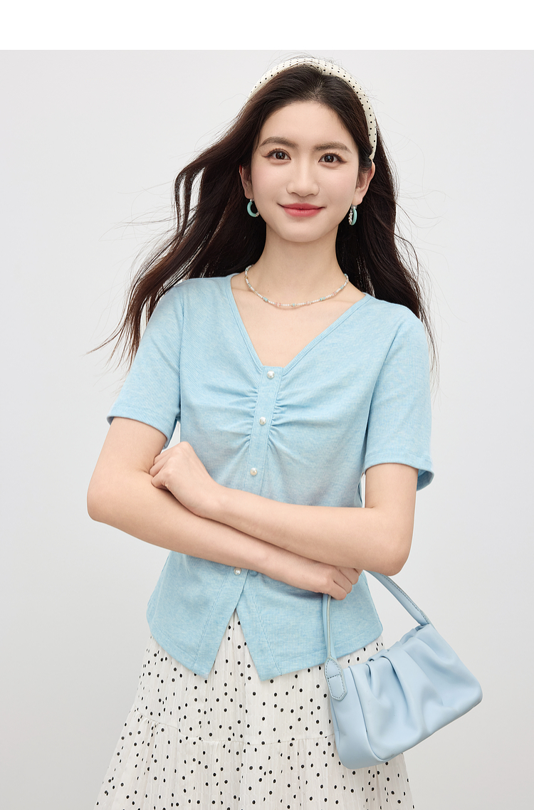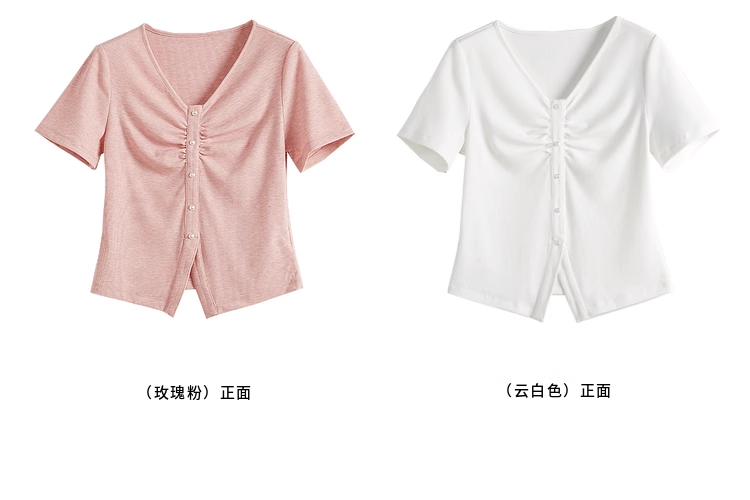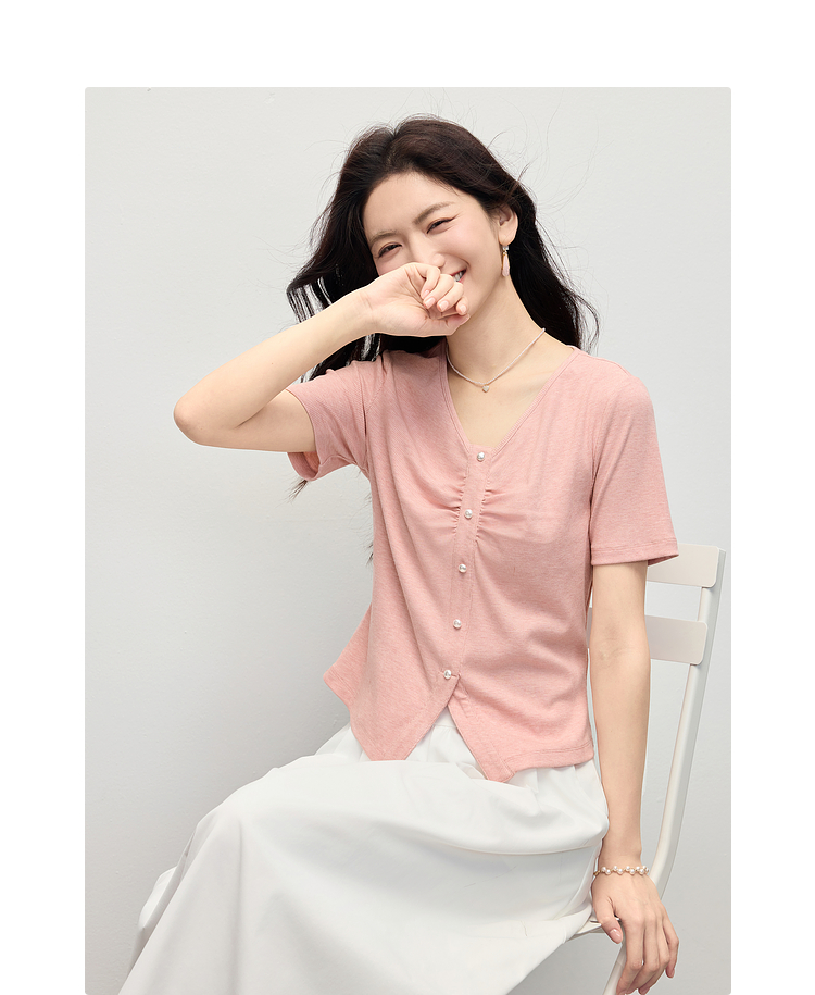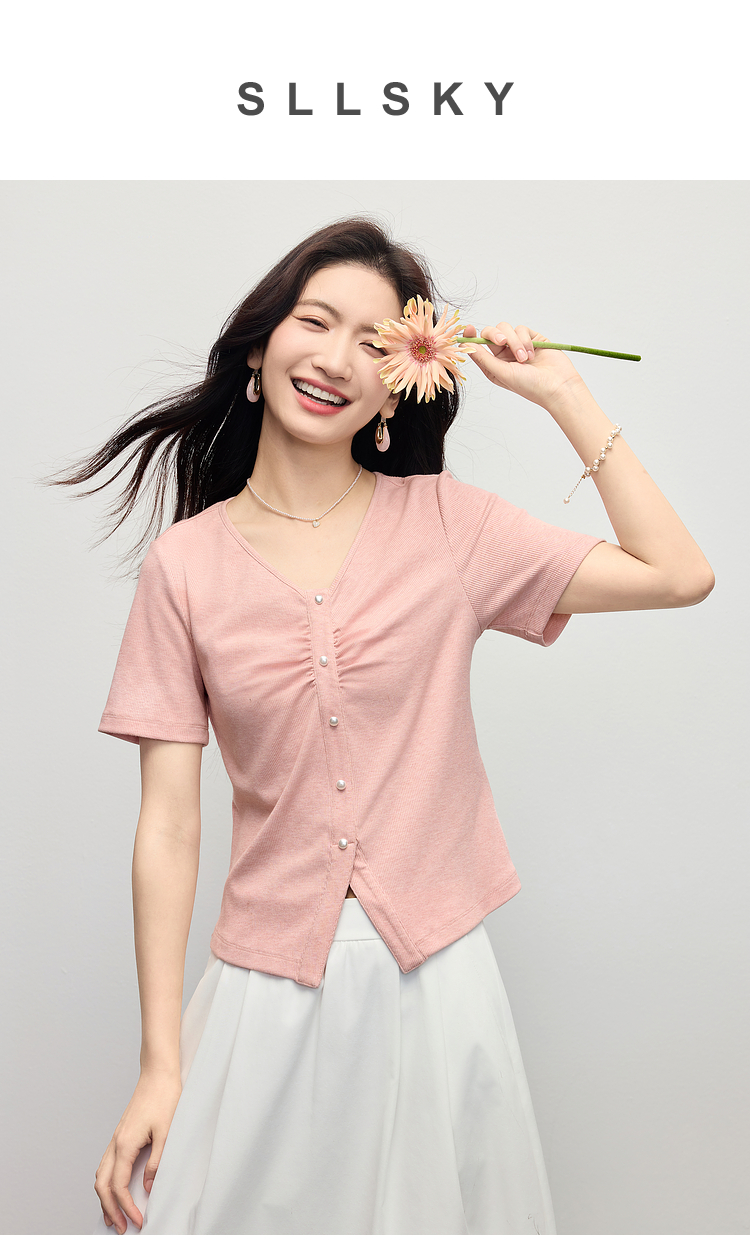 【周四狂欢价】熙世界褶皱粉色正肩t恤女设计感2025夏装新款洋气减龄短袖V领上衣