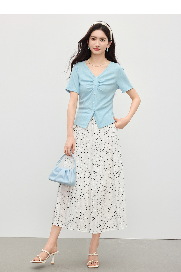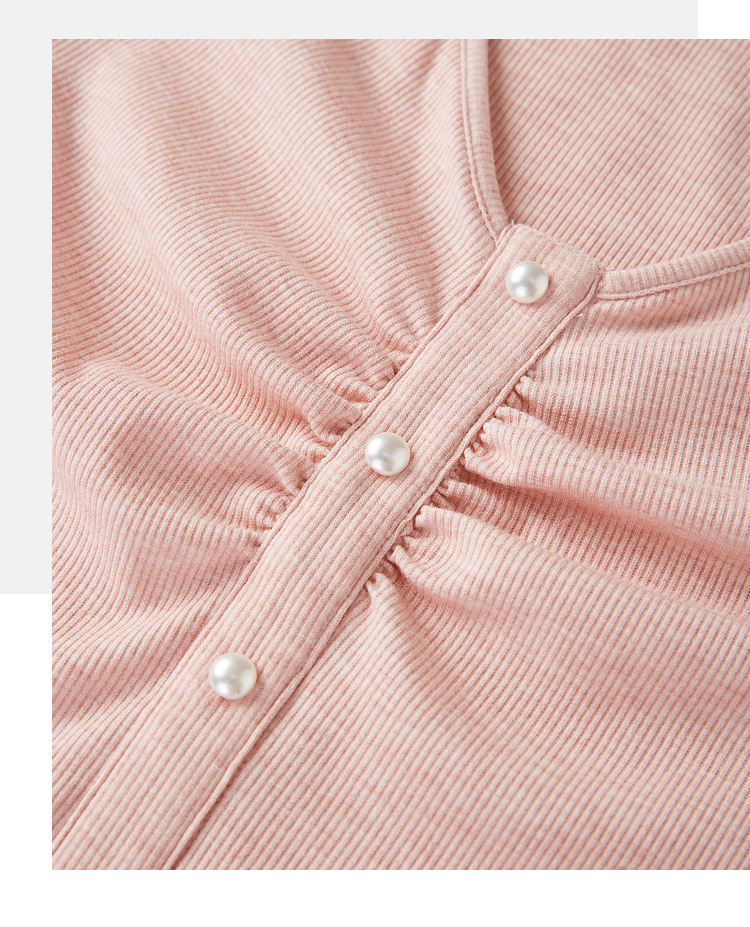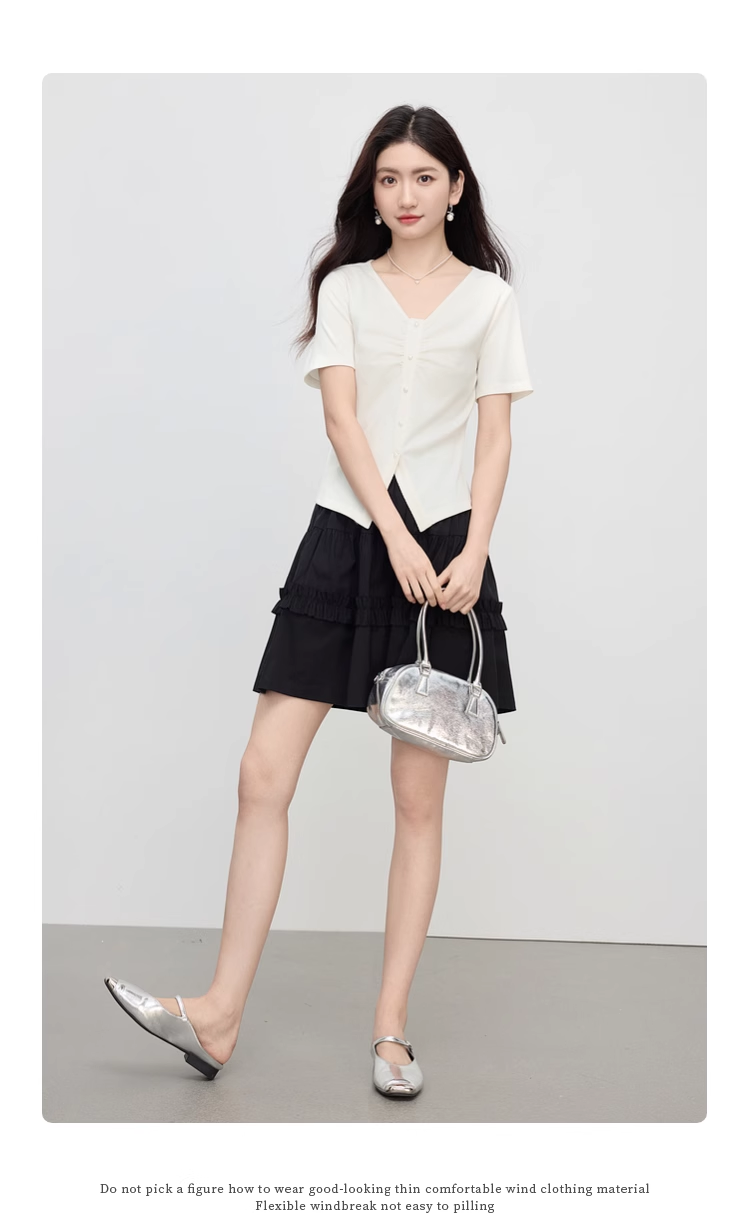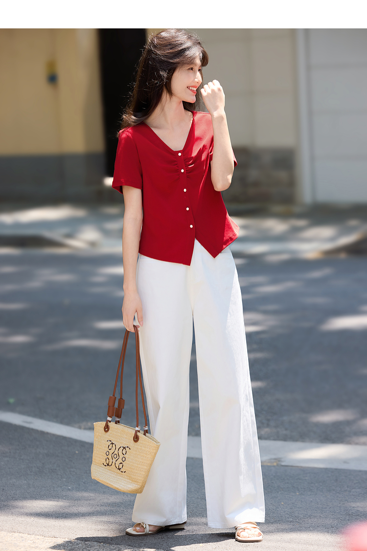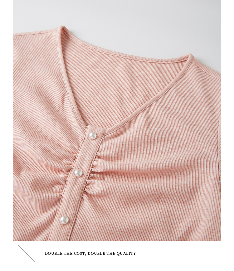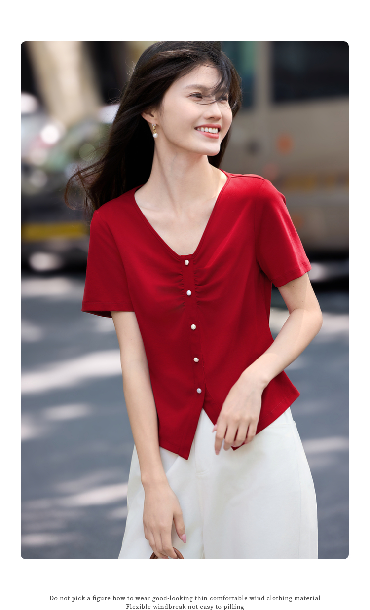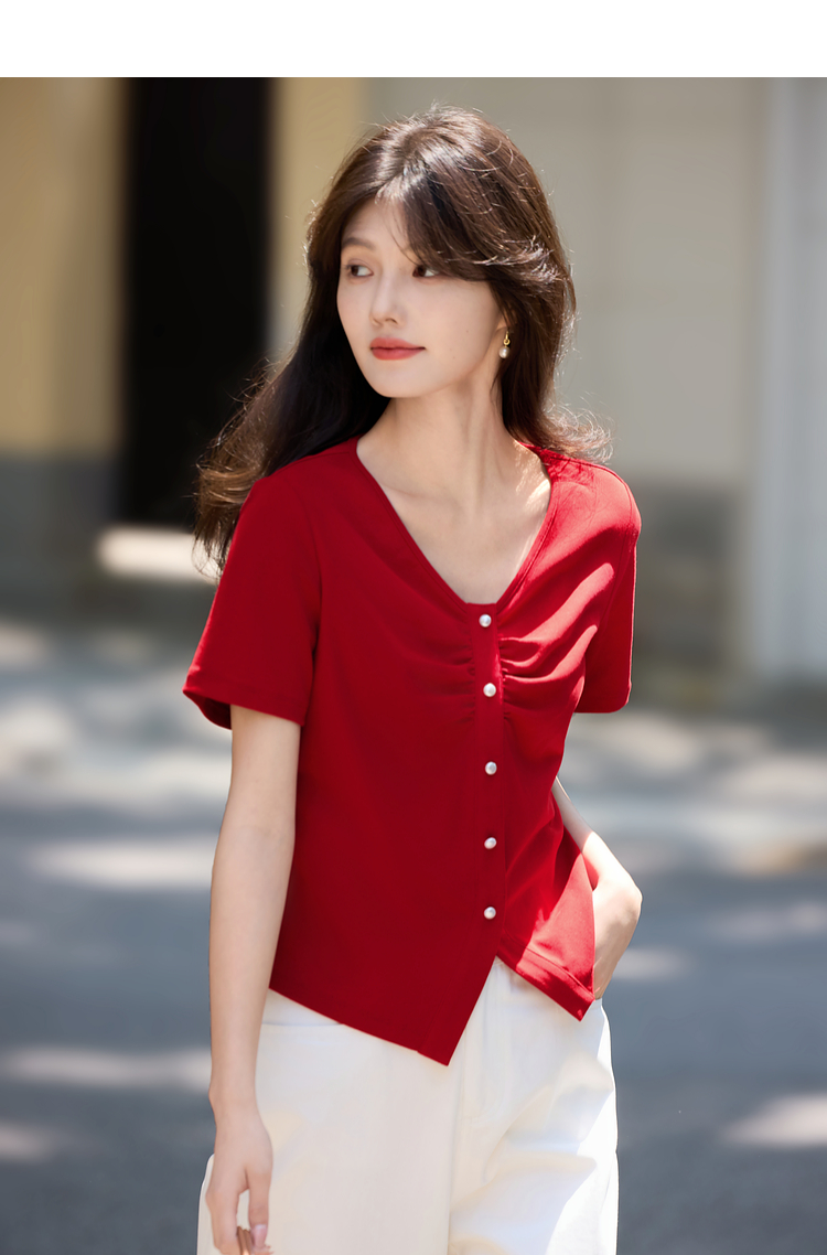 【周四狂欢价】熙世界褶皱粉色正肩t恤女设计感2025夏装新款洋气减龄短袖V领上衣