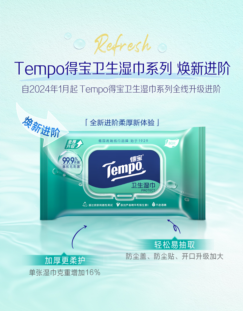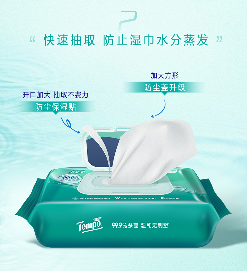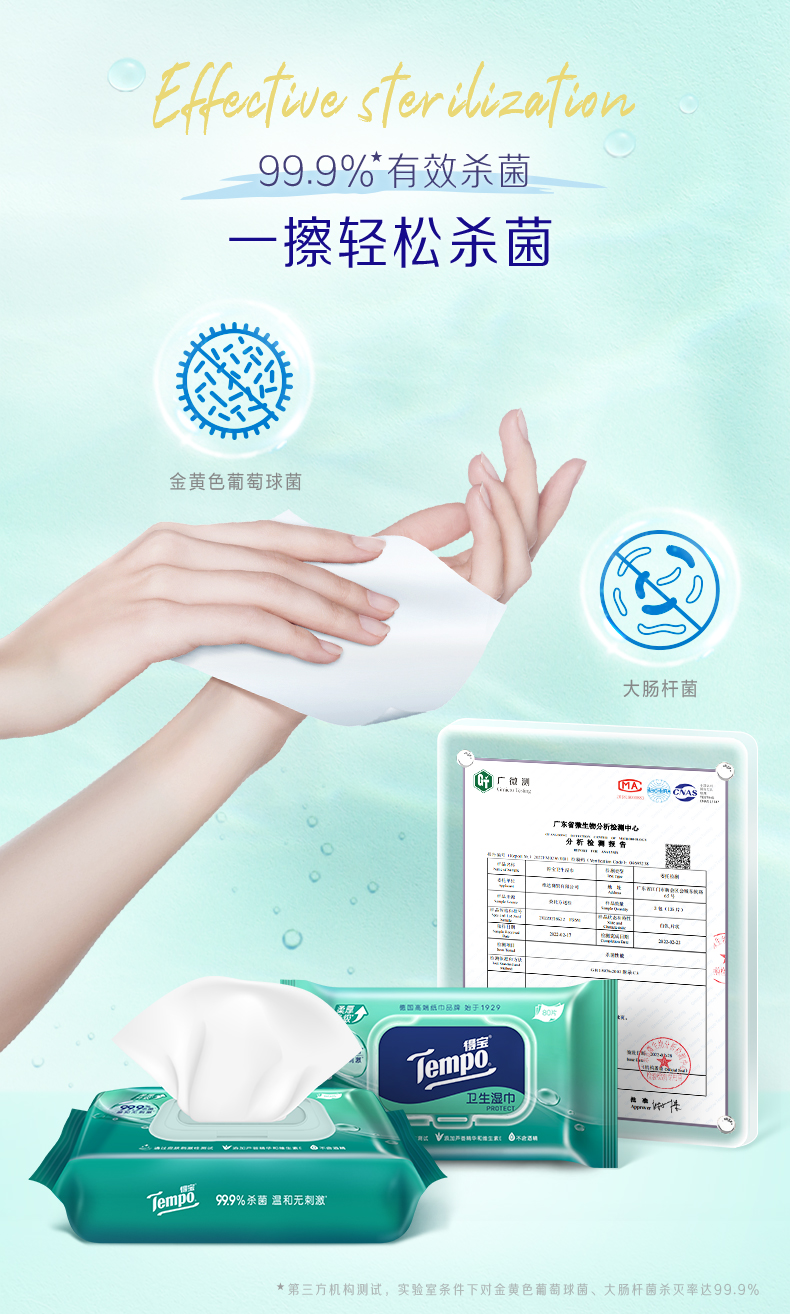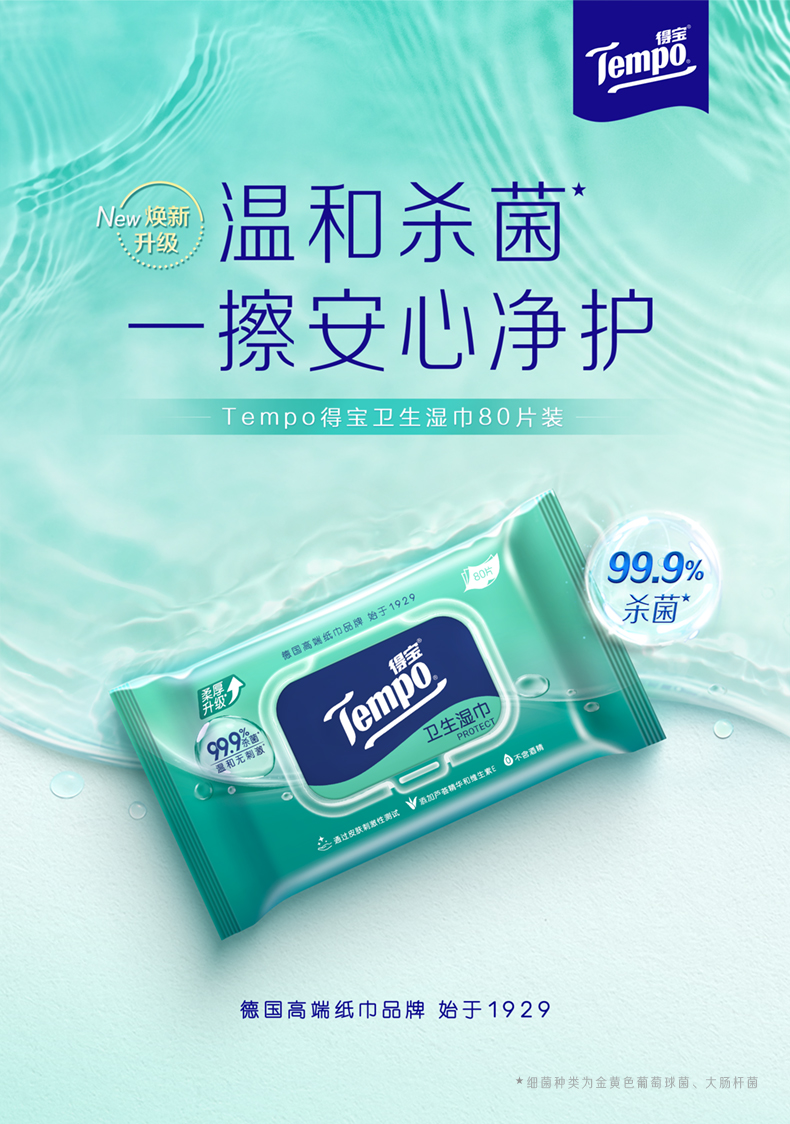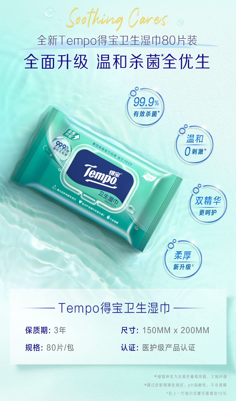 新品『得宝Tempo』卫生湿巾80片/包*1包 温和杀菌