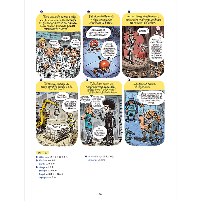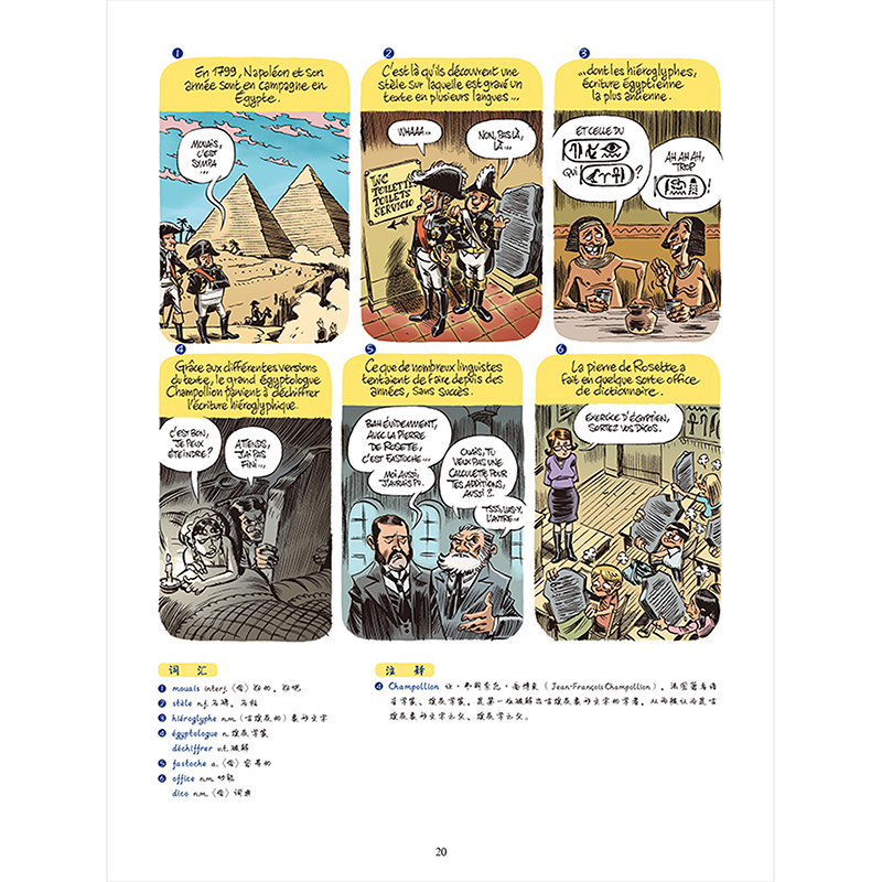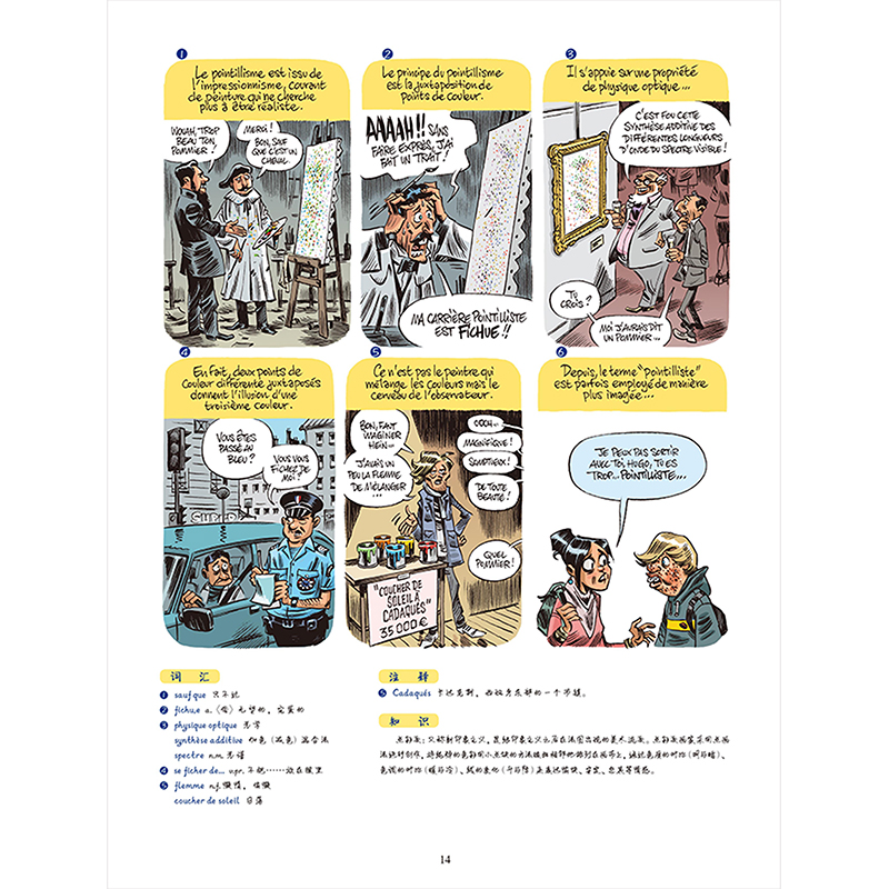 《无基百科》作为外研社法语“漫”游系列漫画注释读物的作品之一,是一部将知识百科和幽默元素融为一体的科普漫画,包含天文、物理、生物、化学、历史、绘画、音乐等多种主题的五十二幅漫画,每幅开头均已以一个百科式提问揭示主题(如"什么是黑洞?""什么是点画法?""微波炉是如何加热食物的?"等),将科普文字与生动幽默的图片相搭配,令读者在汲取知识的同时忍俊不禁。整体语言有一定难度,但配合中文注释宜于具备基本法语水平的学习者阅读,适于A2及以上水平法语学习者。