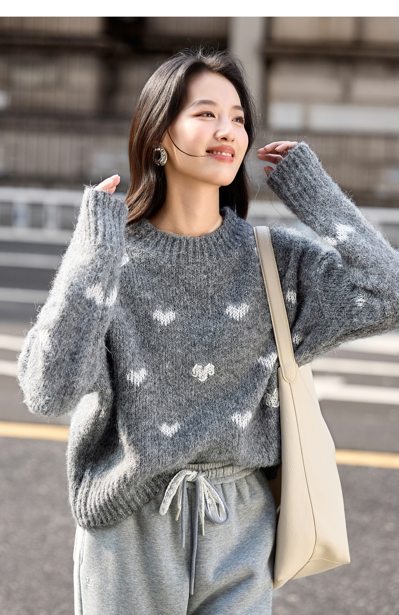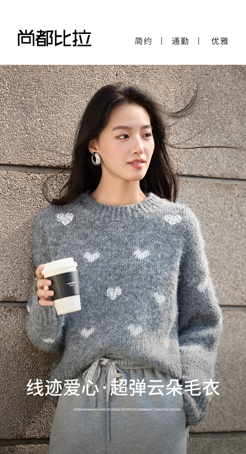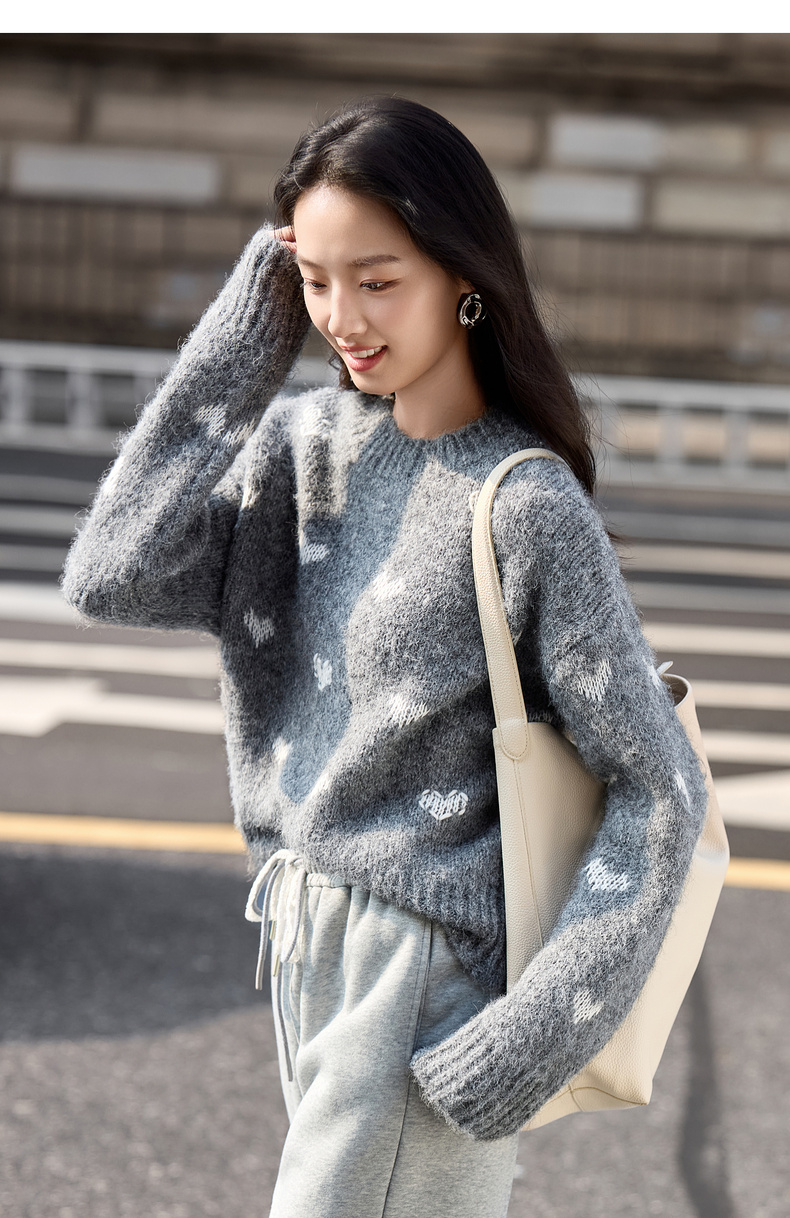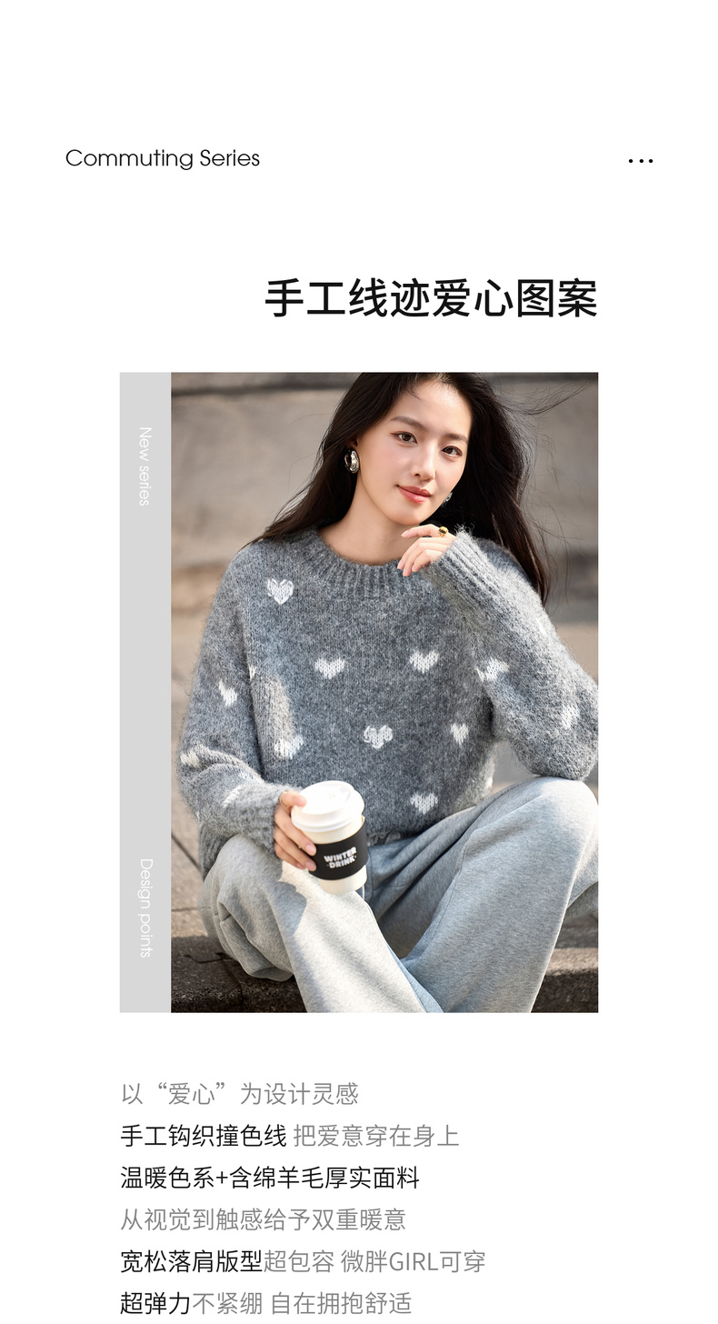 【内购】【手工线迹爱心图案】优雅通勤圆领宽松落肩含绵羊毛厚保暖毛衣-W54EE3769