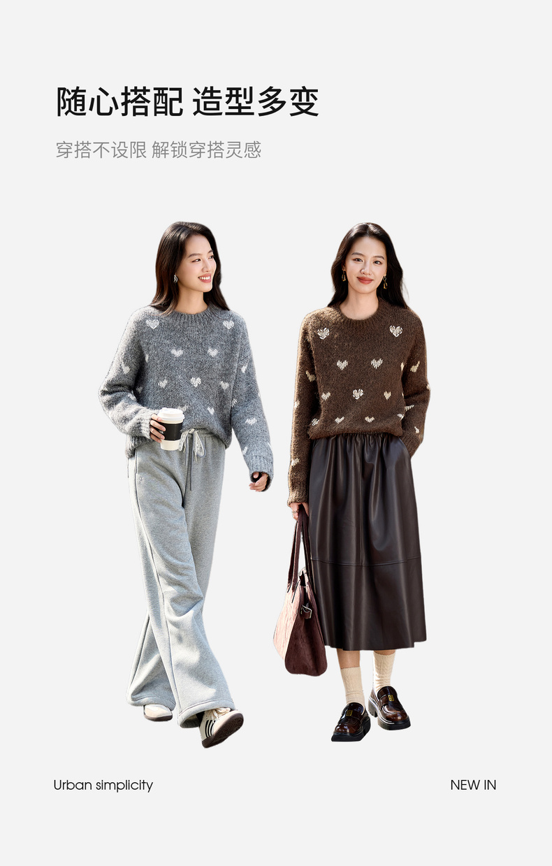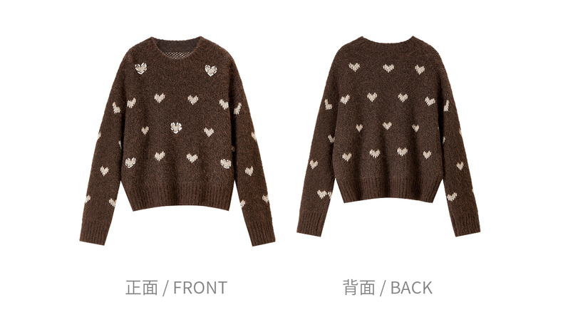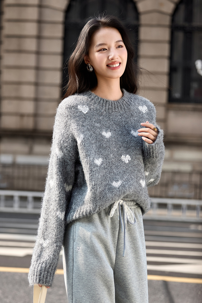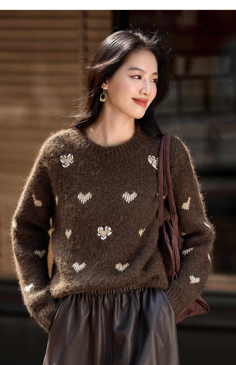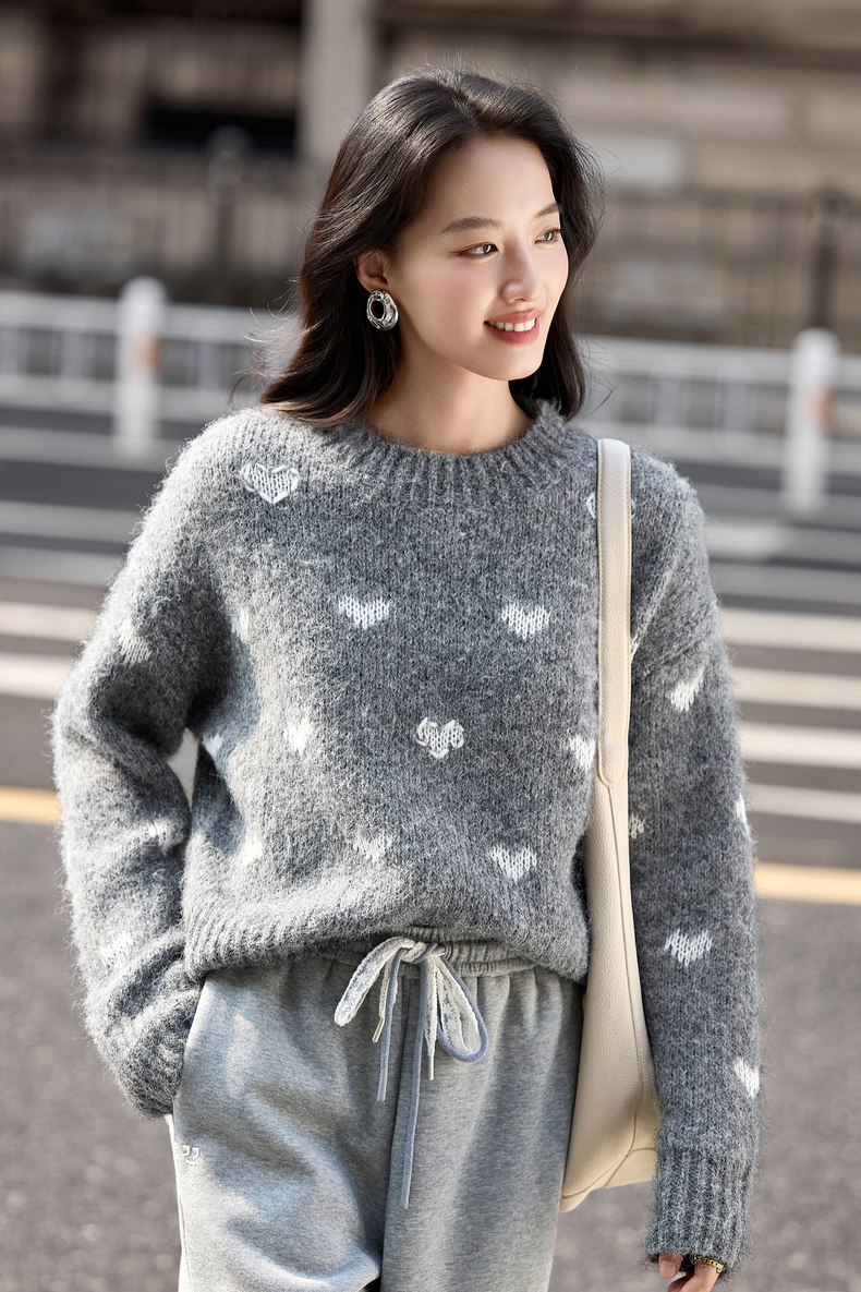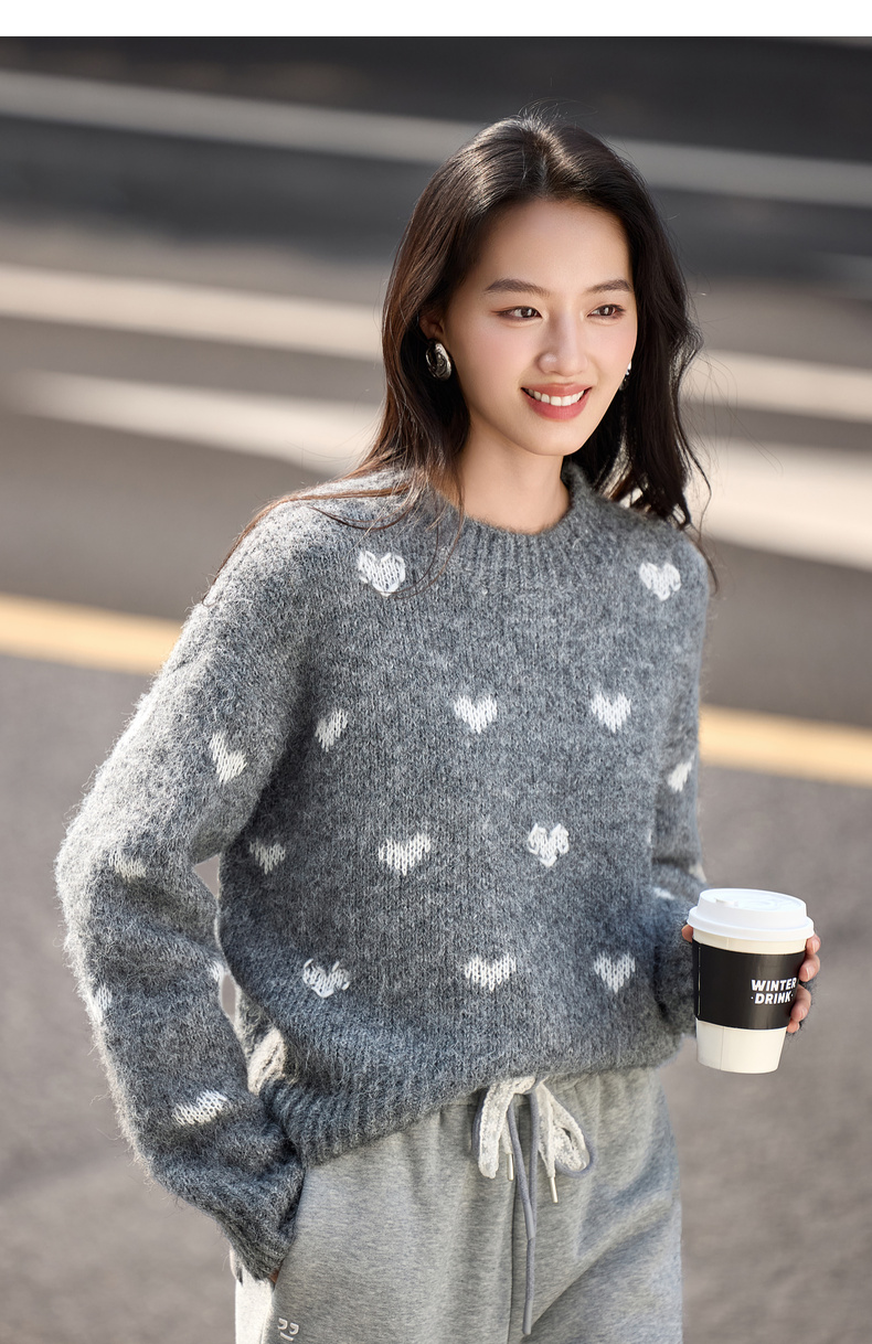【内购】【手工线迹爱心图案】优雅通勤圆领宽松落肩含绵羊毛厚保暖毛衣-W54EE3769