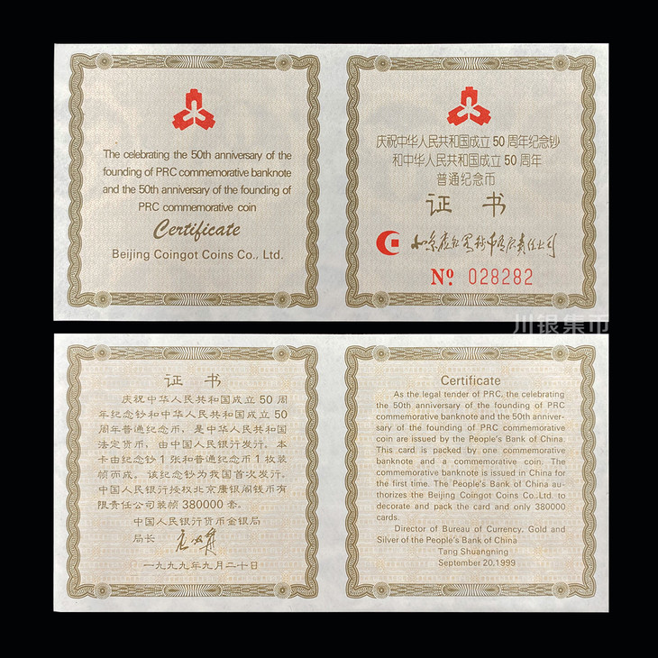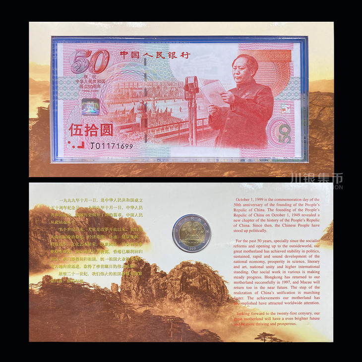 这套珍藏册由中国人民银行授权康银阁装帧发行,发行量仅有38万套,包含央行在1999年发行的建国50周年纪念钞一张和普通纪念币一枚。