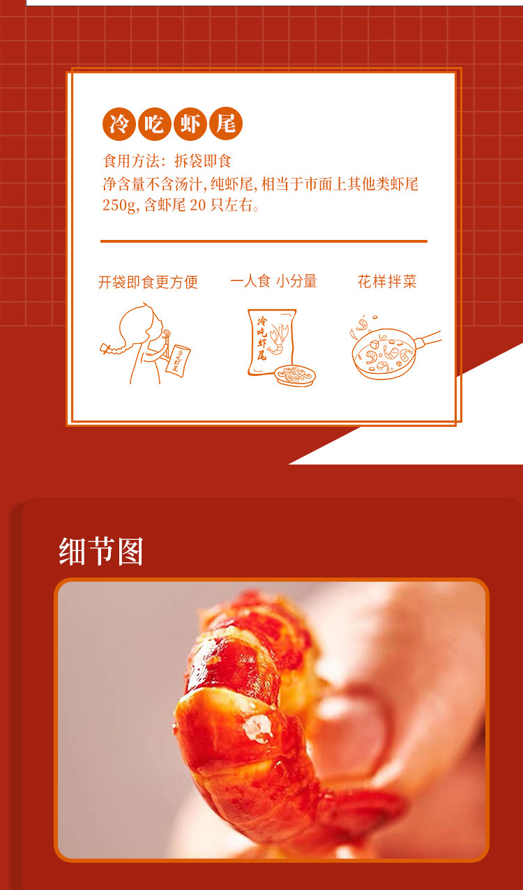 【规格】共4袋,(1袋规格:80g/袋,内含23只左右虾尾)