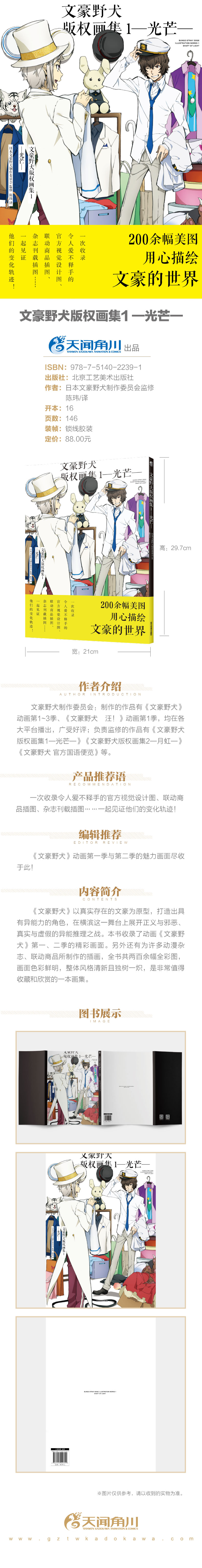 《文豪野犬版权画集1—光芒—》收录了动画《文豪野犬》第一季与第二季中的炫丽场面,以及在动画杂志刊登的精美插画、为联动商品绘制的广告插图、动画角色设计图、海报等等,共计200幅以上,内容非常丰富,画面精美,制作精良,是一部十分值得收藏纪念的画集,无论是插画欣赏爱好者还是文豪野犬的粉丝都能从中得到不少收获。《文豪野犬》系列属于人气、热度较高的IP,相关作品非常丰富,除了小说、漫画,还有动画、电影作品,深受读者喜爱。
