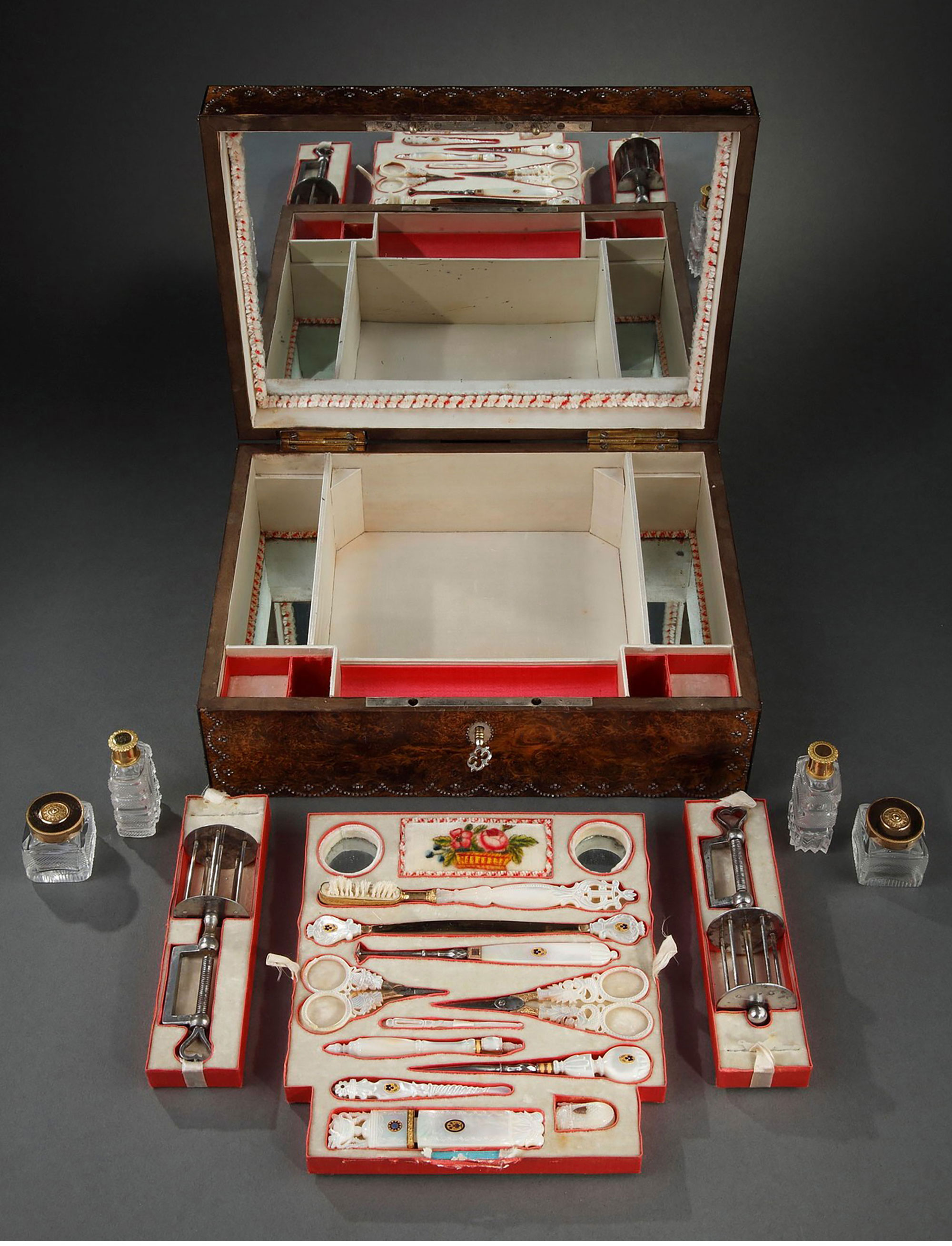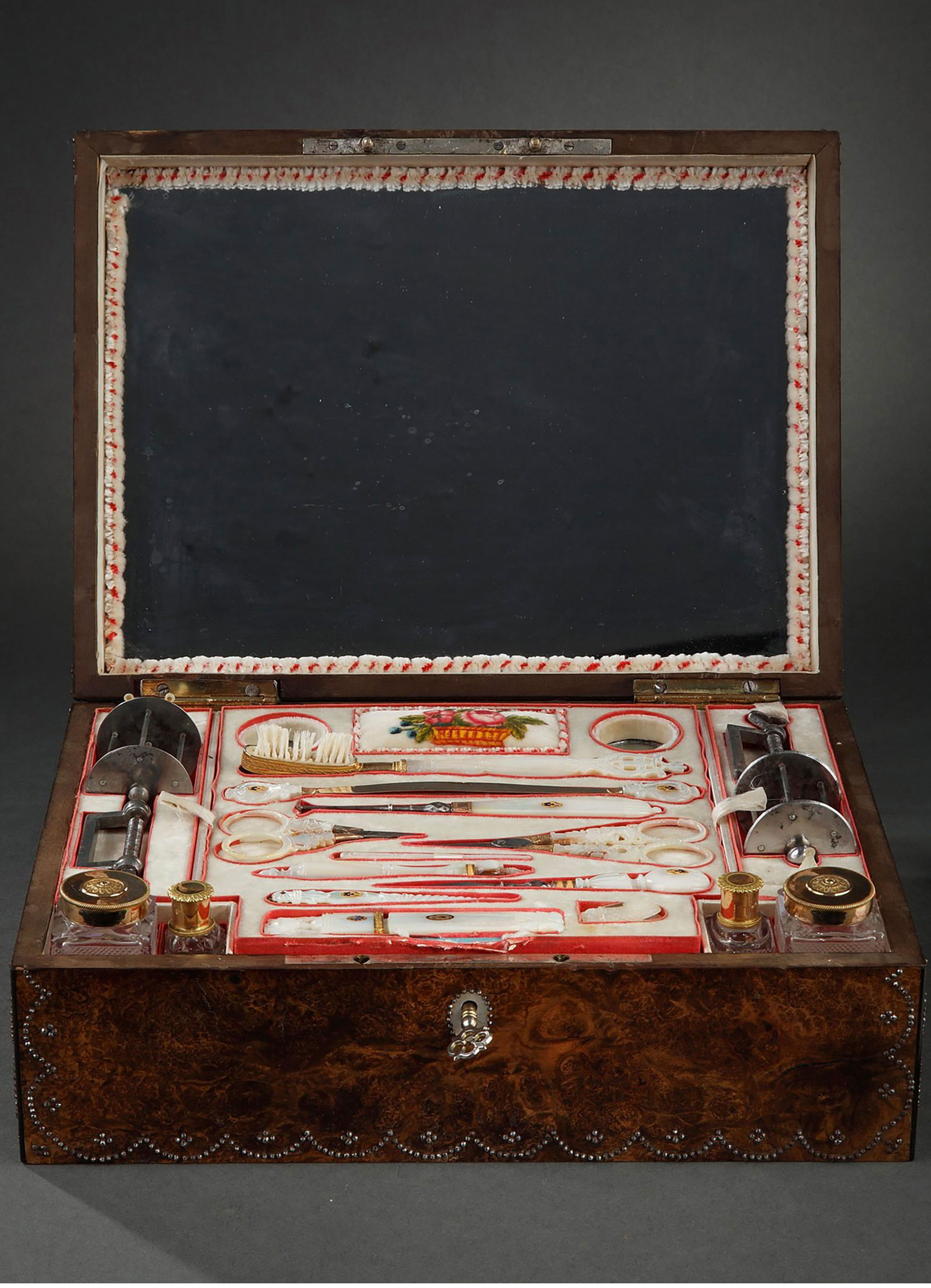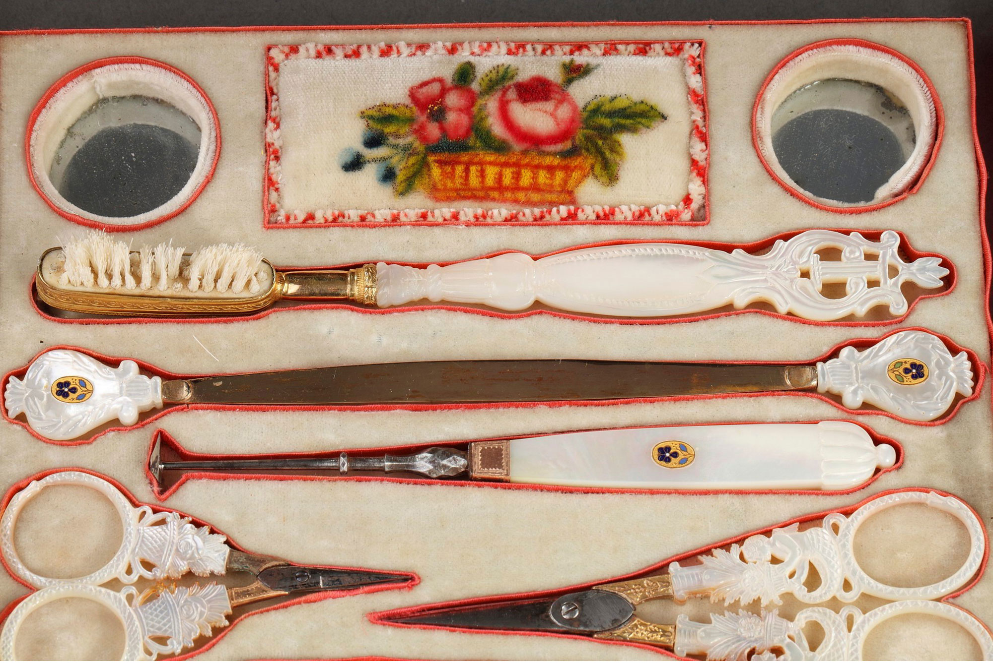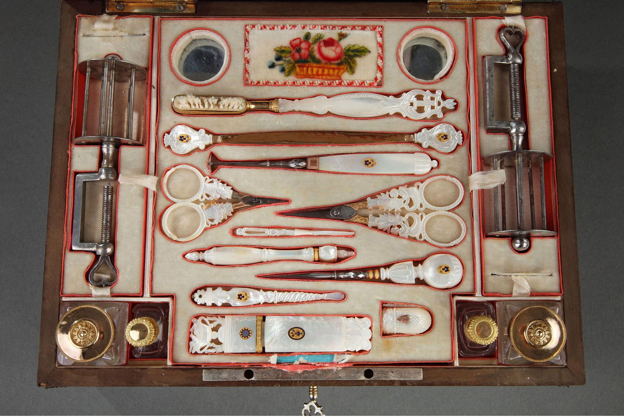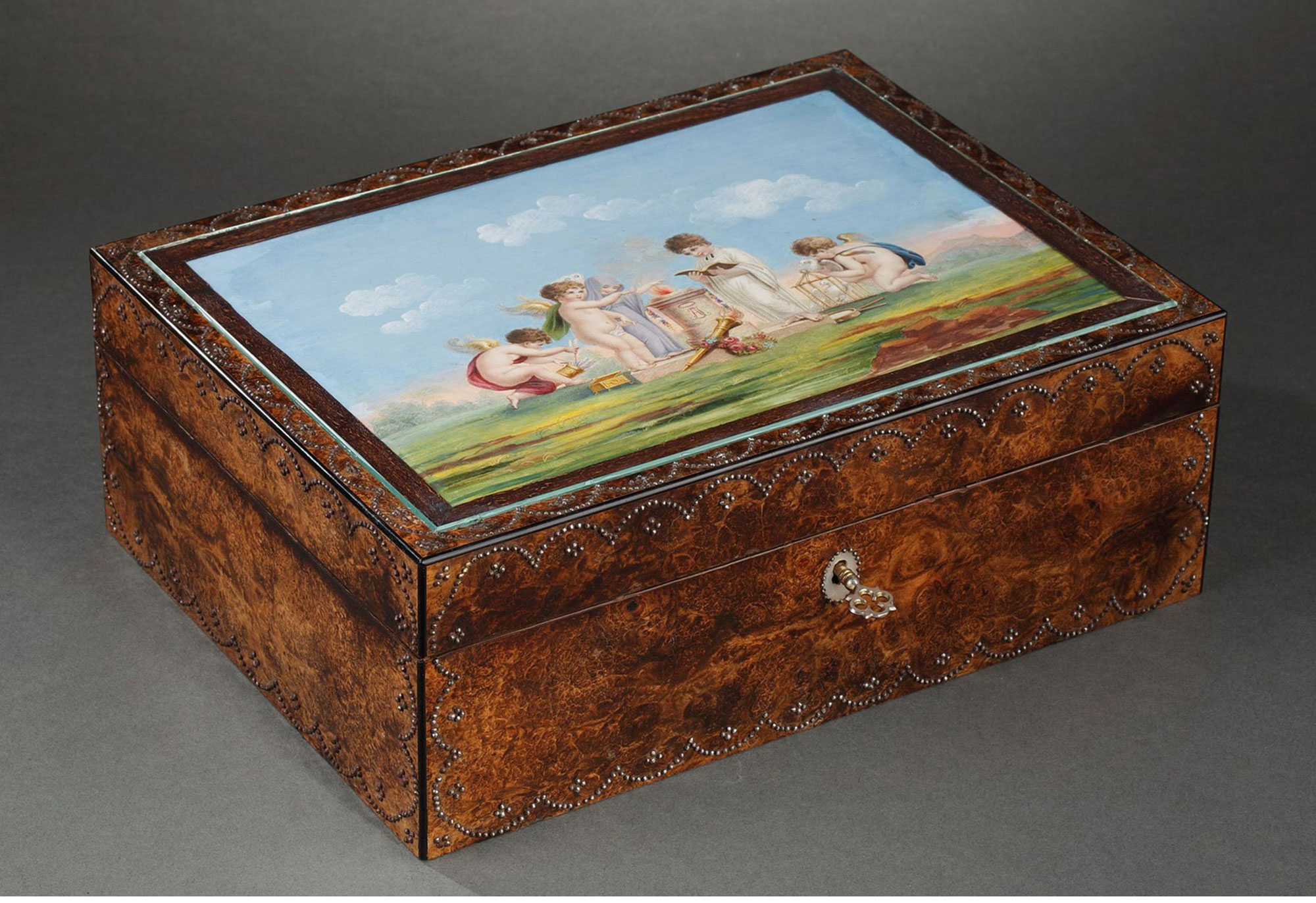 1820年代法国出品小爱神主题水彩画木质外盒母贝镶金雕花缝纫套件