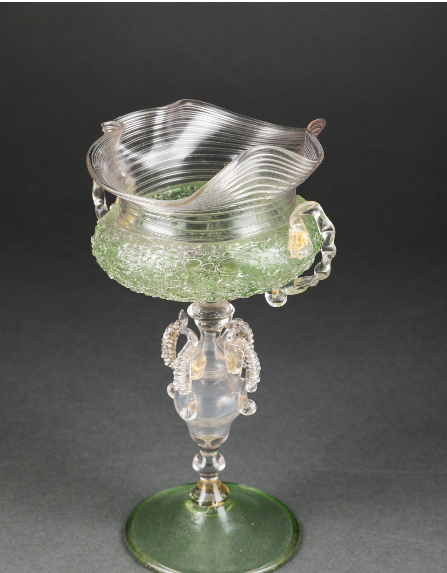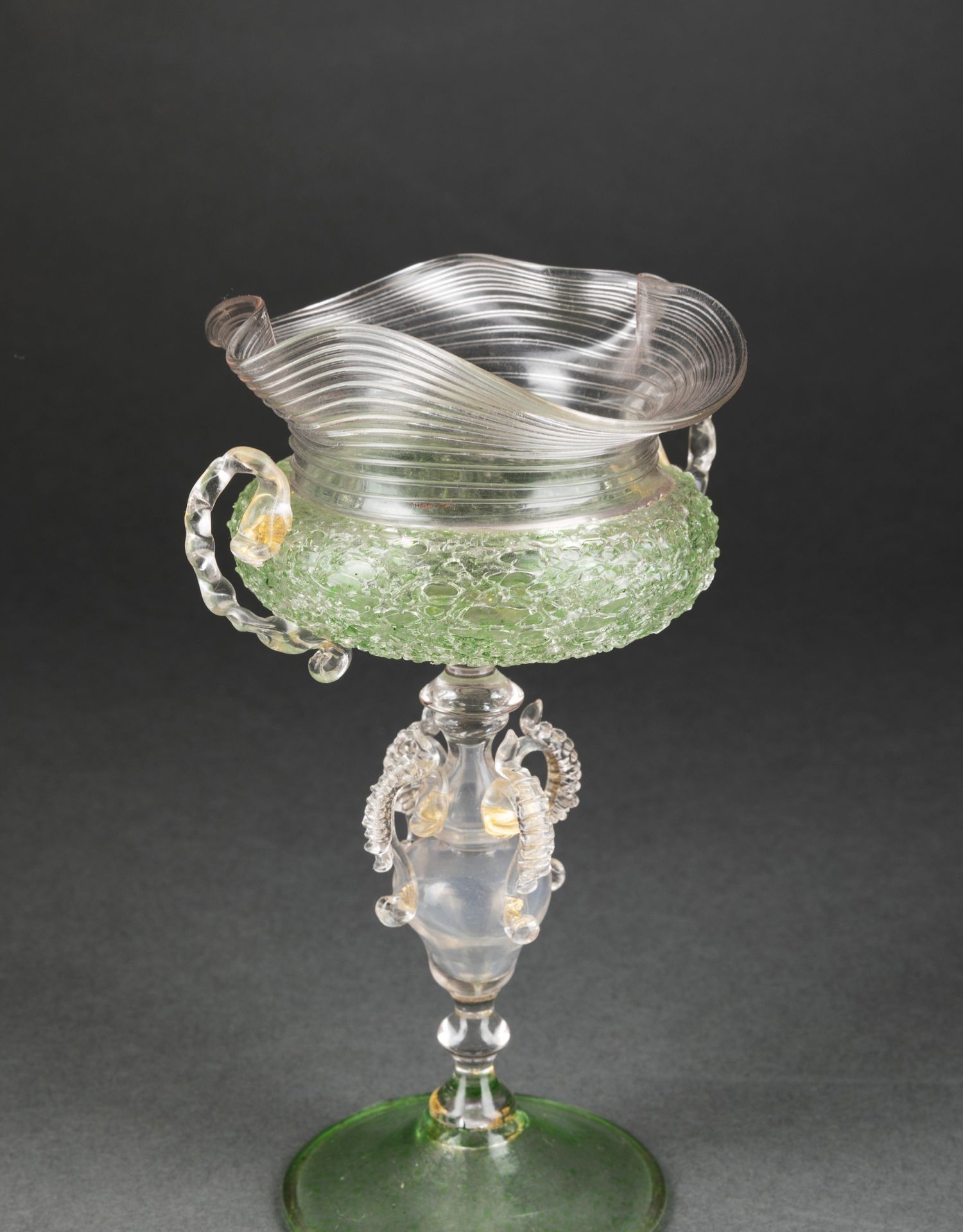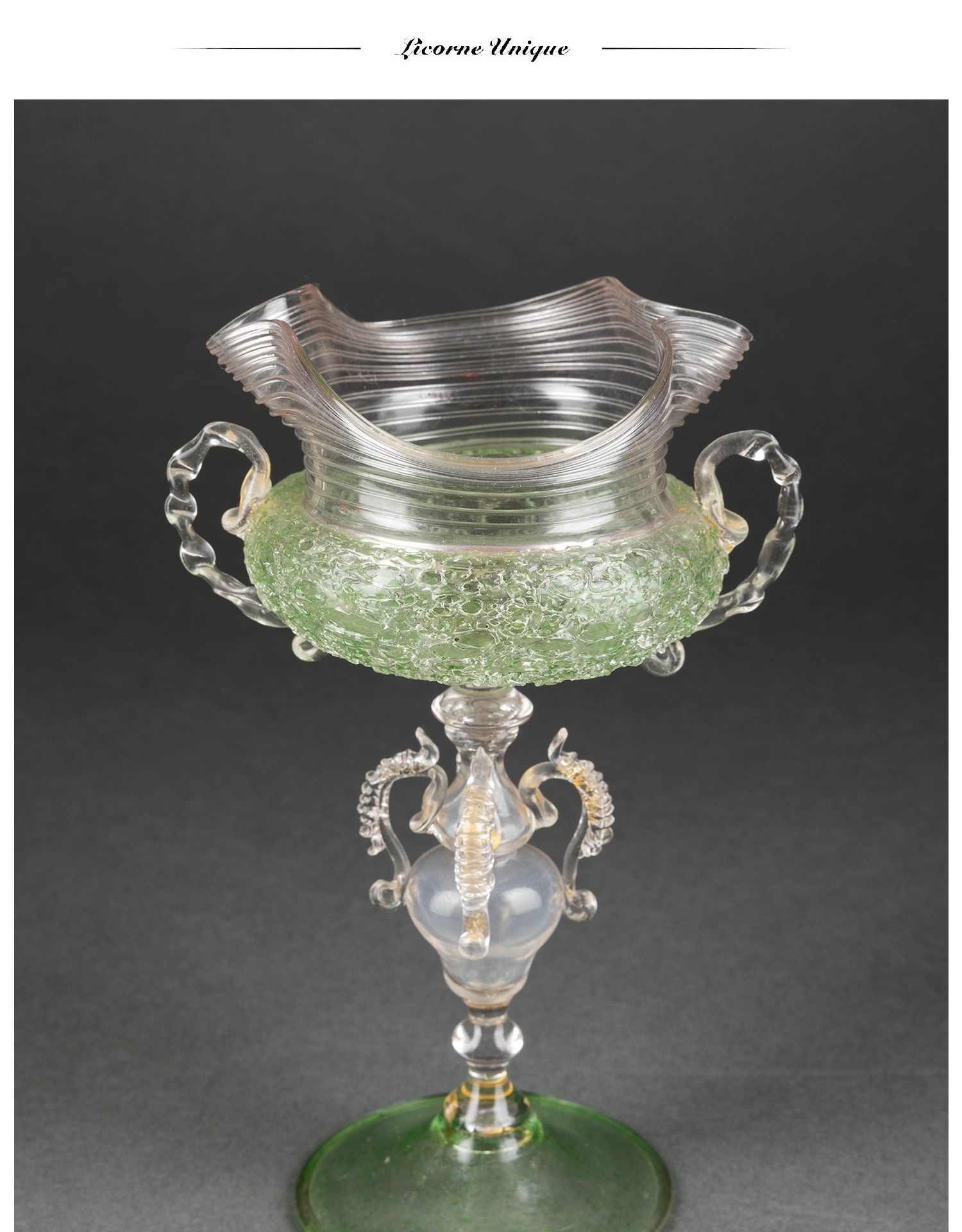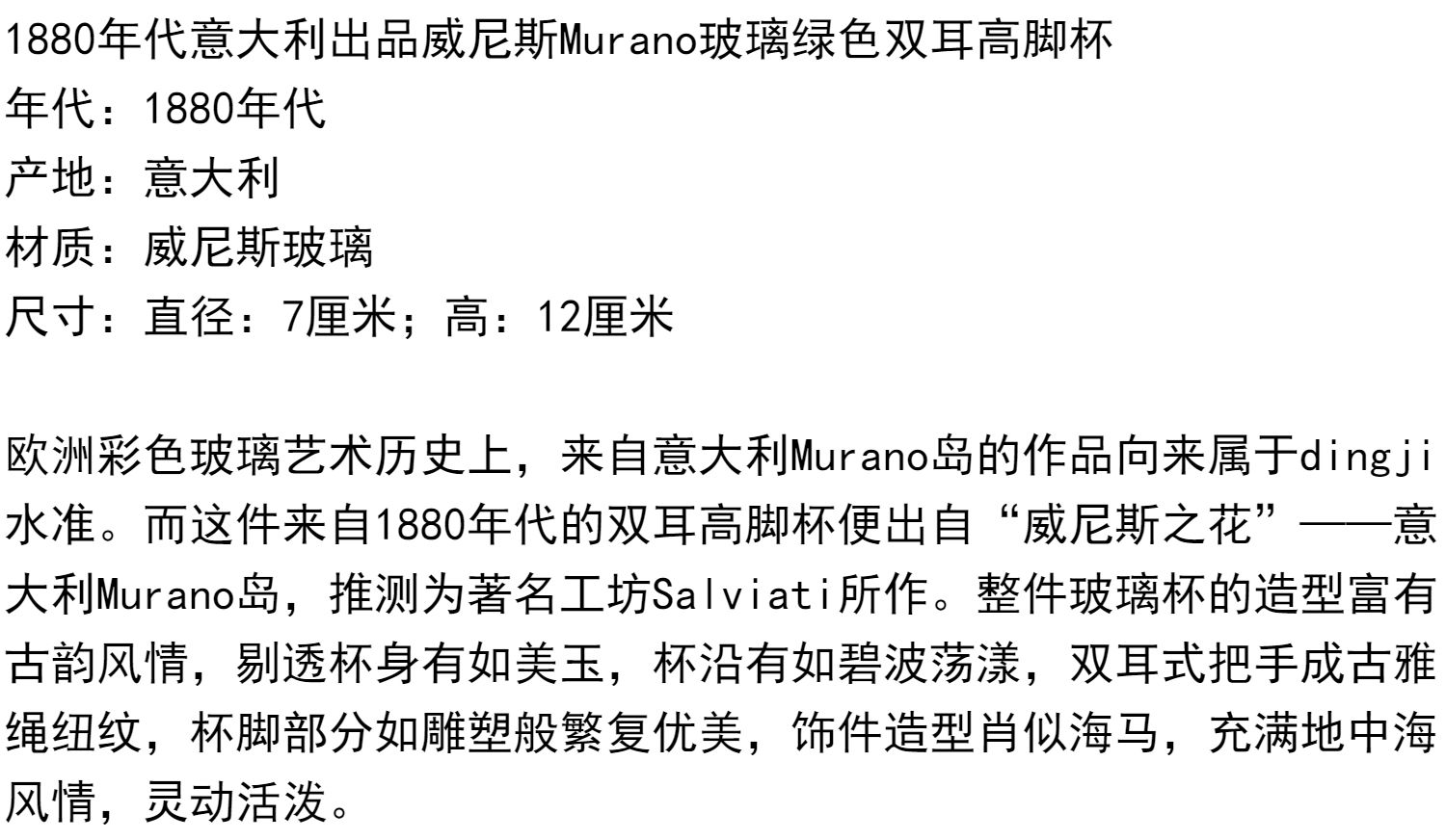 独角鹿西洋古董意大利出品威尼斯Murano玻璃绿色双耳高脚杯