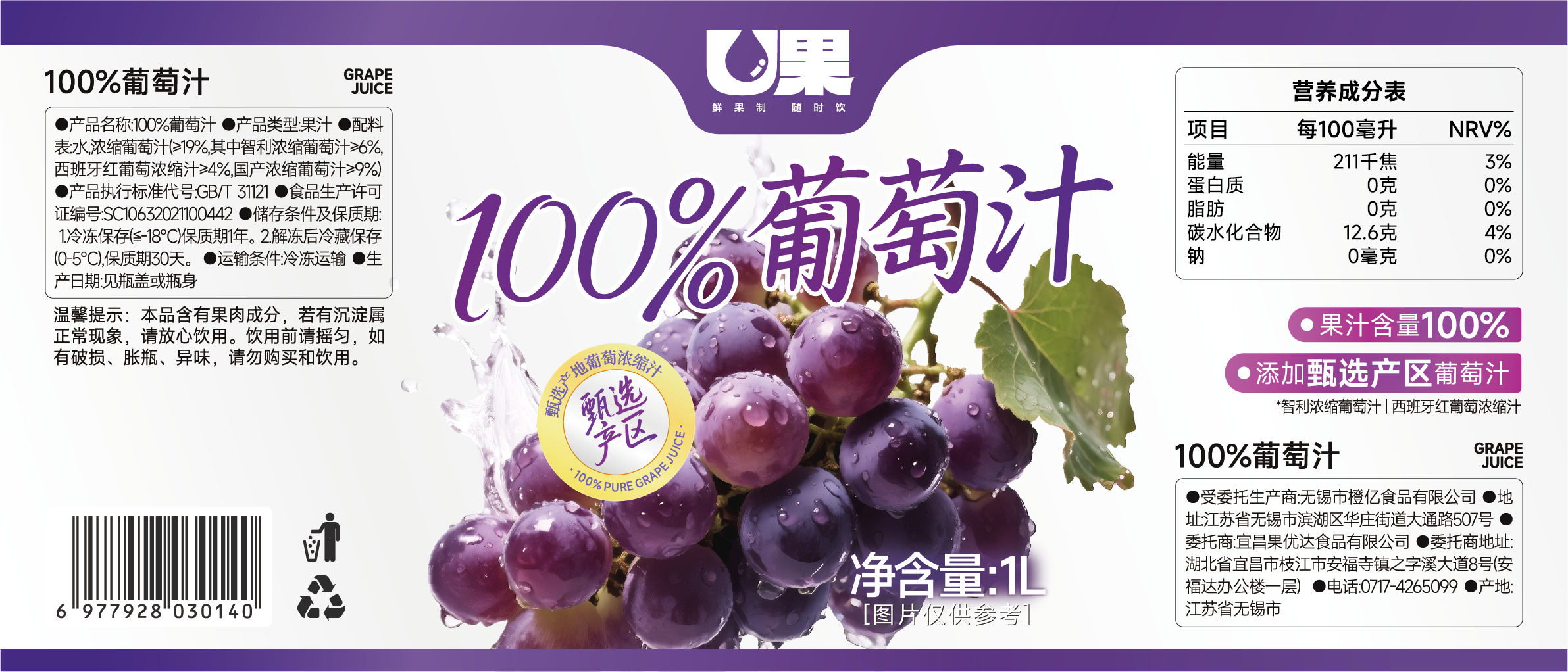U果100%葡萄汁1L冷冻果汁饮料商用咖啡奶茶店专用纯果汁原料