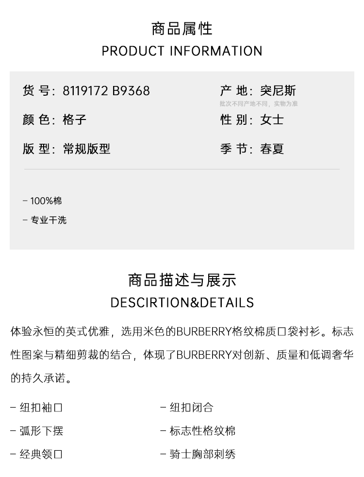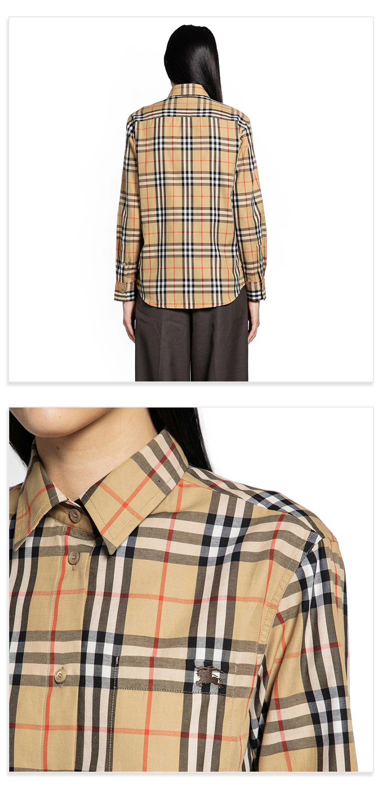 BURBERRY 巴宝莉 女士棉质格纹长袖衬衫 格子 8119172 B9368