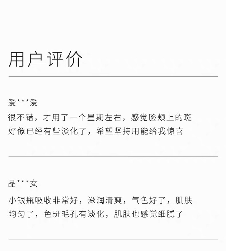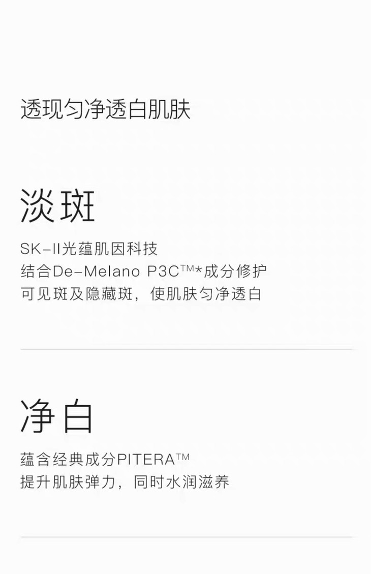 3、功效:被称为skii小银瓶,跟小灯泡的区别是淡斑精华是白色瓶子的,而小灯泡的瓶身是带点炫彩的~祛斑、针对击退底层斑点,要提亮肤色、要美白、要祛斑、要淡化痘印,抓紧用~