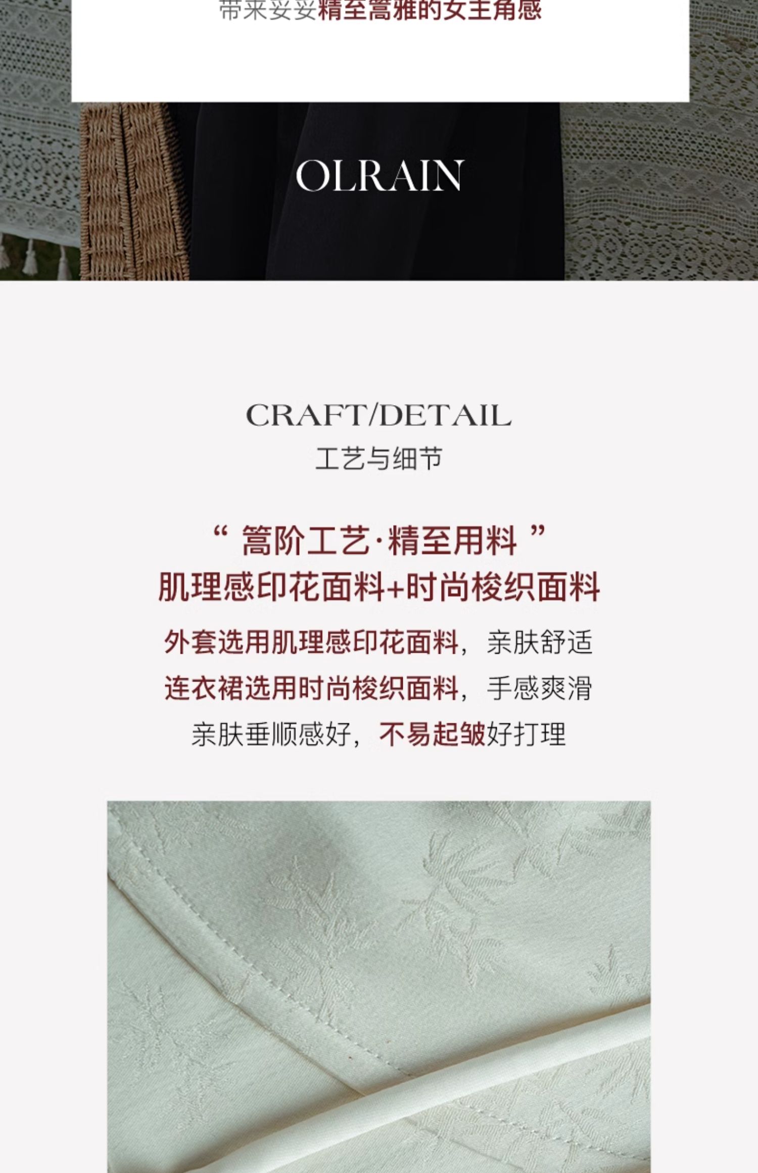 - “精致”是欧芮儿olrain品牌文化的核心,欧芮儿认为,精致的女人,不但要外在动人,更要内在迷人,内外兼修,有魅力、有气质、有内涵,自信而不自傲,优雅而不矫揉,自有万种风情而不轻浮,更不故作矜持。