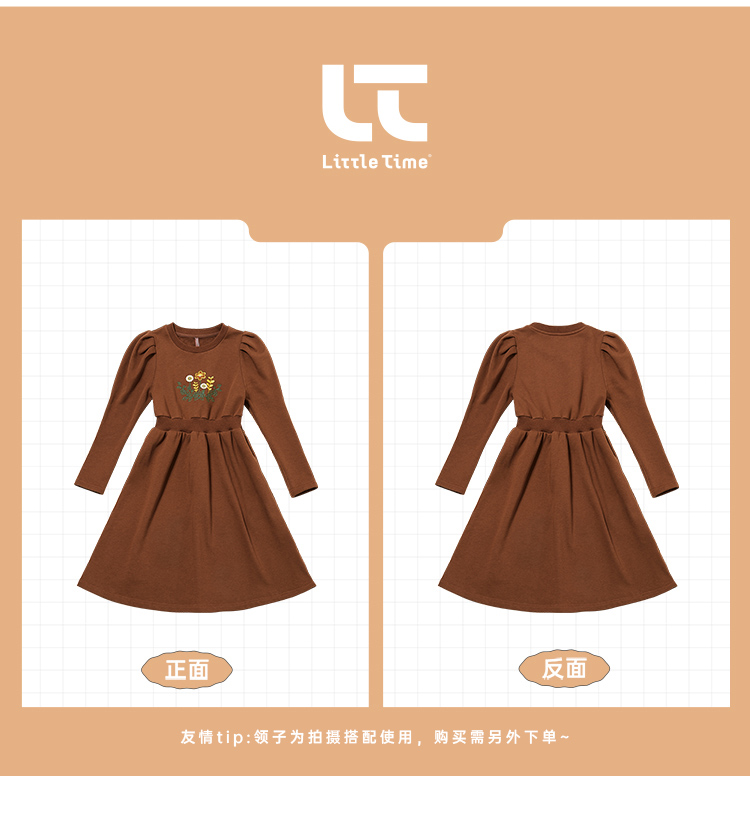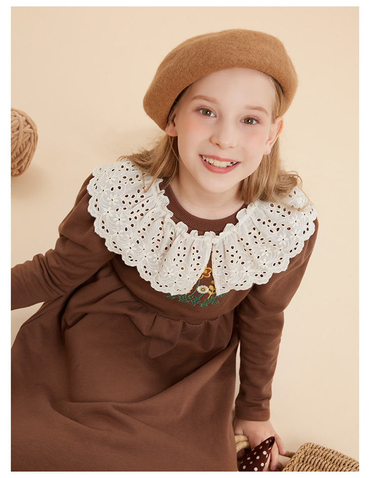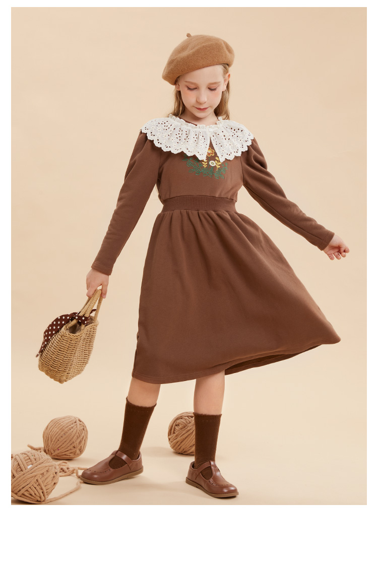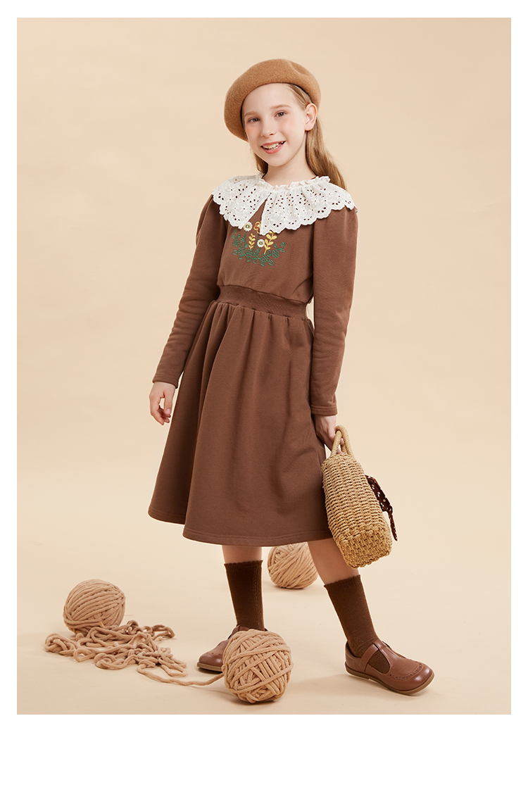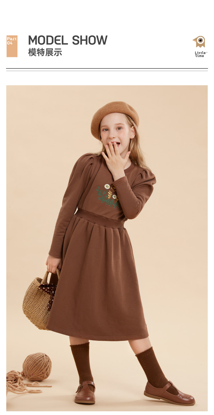 littletime女童连衣裙2022春秋新款女大童森系复古泡泡袖绣花长裙