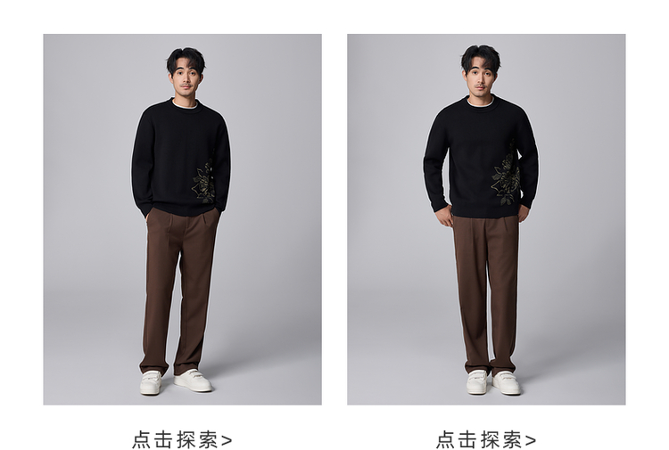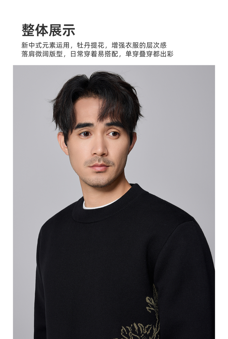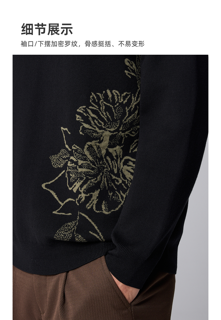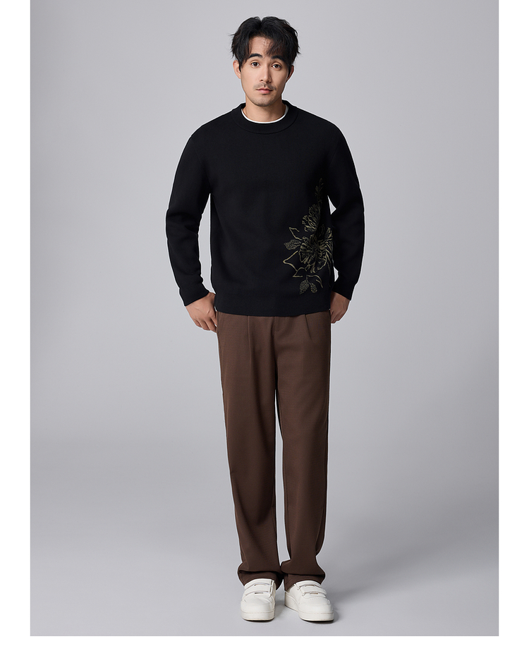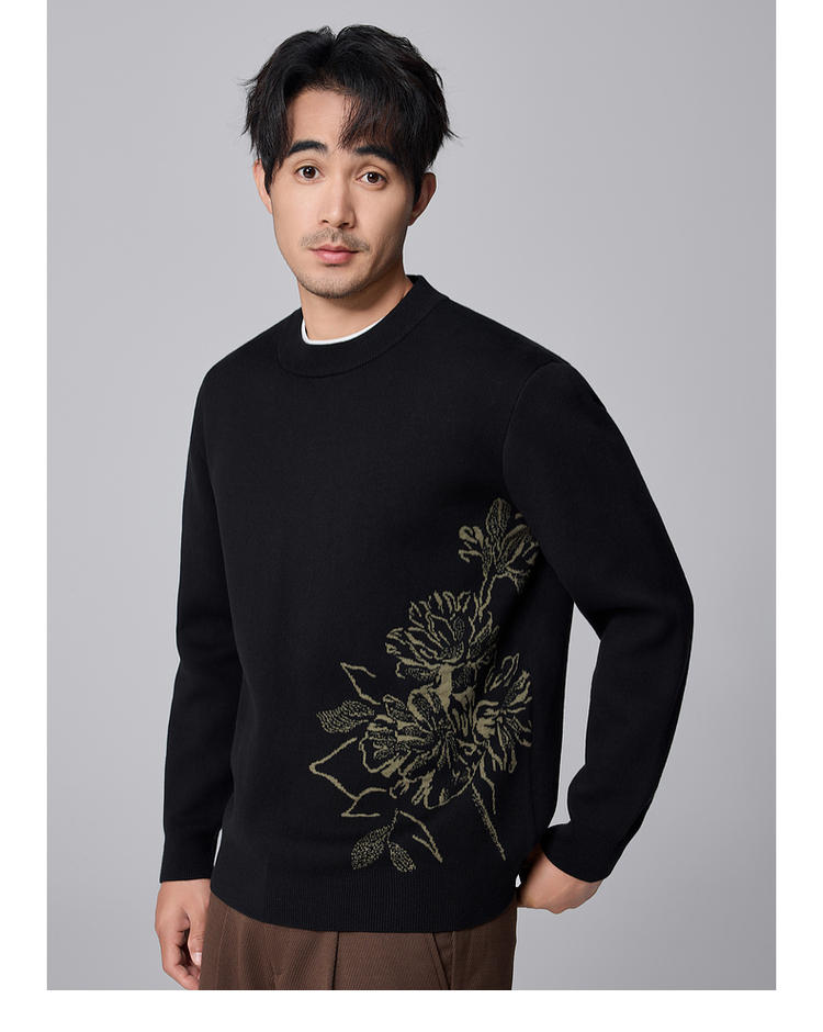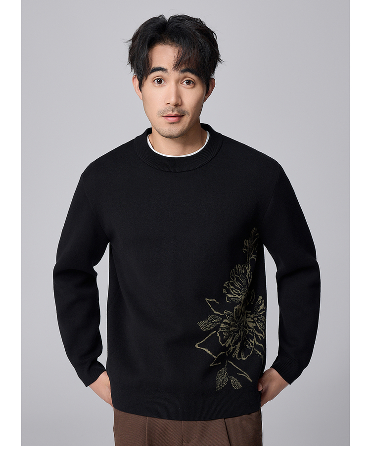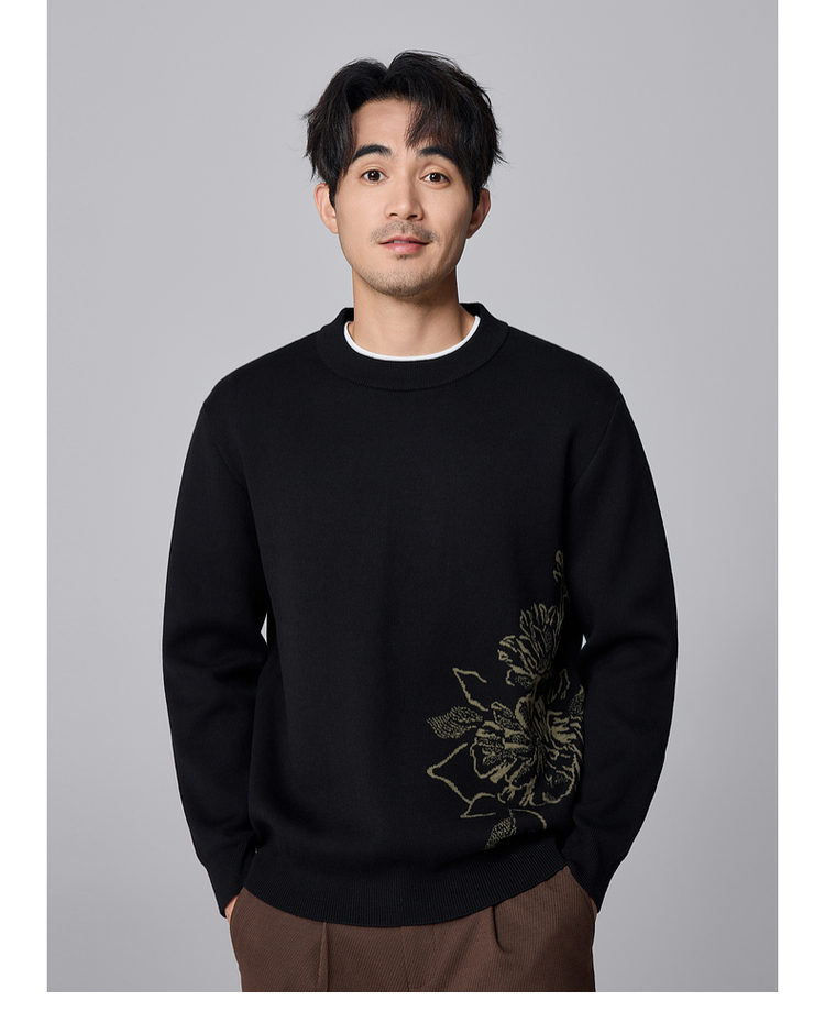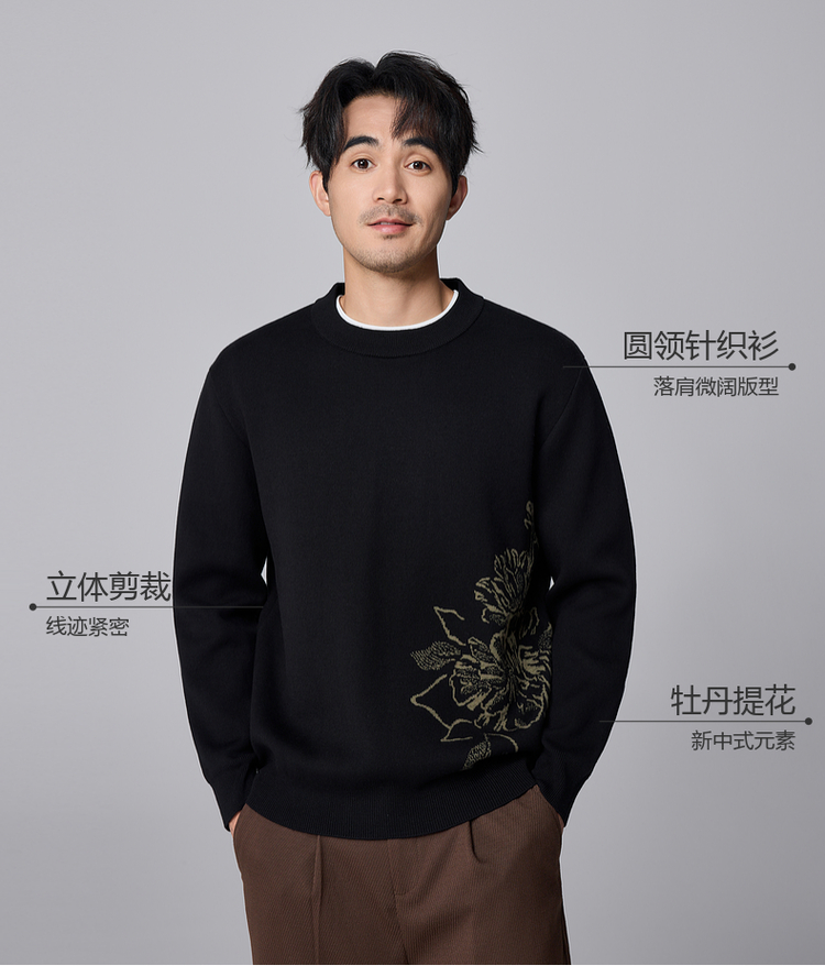 墨麦客男装新中式圆领针织衫男2024冬季新款牡丹刺绣套头男士毛衣