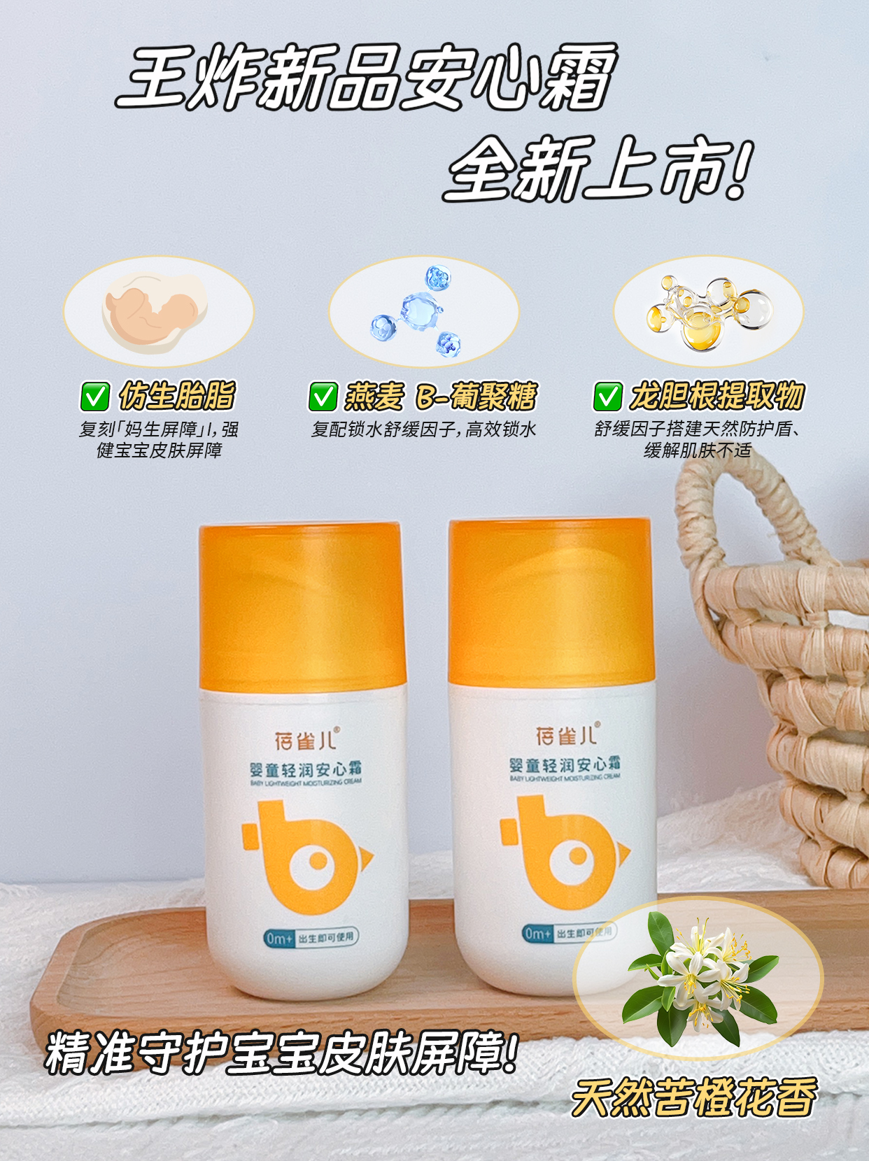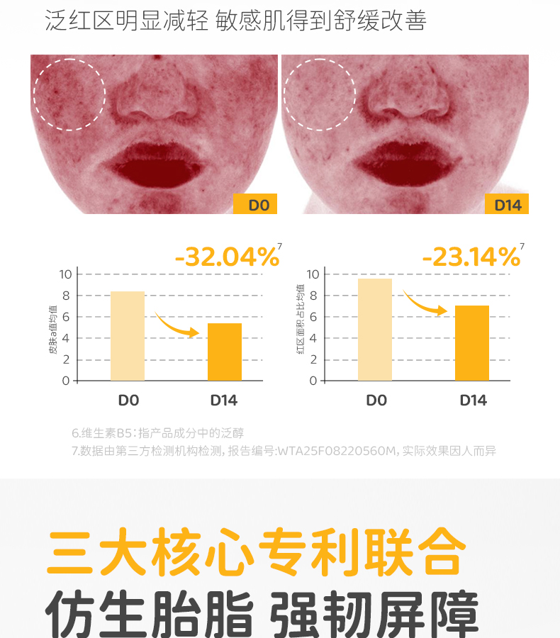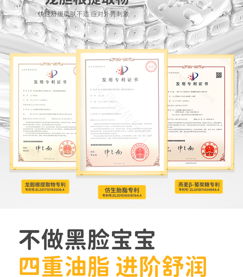核心成分:三大专利【仿生胎脂+燕麦β-葡聚糖+龙胆根专利】、泛醇、蛋黄油
