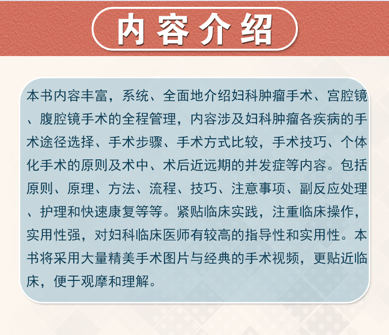 本书内容丰富,系统、全面地介绍妇科肿瘤手术、宫腔镜、腹腔镜手术的全程管理,内容涉及妇科肿瘤各疾病的手术途径选择、手术步骤、手术方式比较,手术技巧、个体化手术的原则及术中、术后近远期的并发症等内容。包括原则、原理、方法、流程、技巧、注意事项、副反应处理、护理和快速康复等等。紧贴临床实践,注重临床操作,实用性强,对妇科临床医师有较高的指导性和实用性。本书将采用大量精美手术图片与经典的手术视频,更贴近临床,便于观摩和理解。