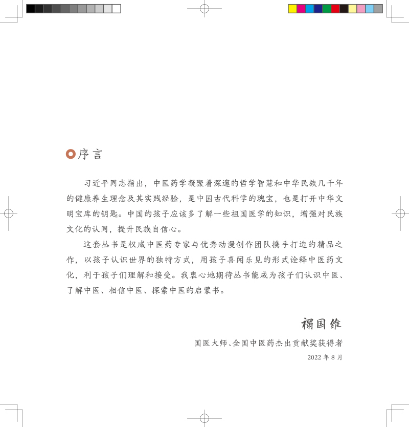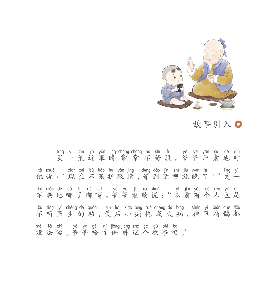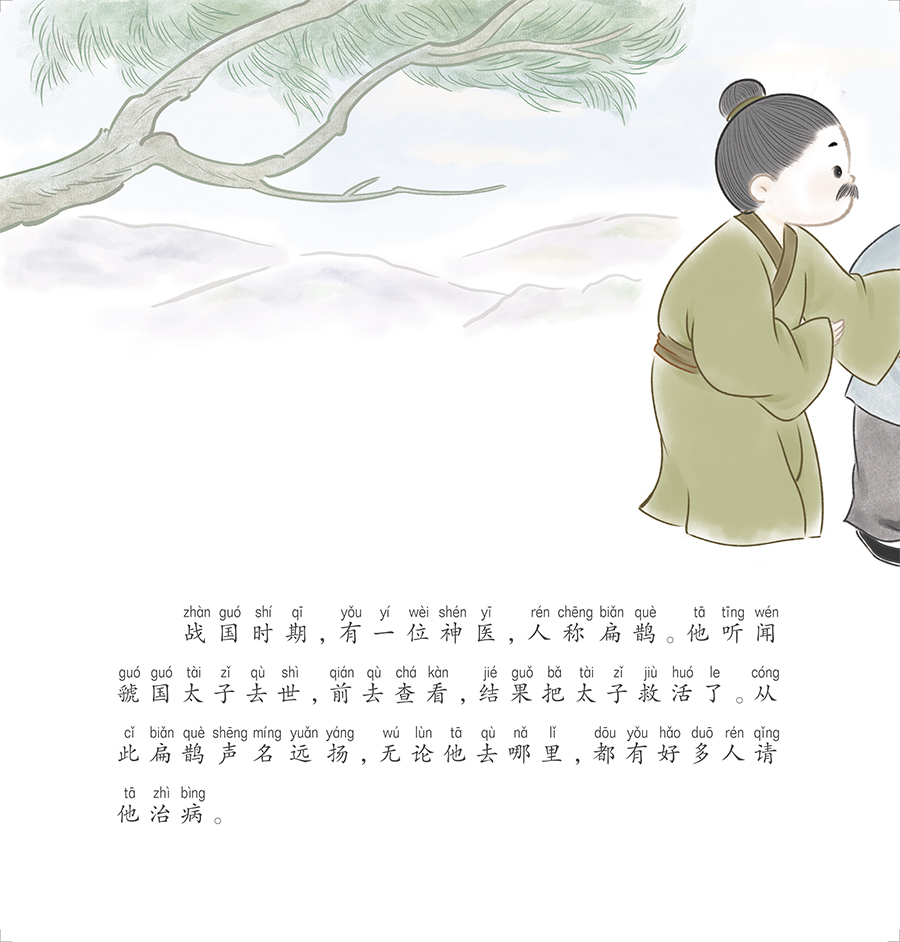 内容提要:“中医启蒙系列丛书”以《黄帝内经》为创作灵感来源,设计了“岐黄爷爷”“灵一”“素素”“呦呦”四个富有中医特色的卡通角色,采用独具意境的中式美学配色,画风可爱灵动,图书下设角色介绍、故事导入、名医故事、填色互动、故事梗概五大模块。扁鹊,春秋战国时期名医,中国古代十大名医,从师于长桑君,尽传其医术,最终修得高超医术。扁鹊善于运用四诊,尤其是脉诊和望诊来诊断疾病,被称为“脉学之宗”。本书讲述了扁鹊见到蔡桓公,三次告知其病情,蔡桓公不信,最终病入膏肓而死的故事。