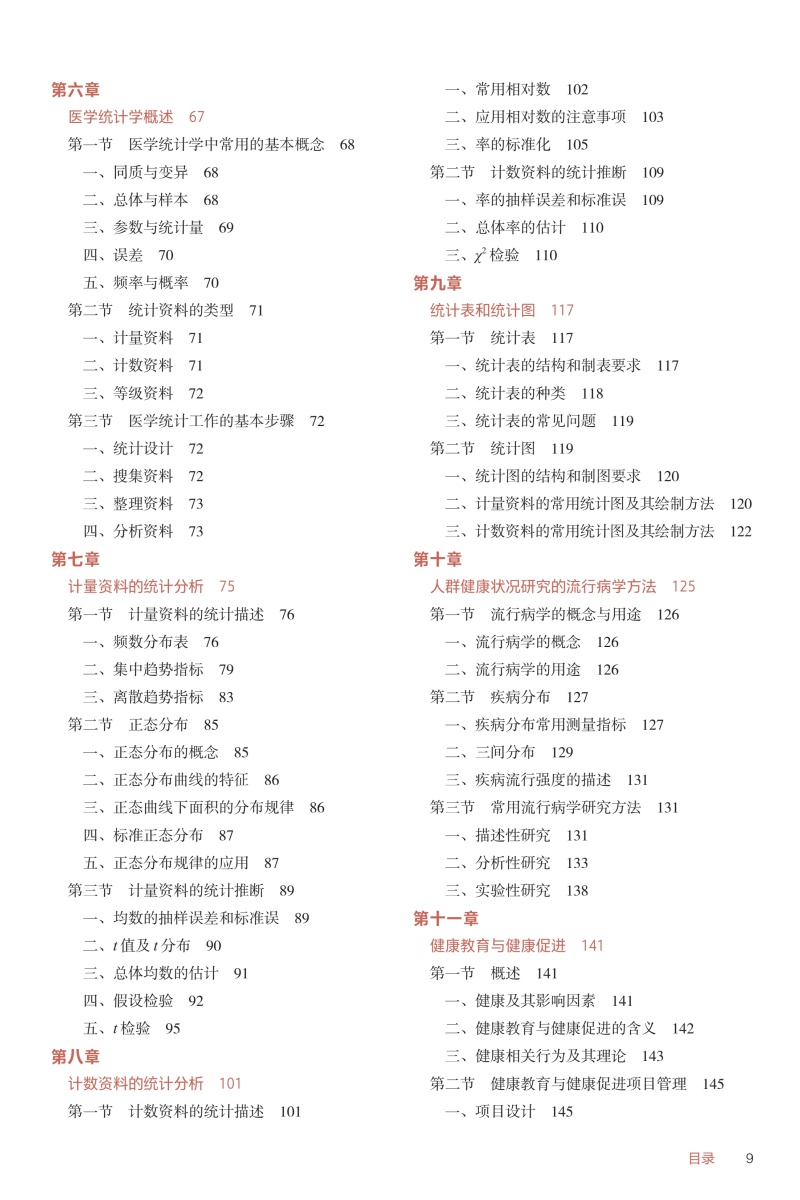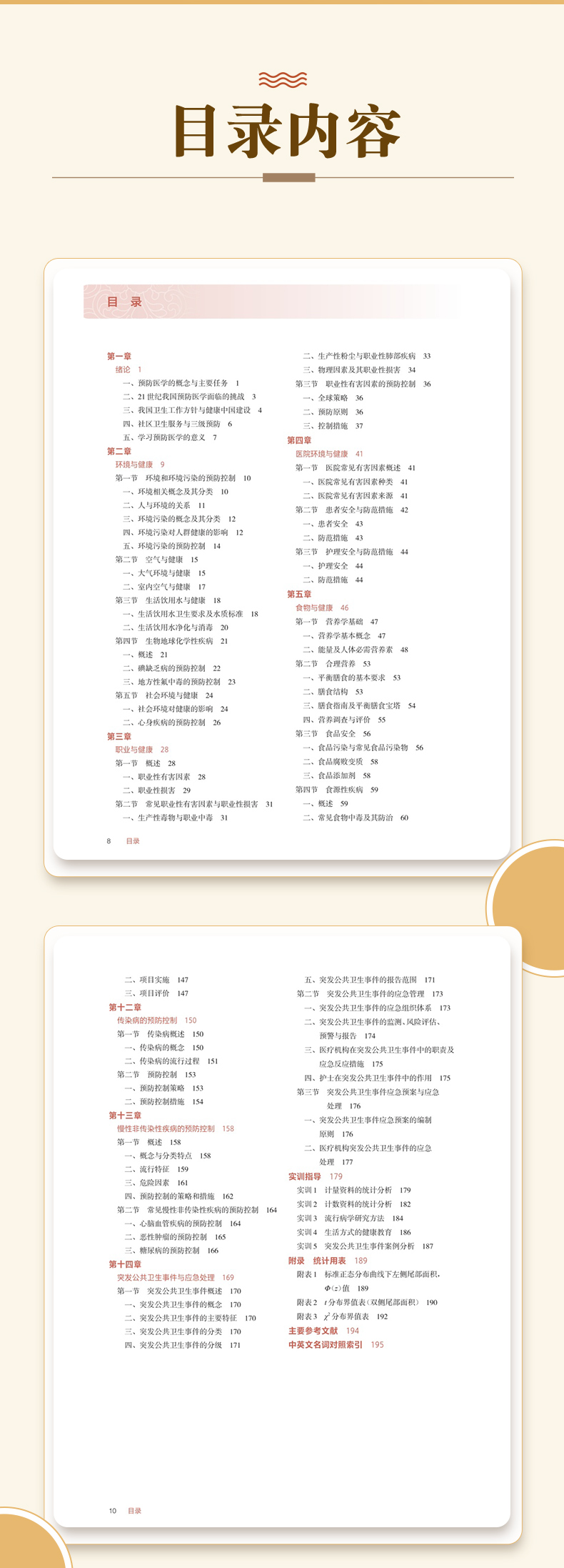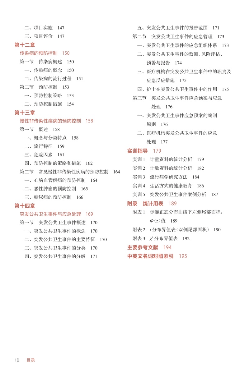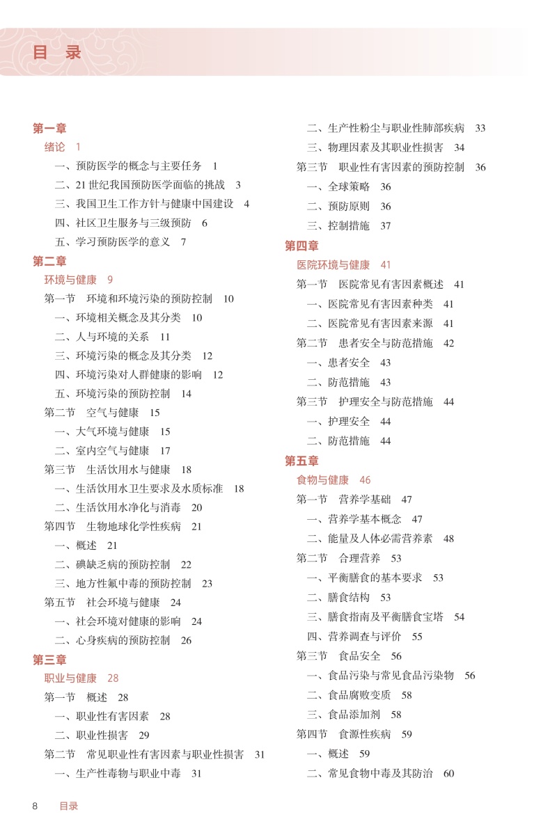 本教材为高等职业教育专科护理类专业“十四五”规划教材、国家卫生健康委员会“十四五”规划教材之一。《预防医学概论》第2版学时调整为总学时54,理论学时44,实践学时10;内容调整为四个模块,即预防保健策略及措施、环境与健康、医学研究方法和疾病的预防与控制。其中预防保健策略及措施主要包括三级预防、健康教育与健康促进、社区卫生服务;环境与健康主要包括生活环境(空气、住宅、水、饮食)、职业环境、医院环境、社会环境与健康;医学研究方法包括医学统计学、流行病学;疾病的预防与控制包括传染病、慢性病、地方病及突发公共卫生事件的预防与控制。根据护理专业学习课程及专业学习特点,疾病预防与控制篇章的传染病部分,去除掉传染病个论部分,其他部分内容以新的医学模式和健康观为指导思想,立足专业的特点,贯彻三级预防的观念,进行整合和调整,以促进预防医学与护理专业课程的有机结合,实现树立预防为主、防治结合和社会预防的观念,运用预防医学的思维方法和医学研究的方法和手段,开展社区公共卫生、疾病防治和人群预防保健工作。