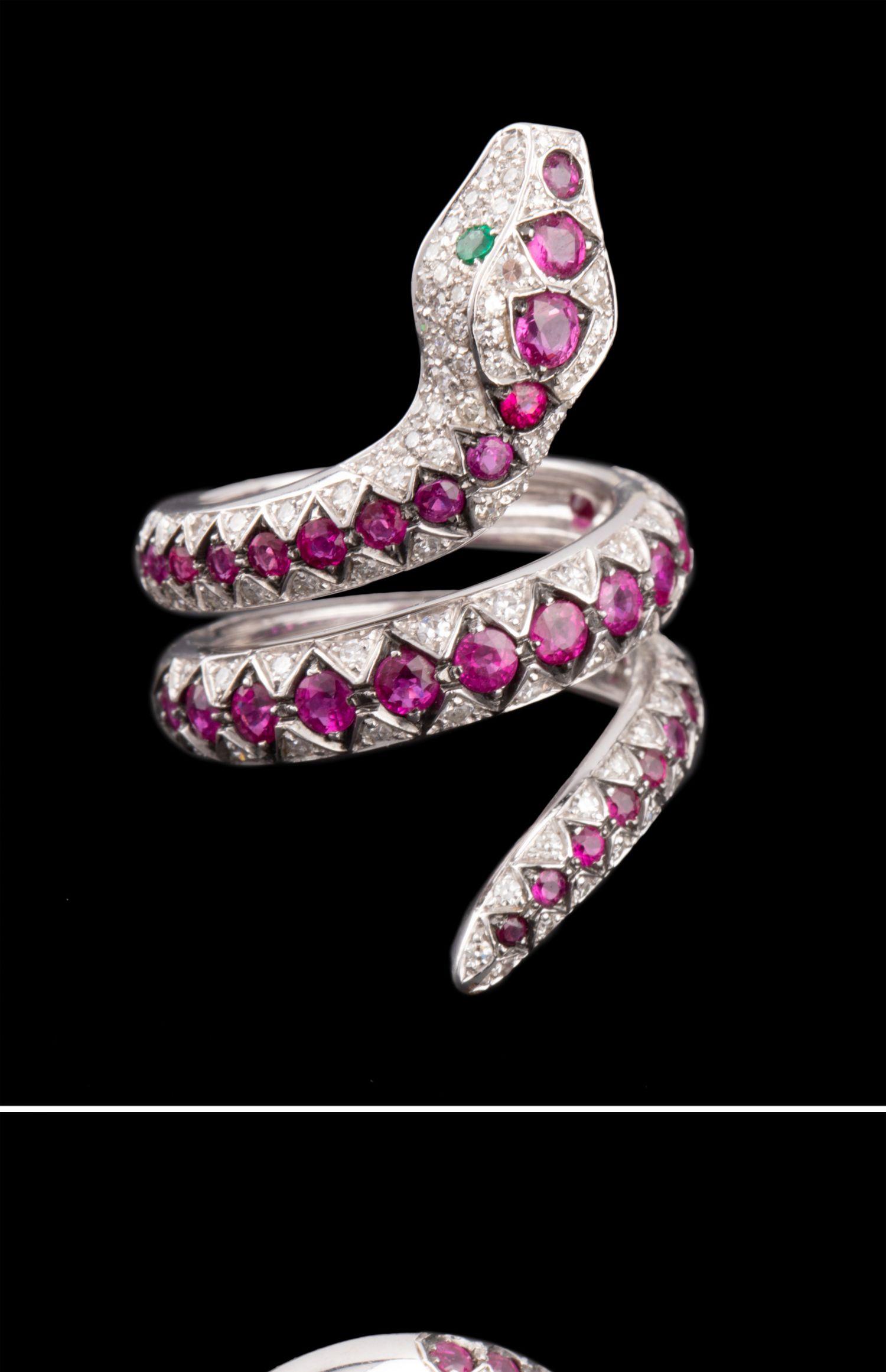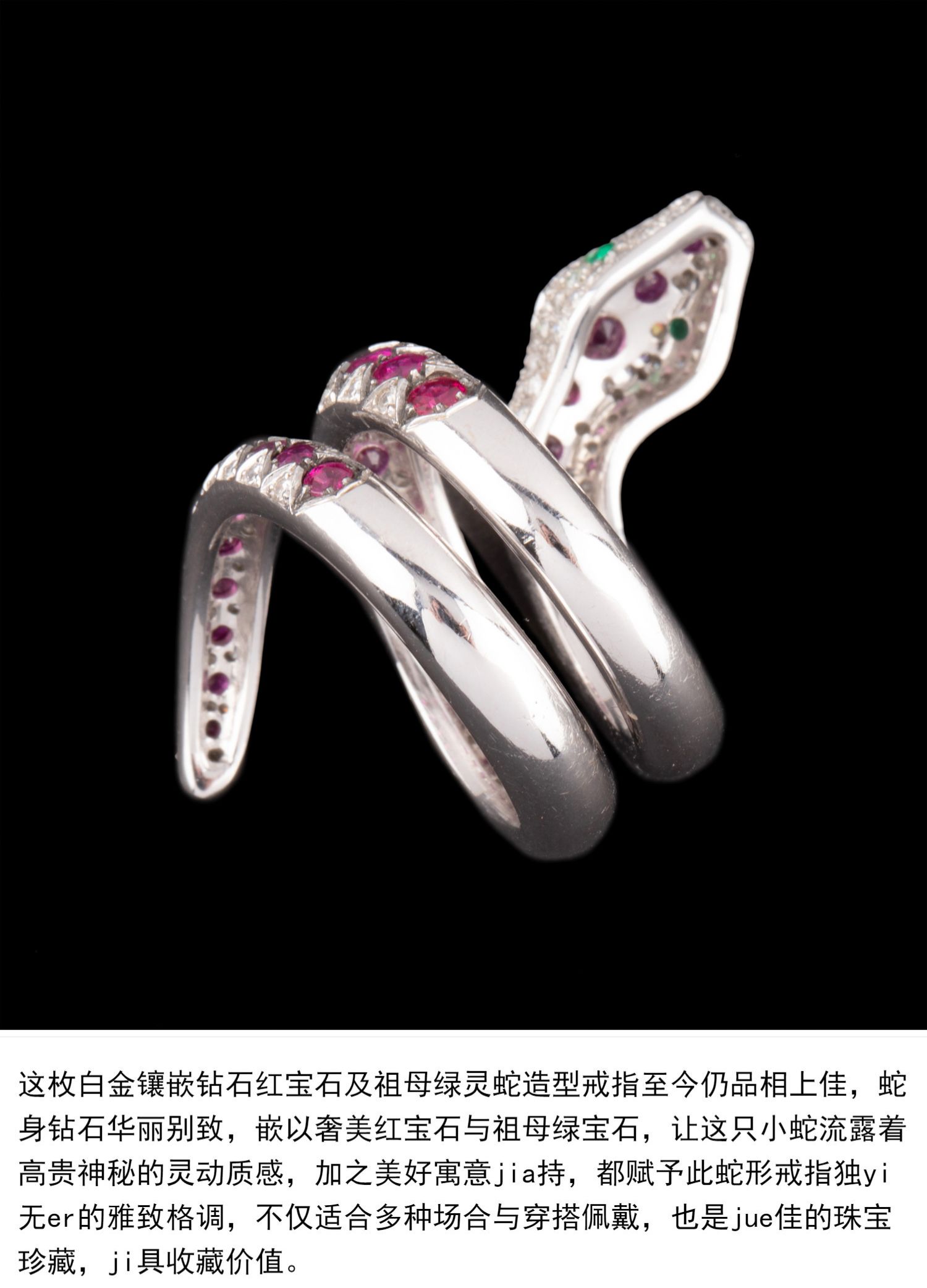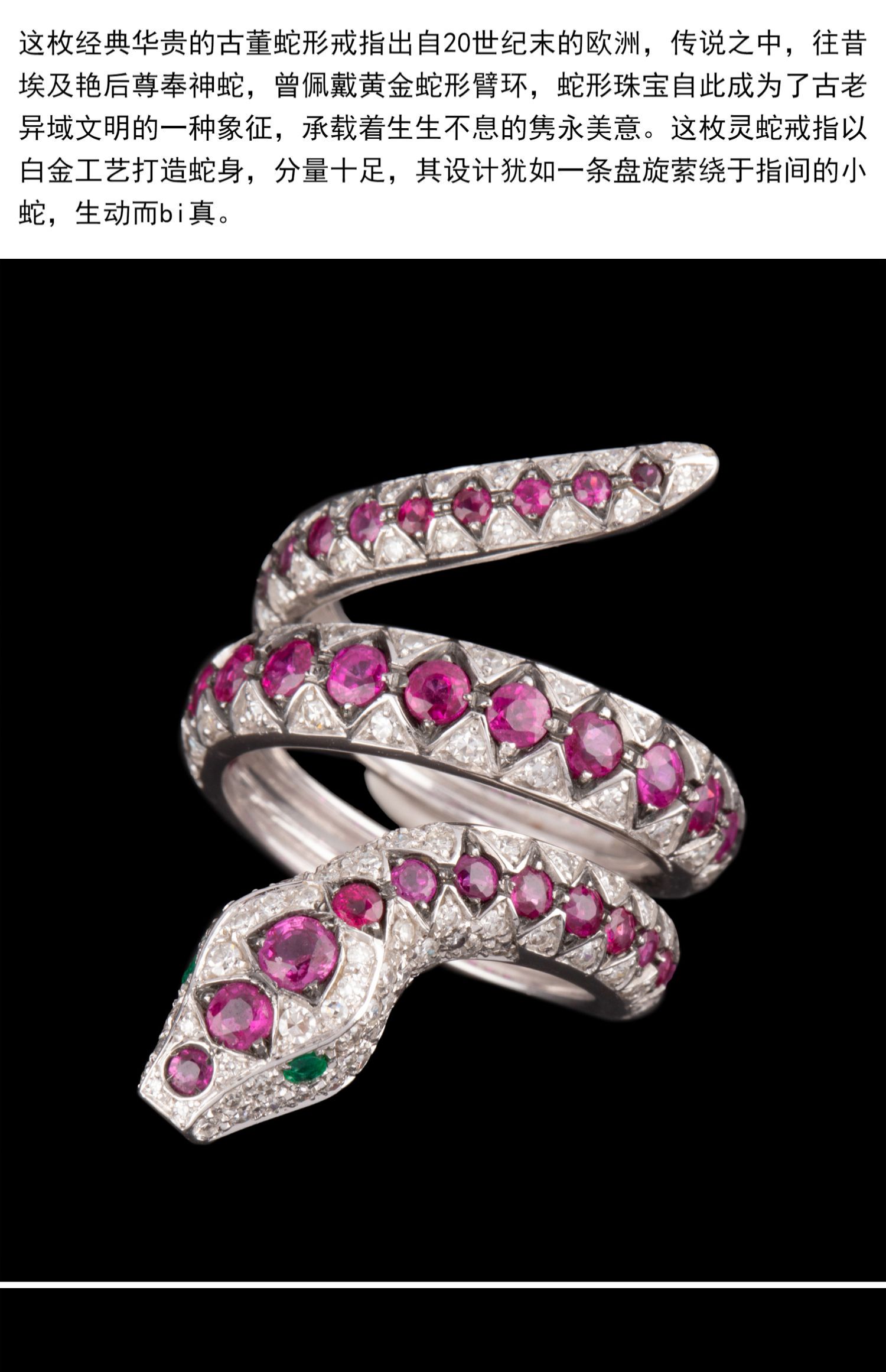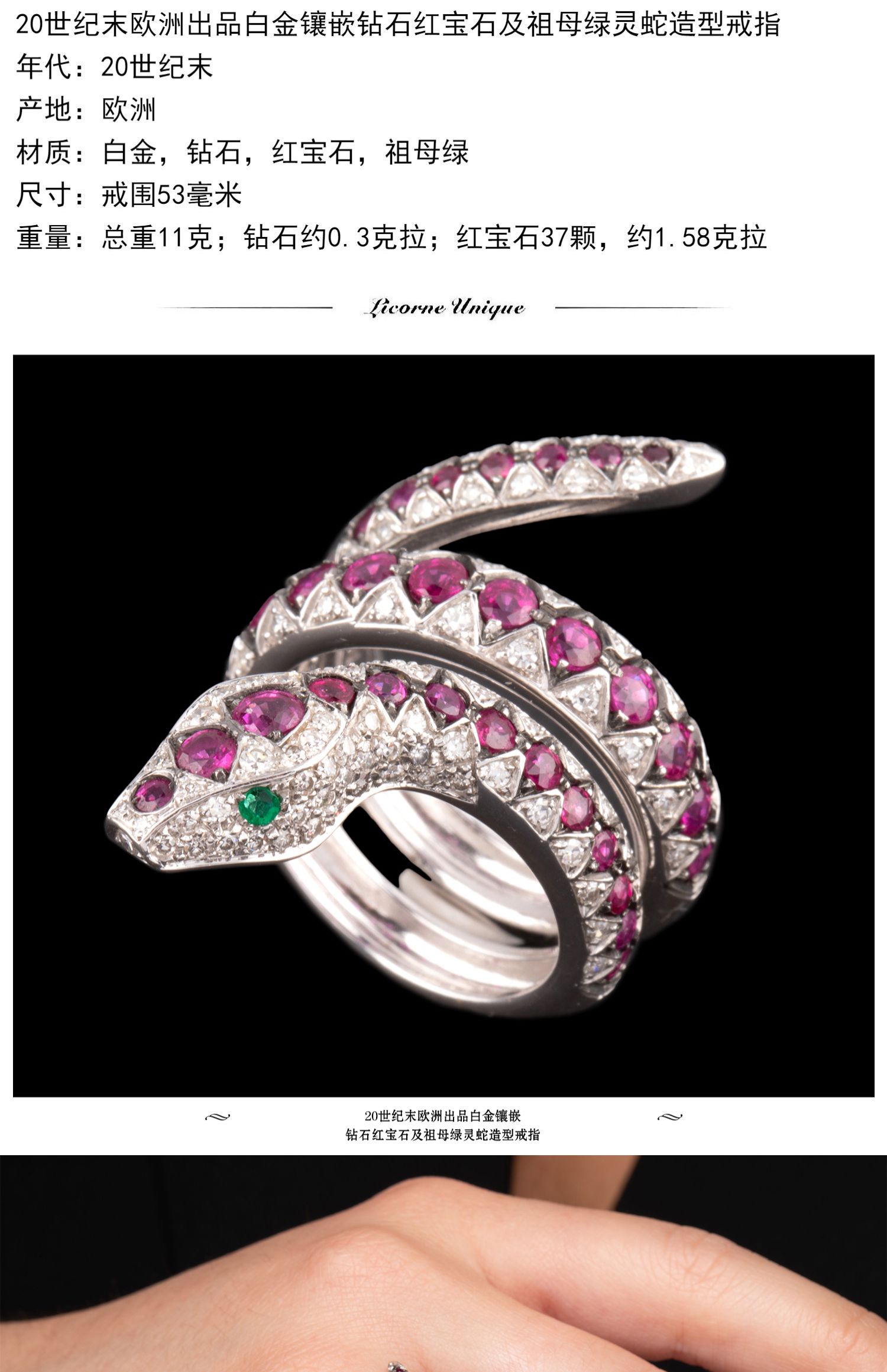 独角鹿西洋古董珠宝首饰白金镶嵌钻石红宝石祖母绿灵蛇造型戒指