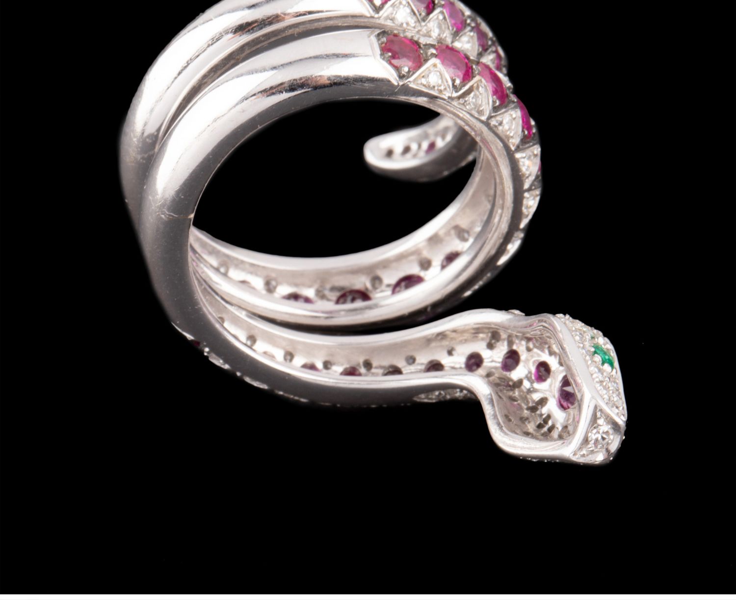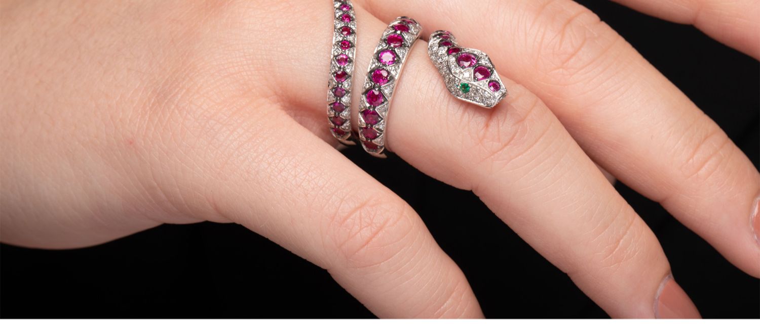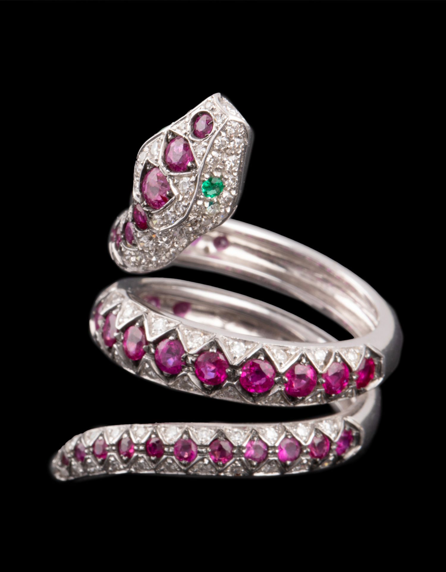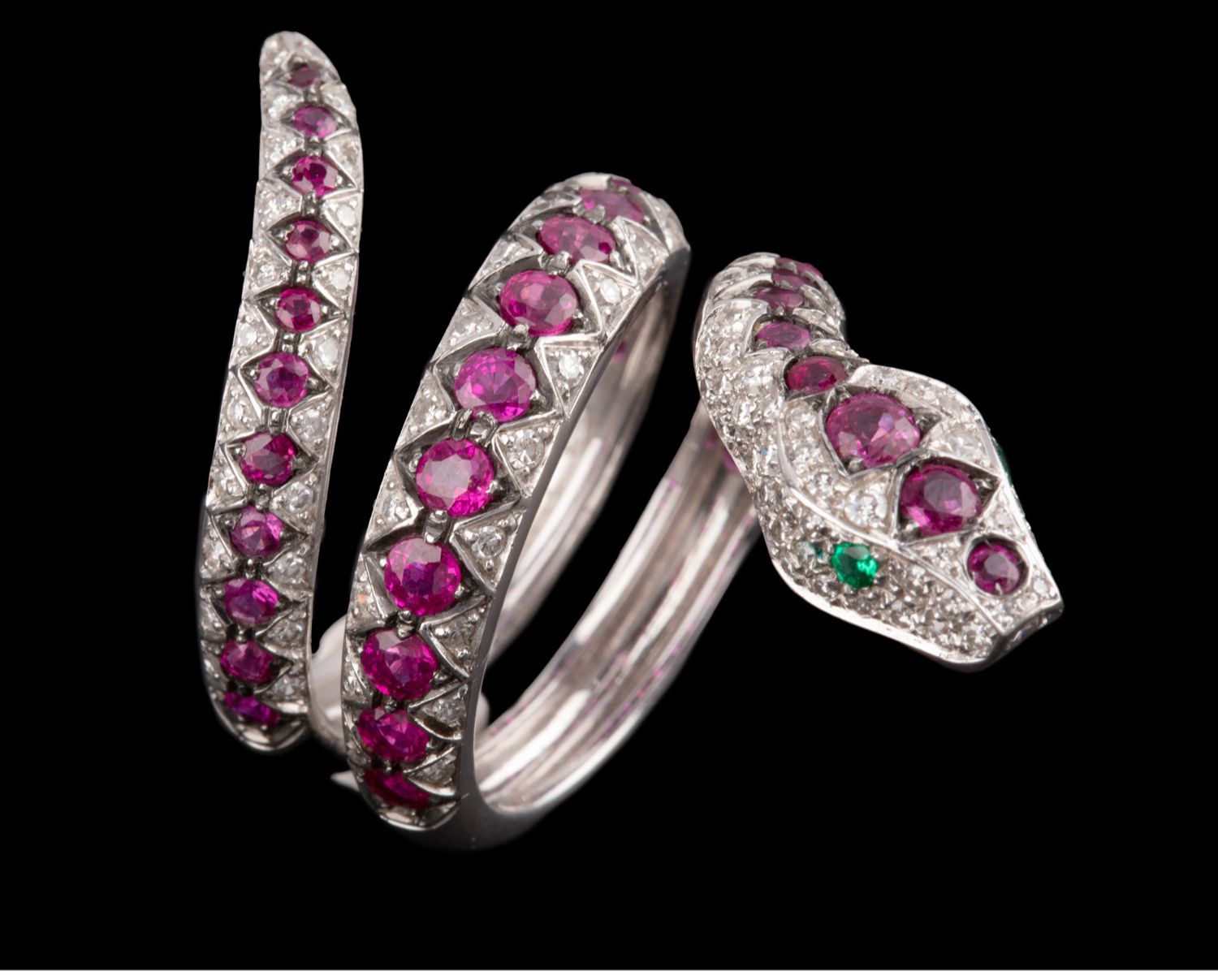 独角鹿西洋古董珠宝首饰白金镶嵌钻石红宝石祖母绿灵蛇造型戒指