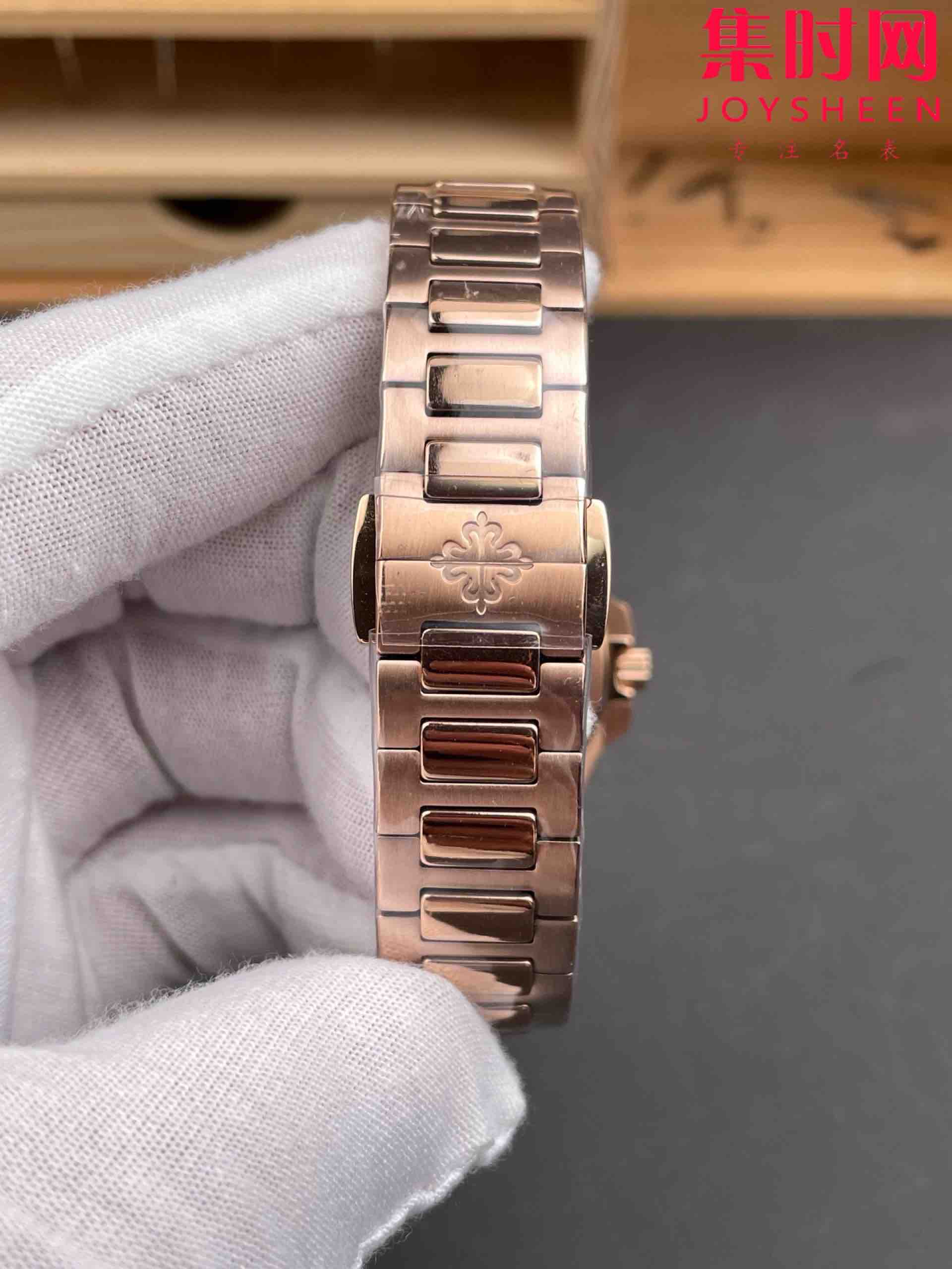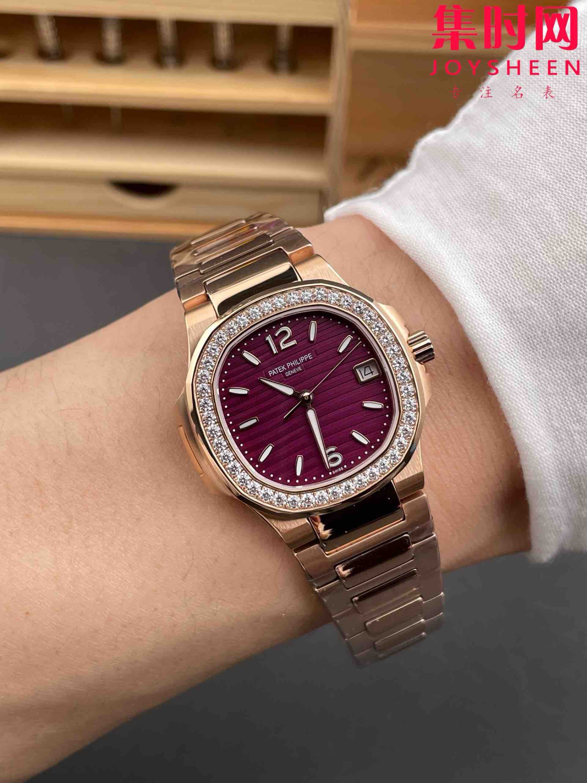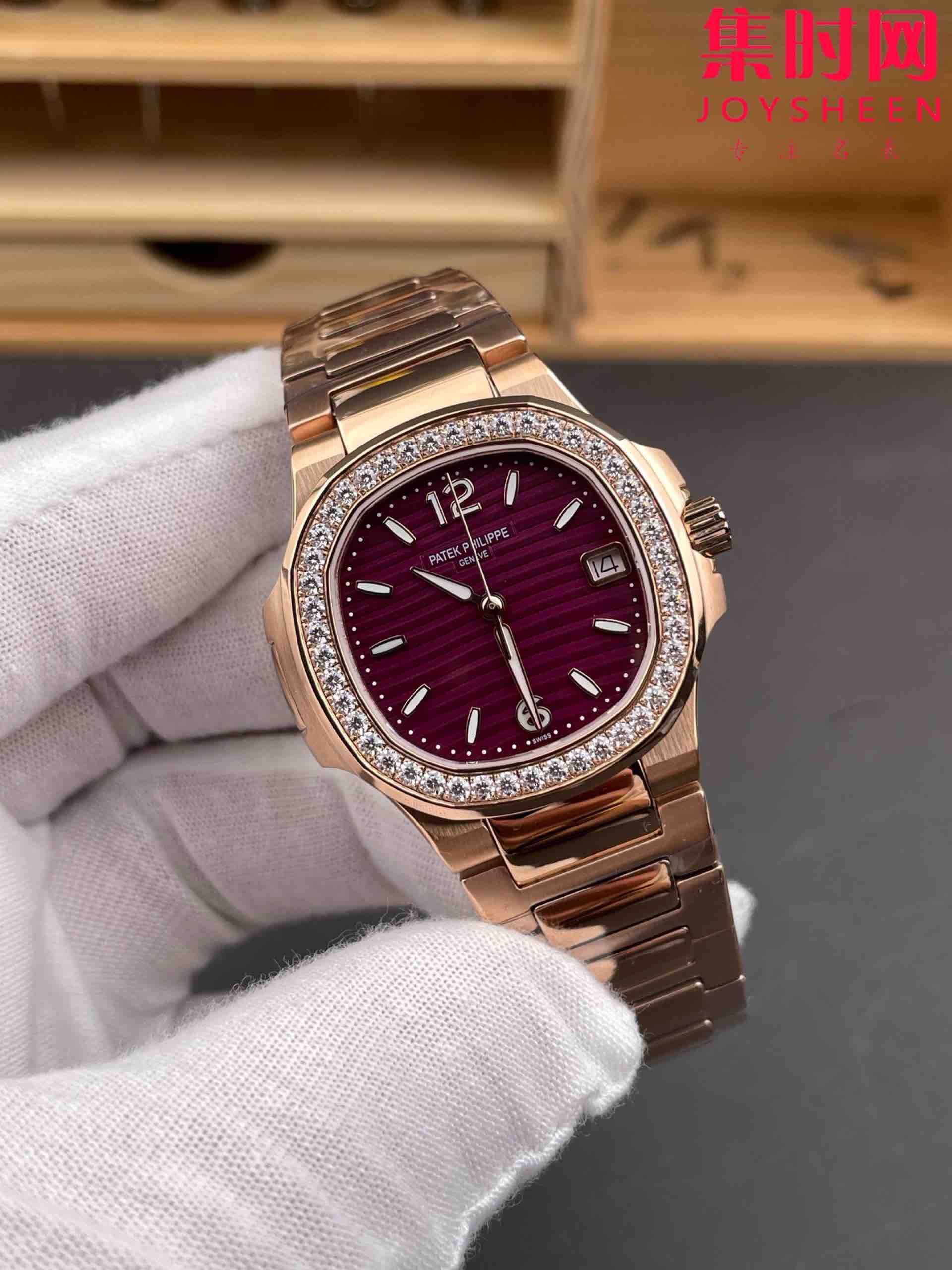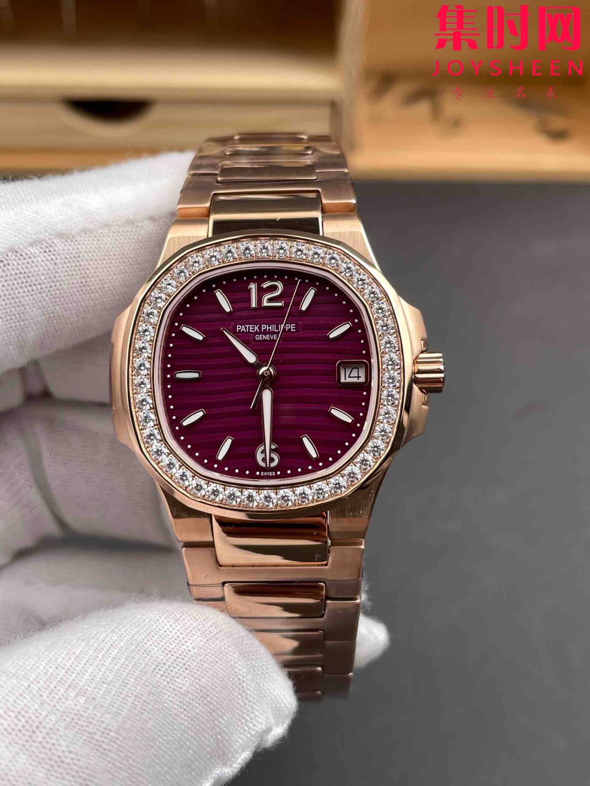 PP百达翡丽 重金打造 GR鹦鹉螺7010系列 玫瑰金紫盘钻圈 女士石英腕表 0误差0故障,自带或送礼再无后顾之忧。原版尺寸:32mm表盘直径,6.9mm厚度。搭载瑞士进口石英机芯。此款鹦鹉螺女款不仅拥有男表的优雅运动风格,还增加了几分柔美、使得女装腕表更加个性时尚,也是当下热门的PP女士腕表之一!表壳316L精钢镶钻46颗明亮式奥宝水钻,6.9mm厚度真正做到薄如蝉翼,整表真空颅内白金及玫瑰金双色任选,带来非凡触感与视觉享受,呈现璀璨光泽!