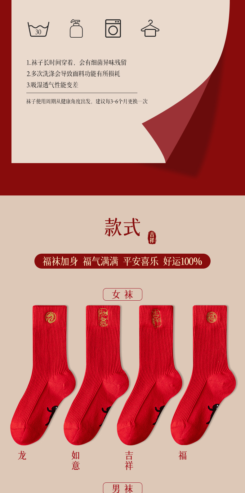 【抗寒保暖羊绒袜】刺绣龙年羊毛袜4双礼盒装 大红袜子本命年羊绒中筒袜 情侣福袜 商品图2
