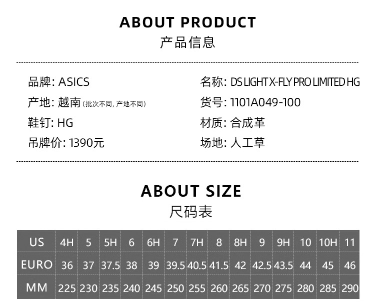 SFS 亚瑟士DS LIGHT X-FLY高端长钉HG天然草足球鞋1101A049-100