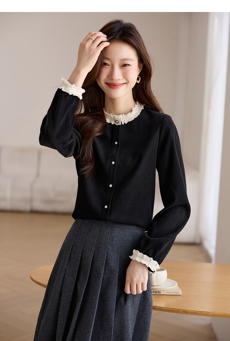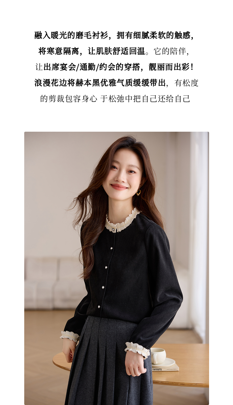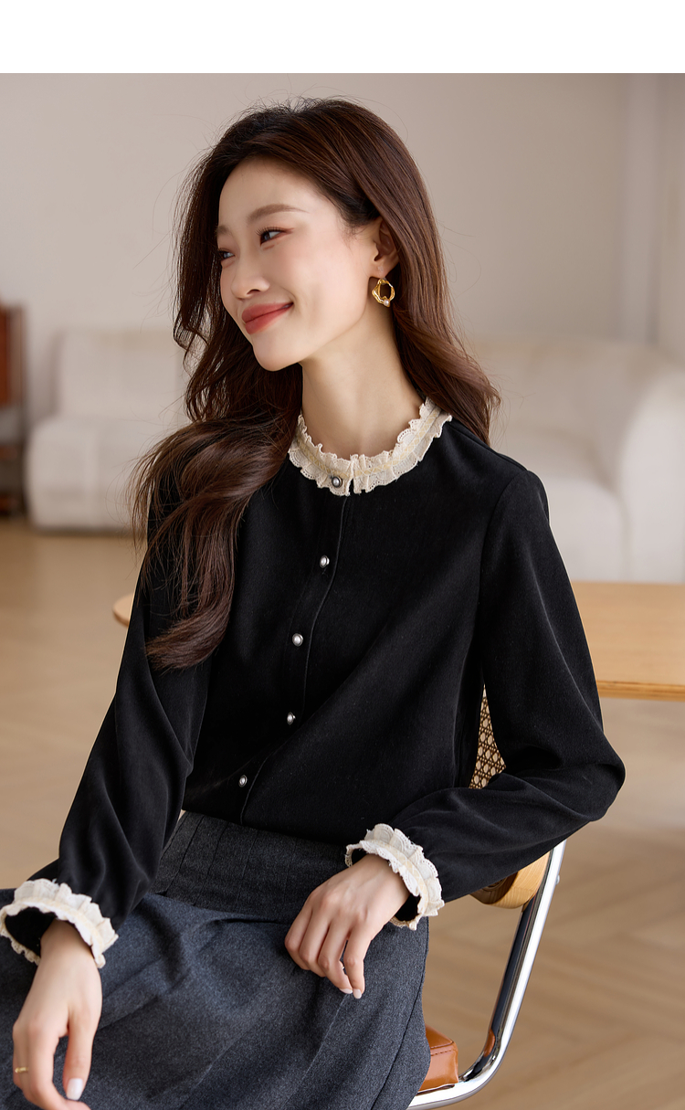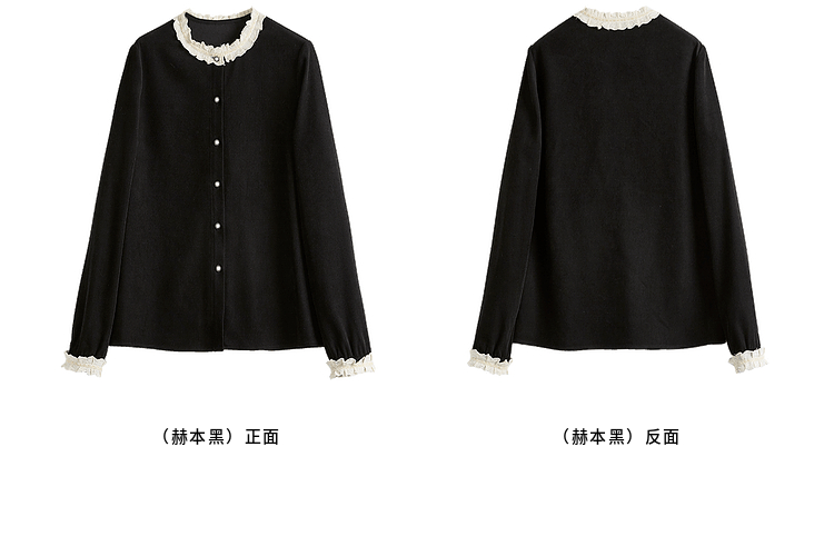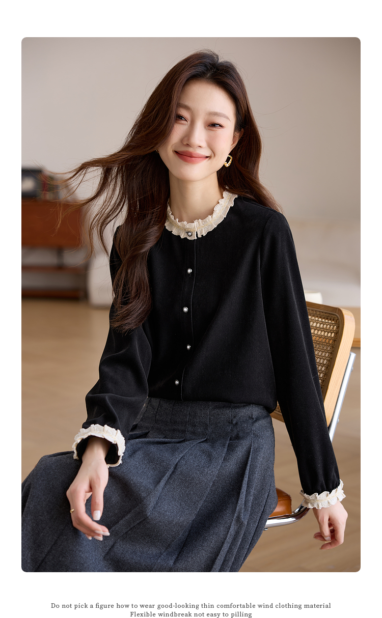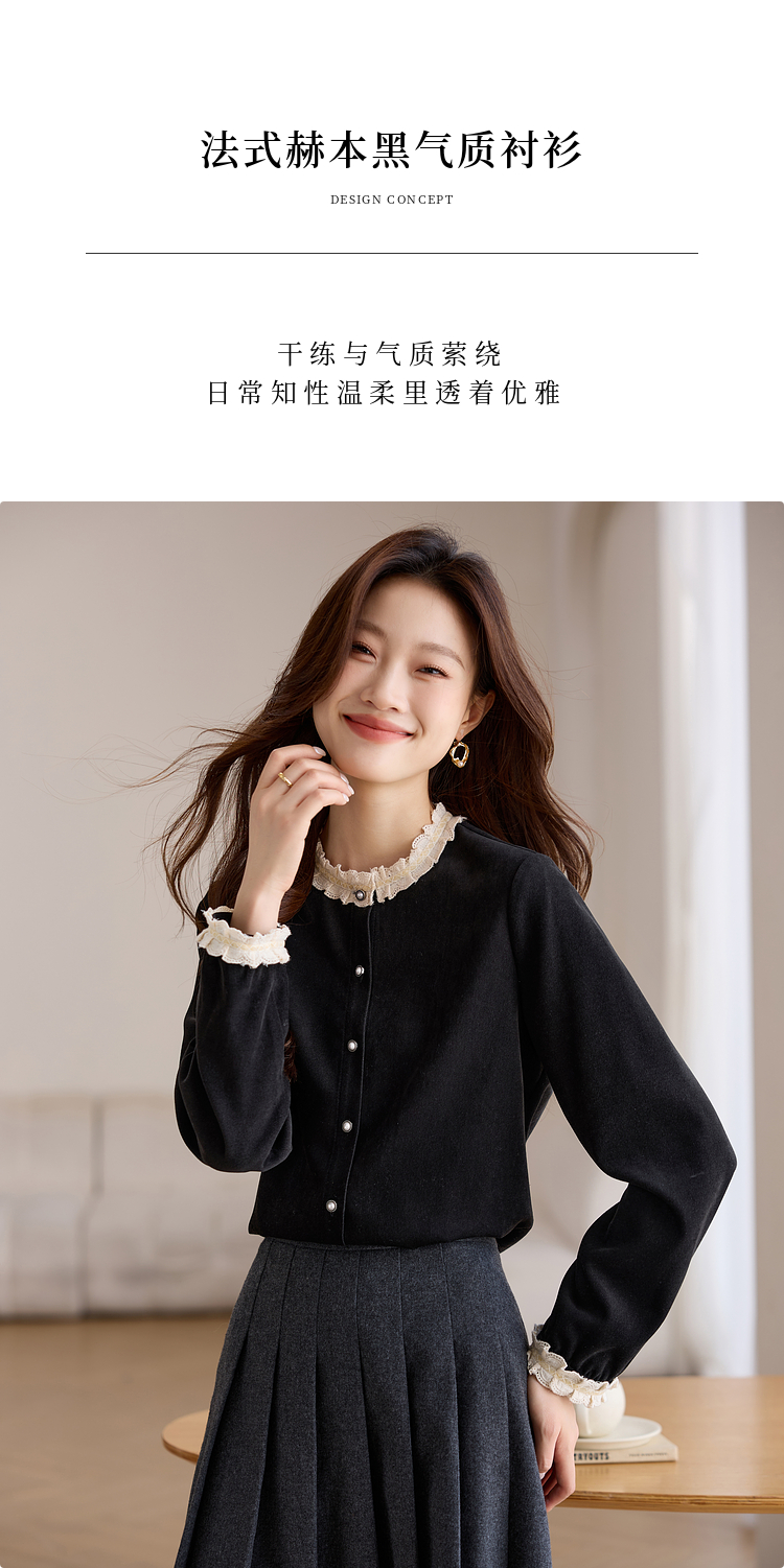 【1件75折】熙世界法式黑色丝绒衬衫女2025年秋冬新款赫本风长袖衬衣气质上衣
