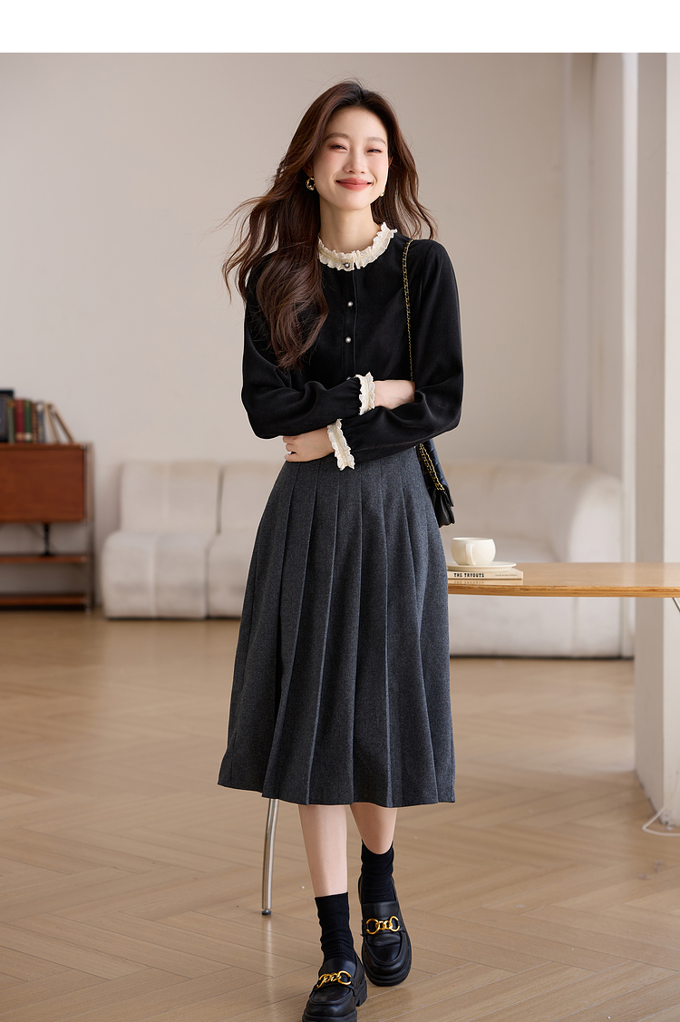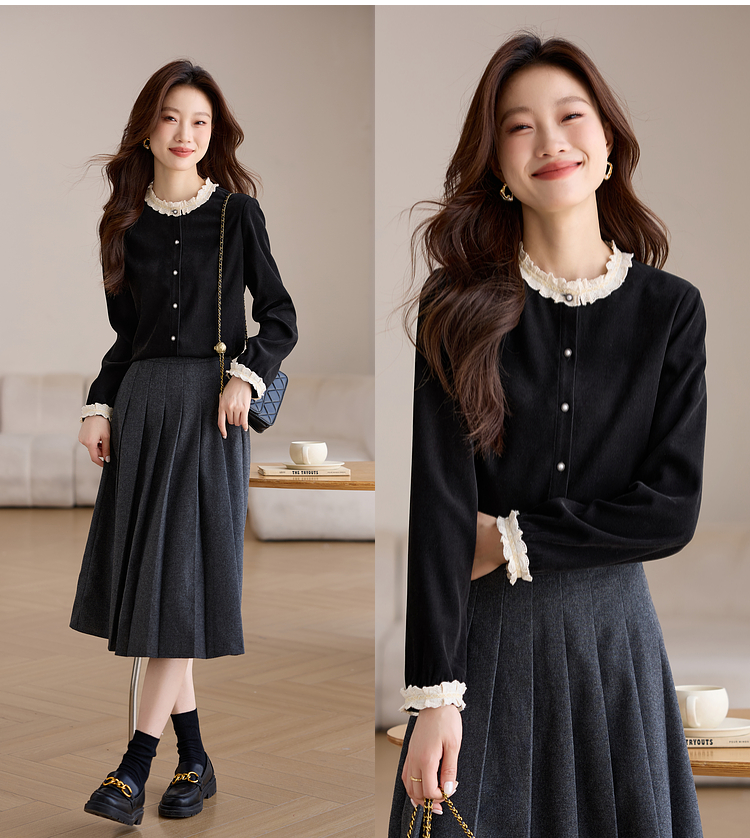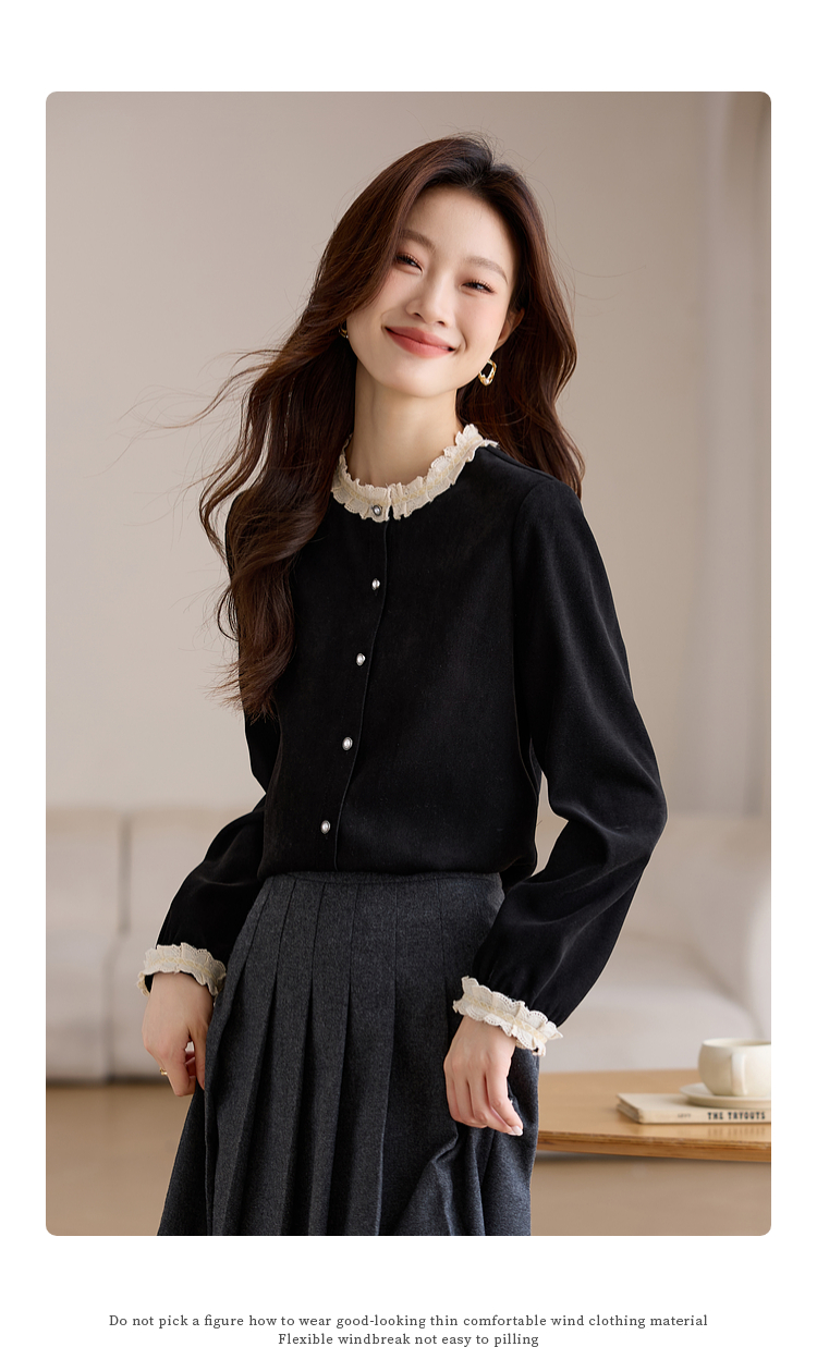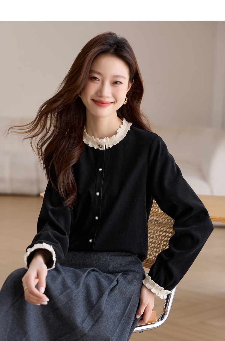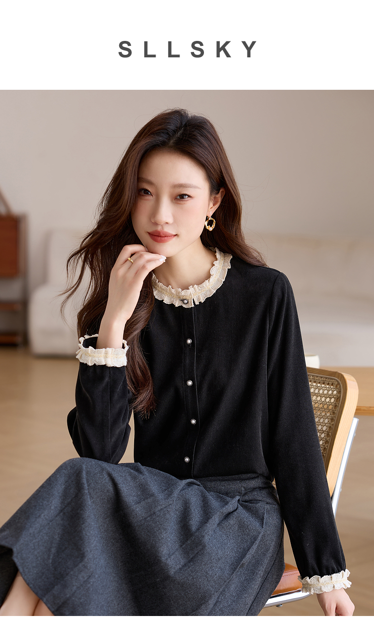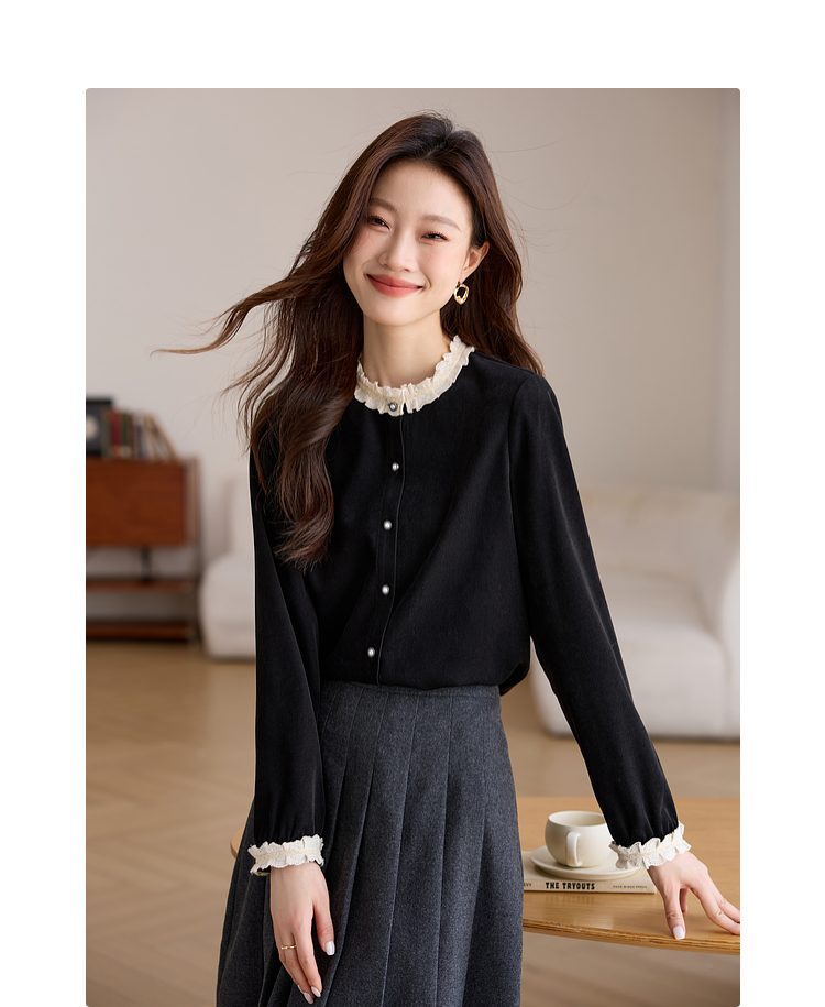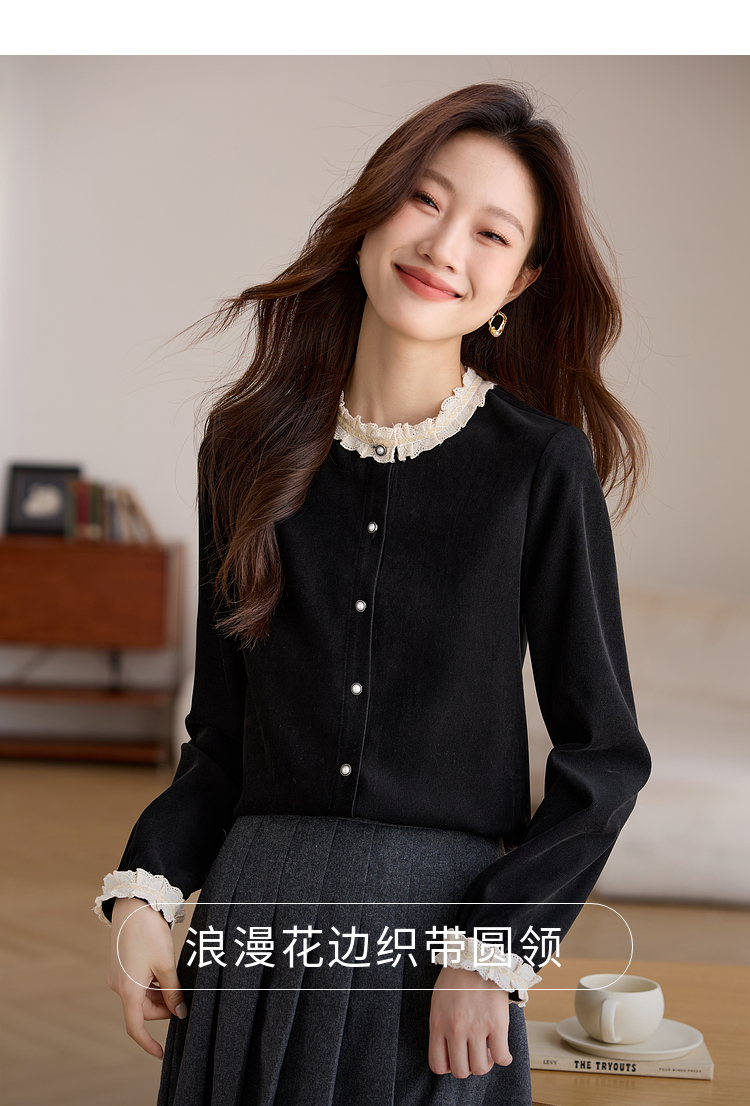 【1件75折】熙世界法式黑色丝绒衬衫女2025年秋冬新款赫本风长袖衬衣气质上衣