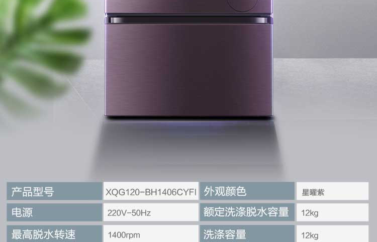 海信(Hisense) 12公斤 滚筒 洗衣机 星曜紫XQG120-BH1406CYFI