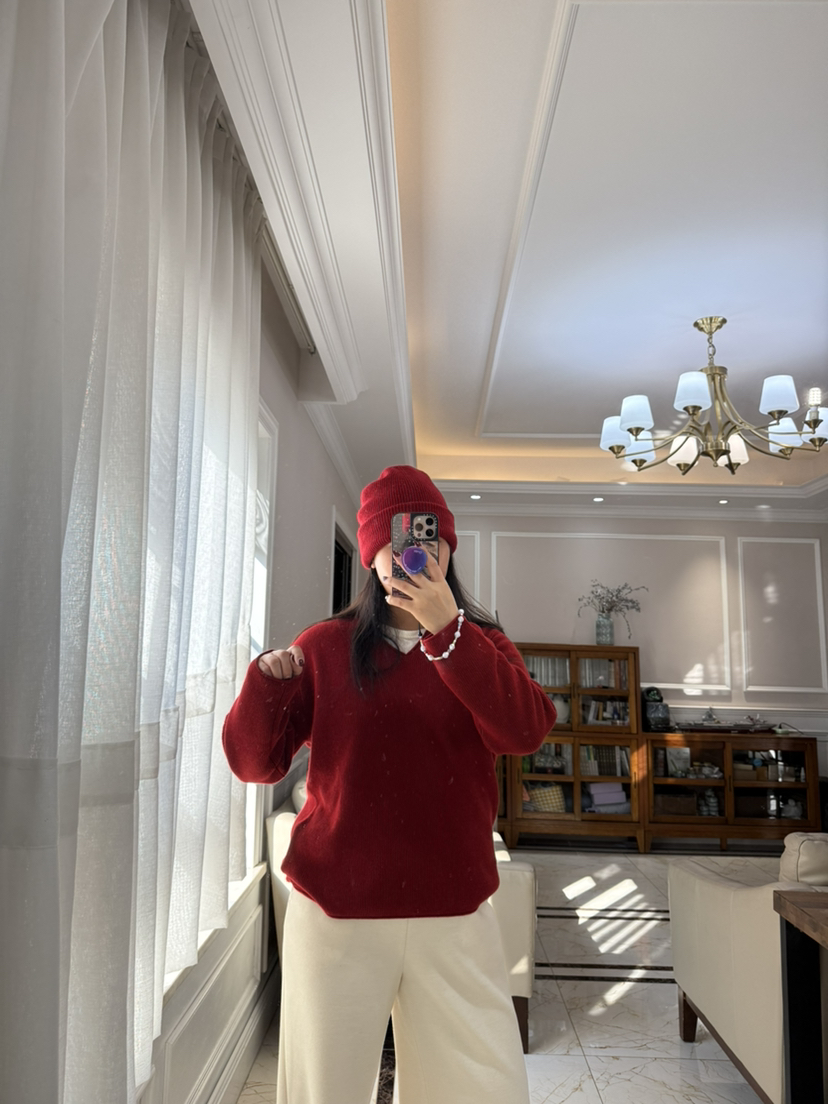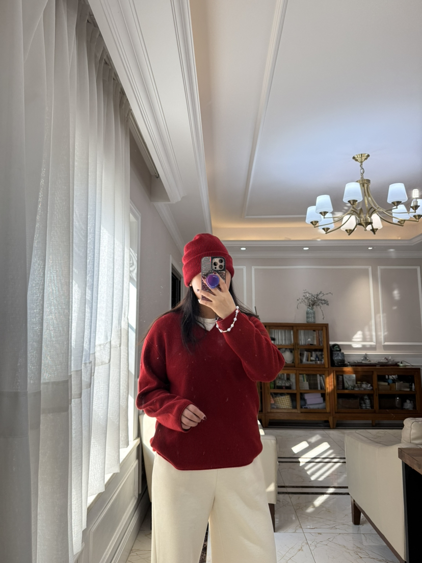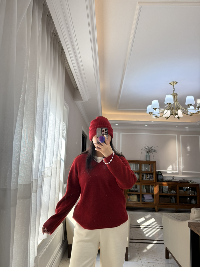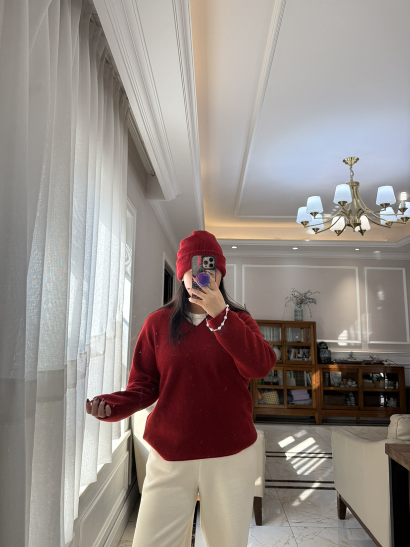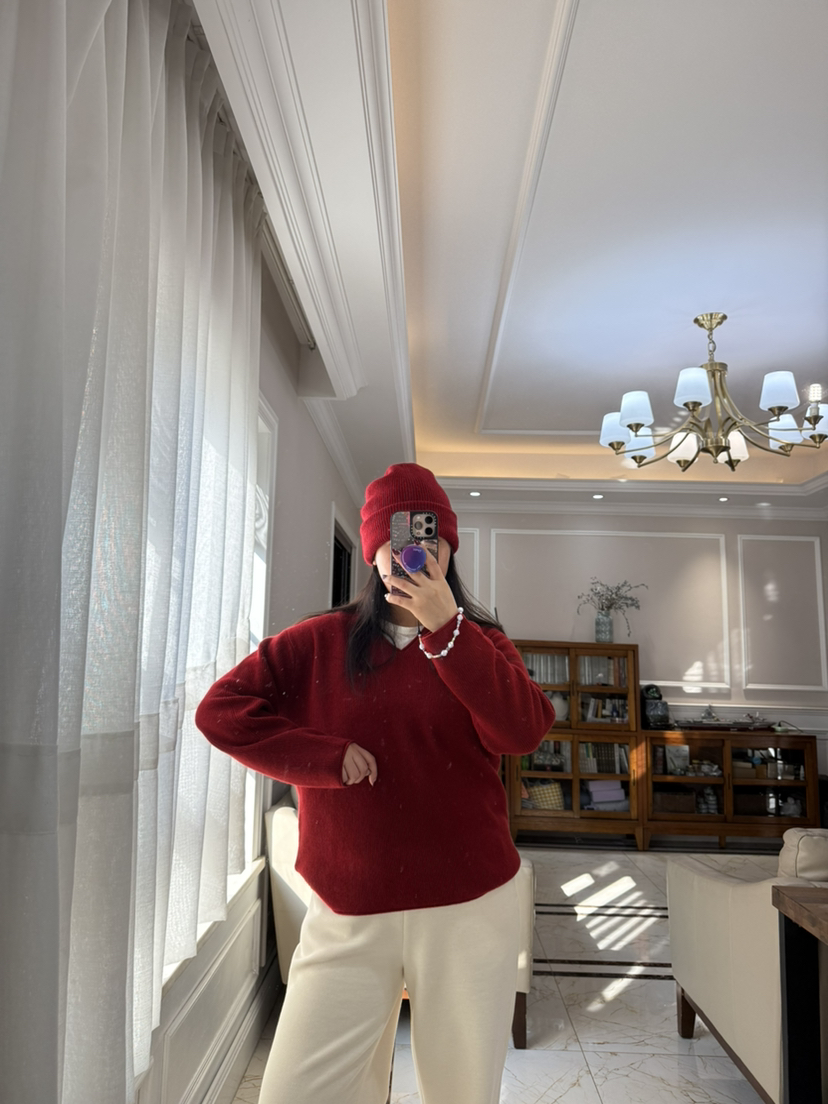 1227-5 渠道圆正 小禾 新年红 V领羊绒针织衫 我穿L